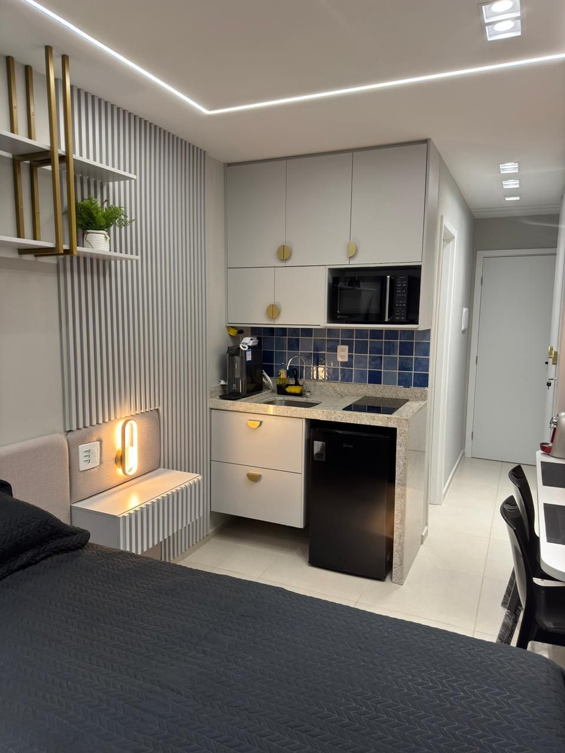 O flat comporta até 4 pessoas e dispõe de uma suíte bem equipada e decorada com uma cama de casal extremamente confortável e 2 camas auxiliares no ambiente acolhedor que garante noites de descanso. Cozinha totalmente equipada com frigobar, cooktop microondas, air fryer, sanduicheira, cafeteira para você realizar suas refeições.