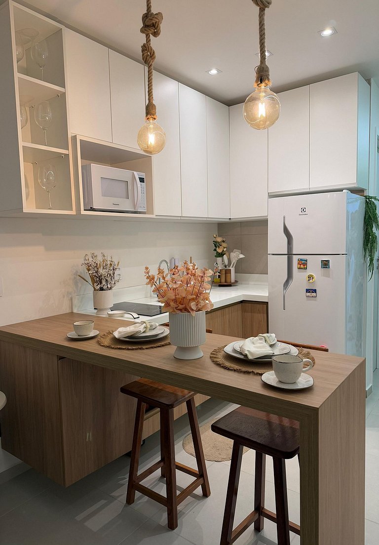 Nosso flat é novo, fino e muito bem decorado e comporta bem até 2 pessoas com 1 cama de casal extremamente confortável, o ambiente bem iluminados e aconchegante, todos equipados com roupas de cama de qualidade e ar-condicionado para seu máximo conforto. A cozinha totalmente equipada com todos os itens necessários para você realizar qualquer refeição.