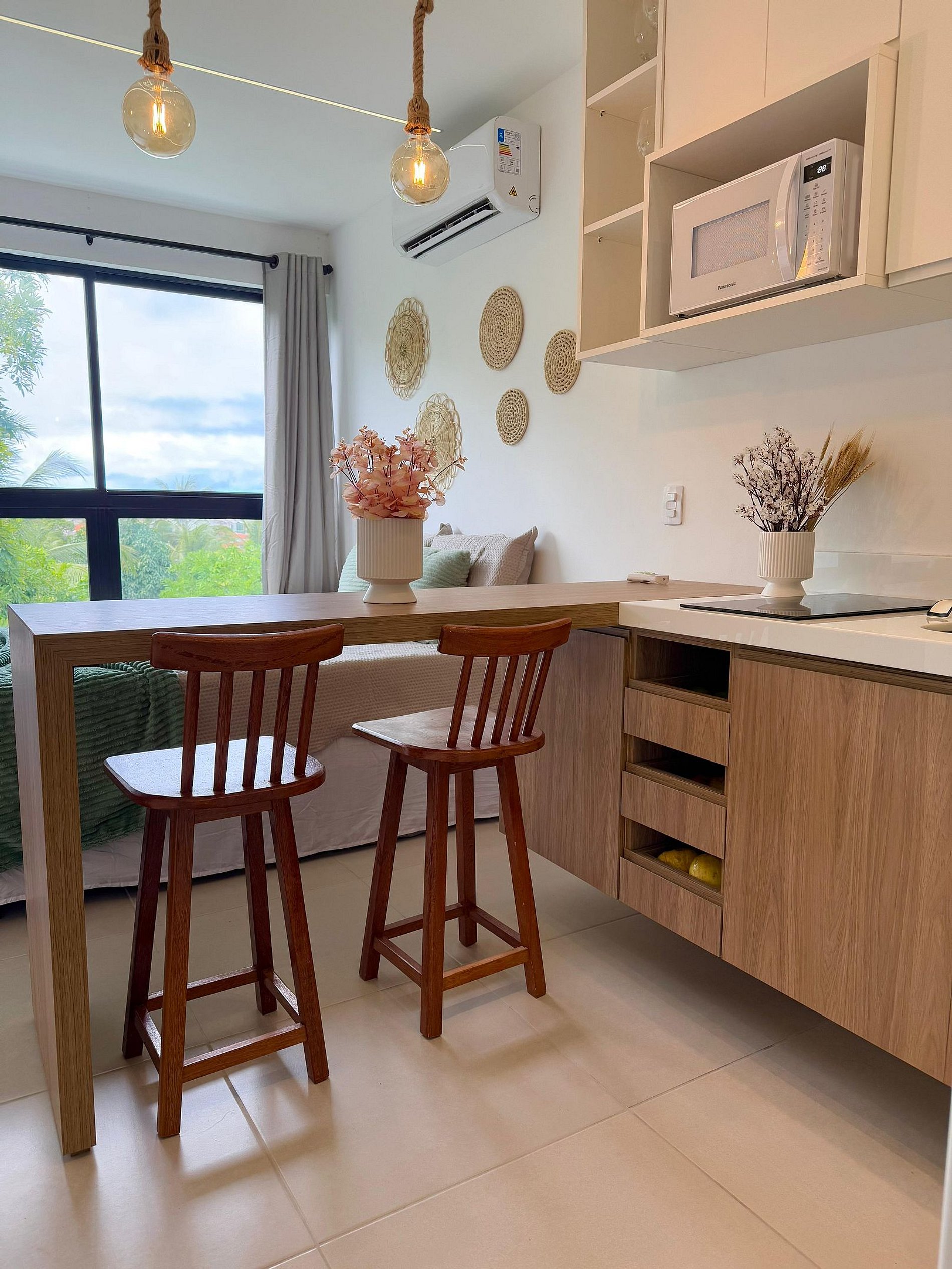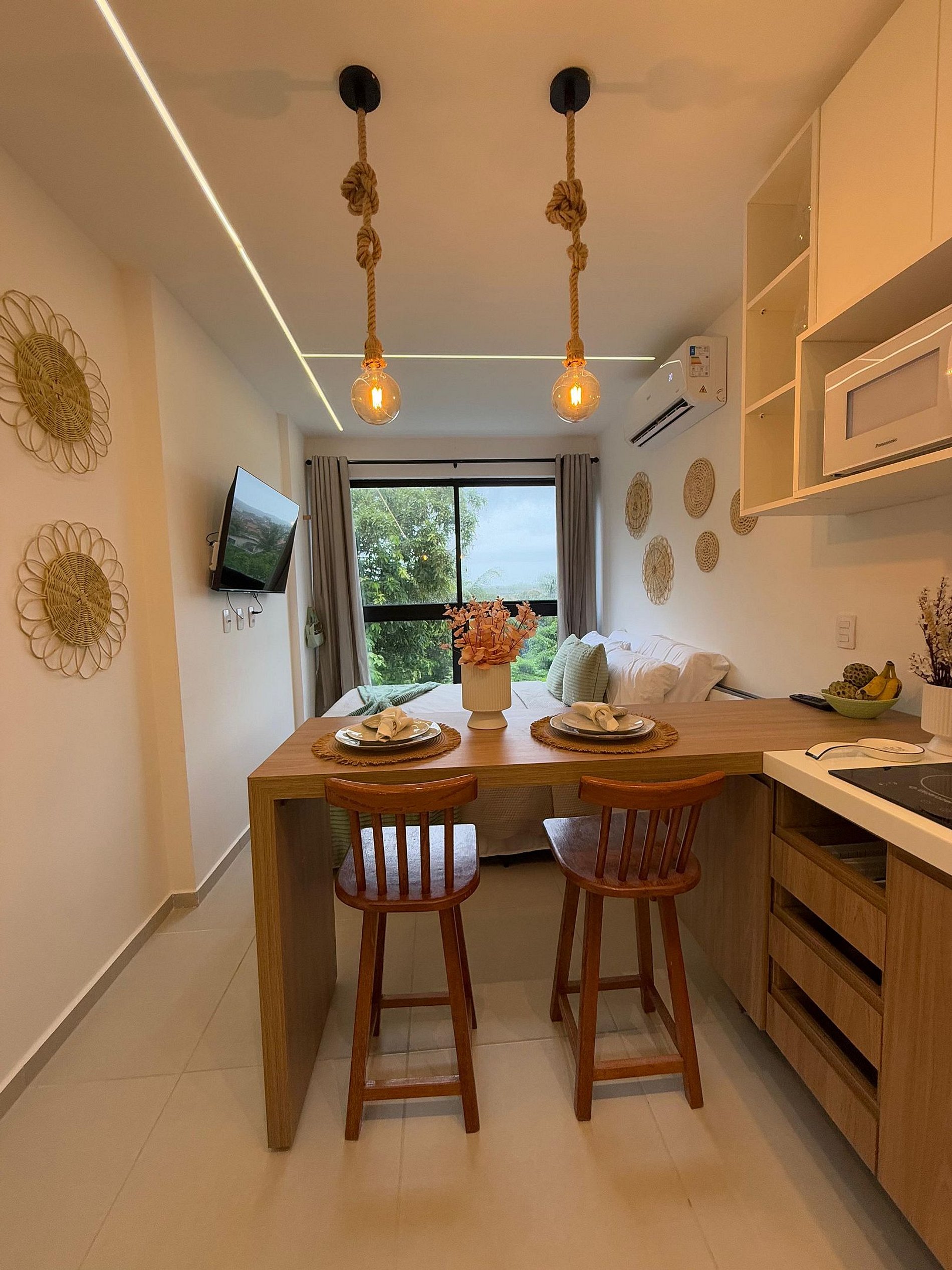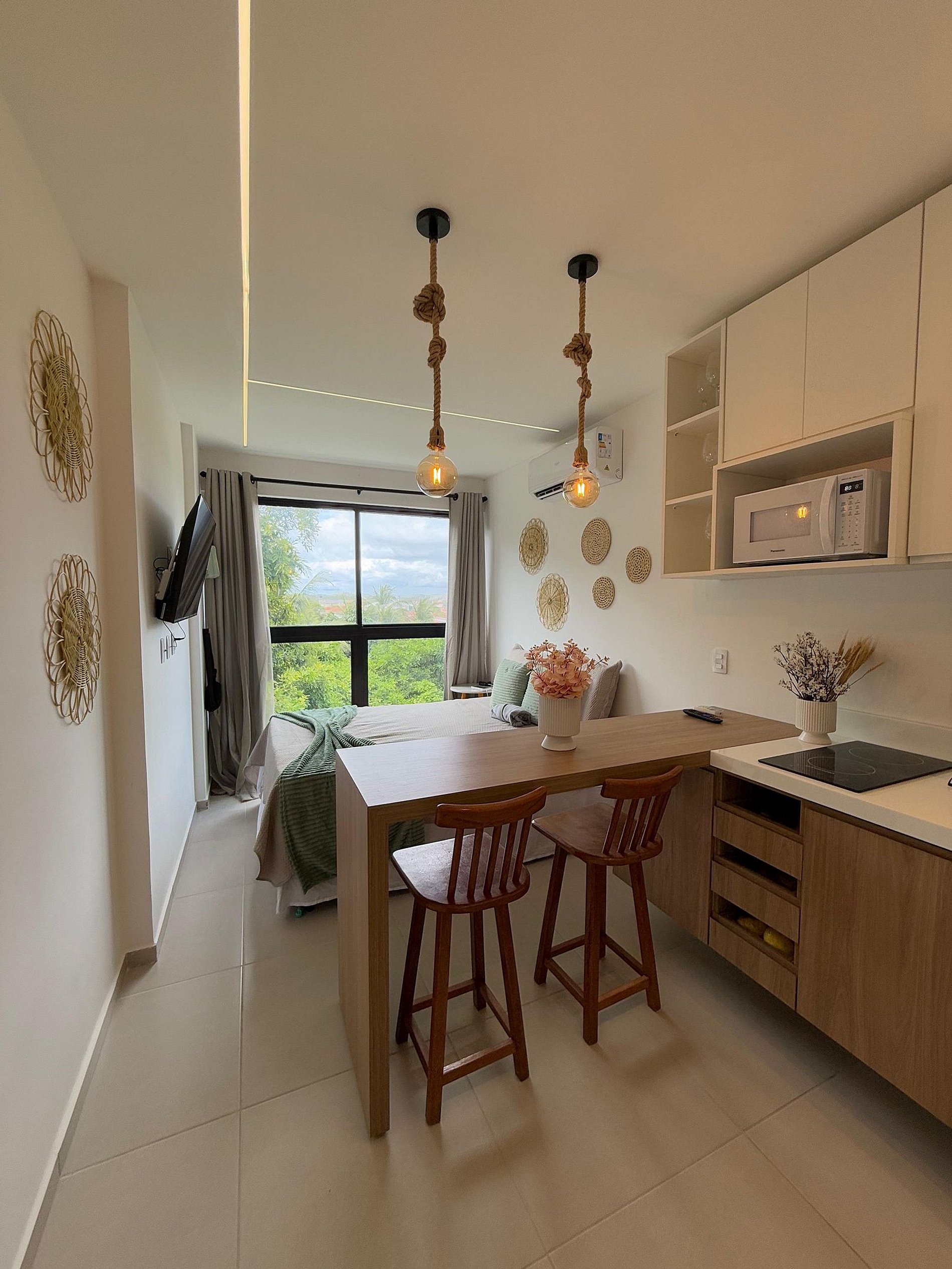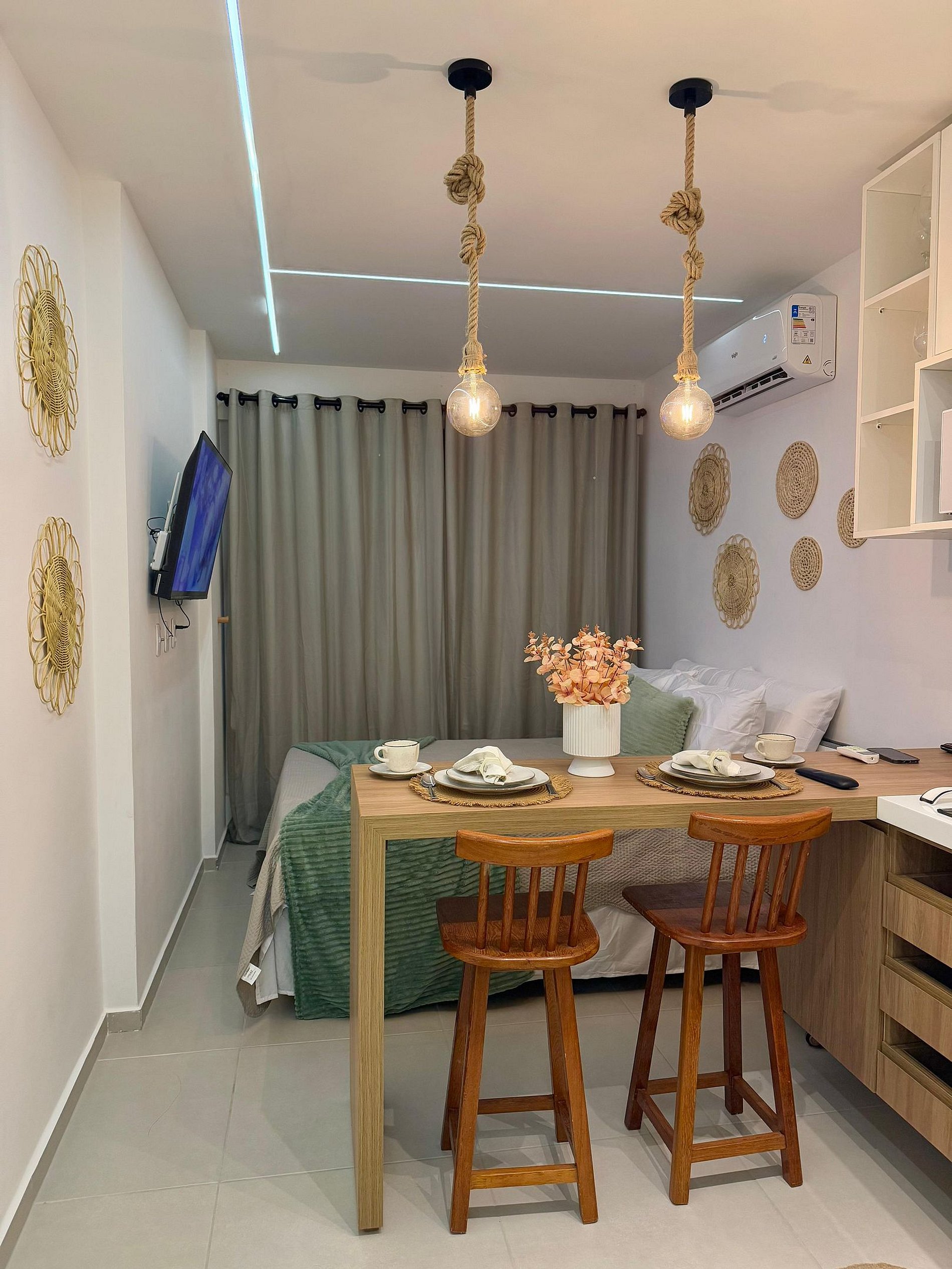 Nosso flat conta com apartamentos bem equipados, projetados para proporcionar a você o máximo de conforto. Cada unidade possui ar-condicionado, Wi-Fi gratuito, TV de tela plana e uma cozinha compacta, facilitando sua estadia. Descanse em camas confortáveis e aproveite os detalhes que tornam seu refúgio ainda mais especial.