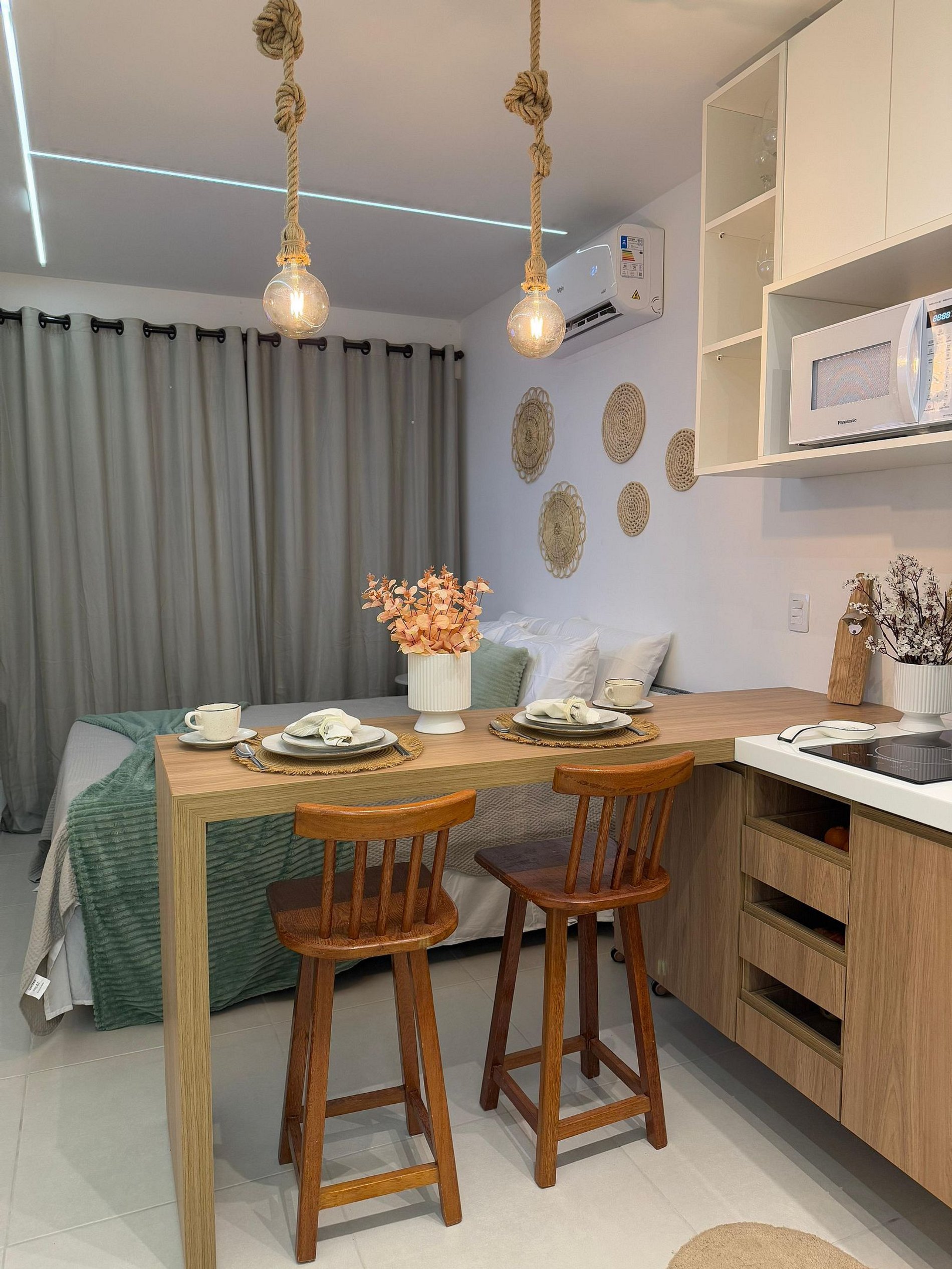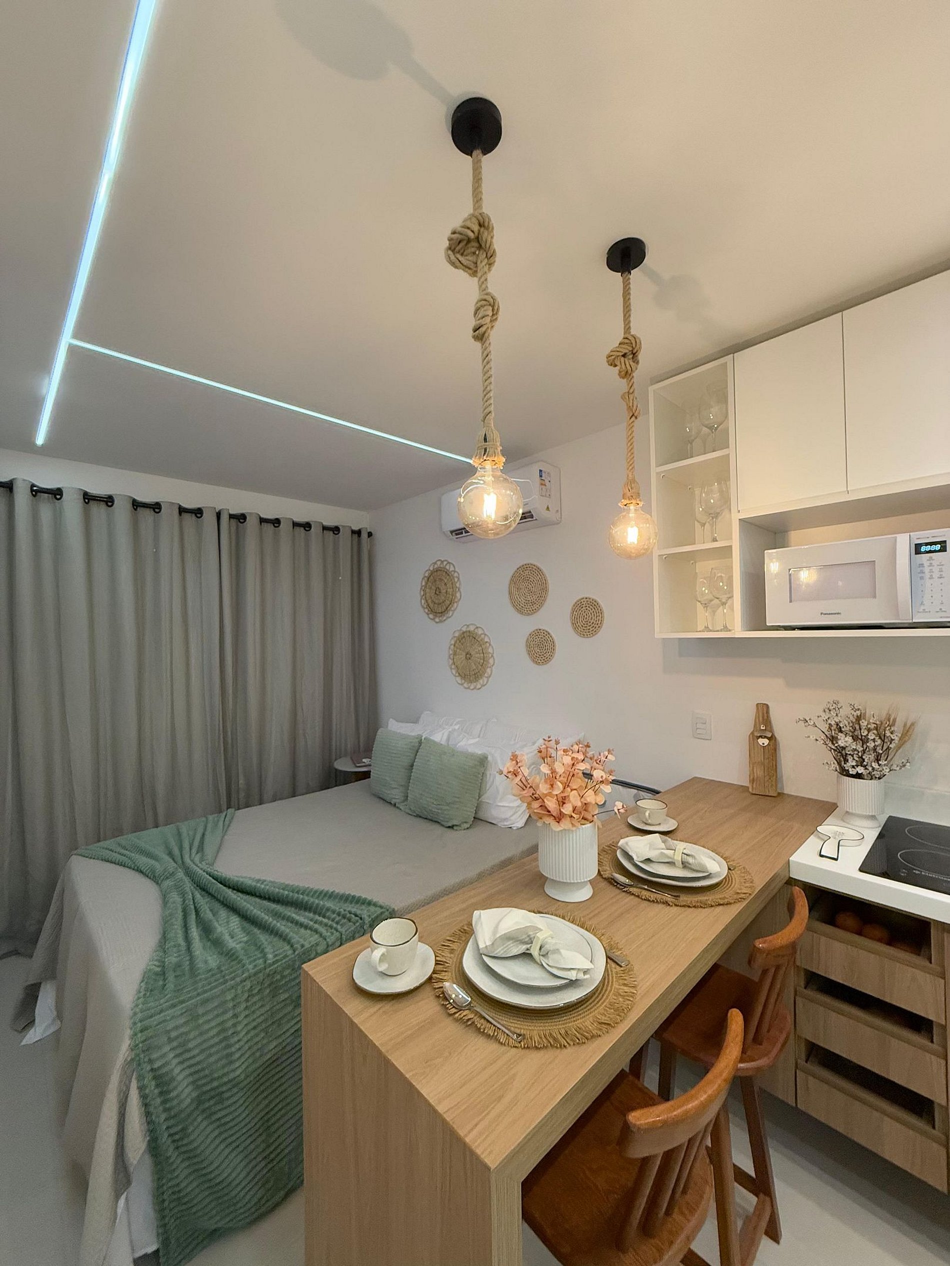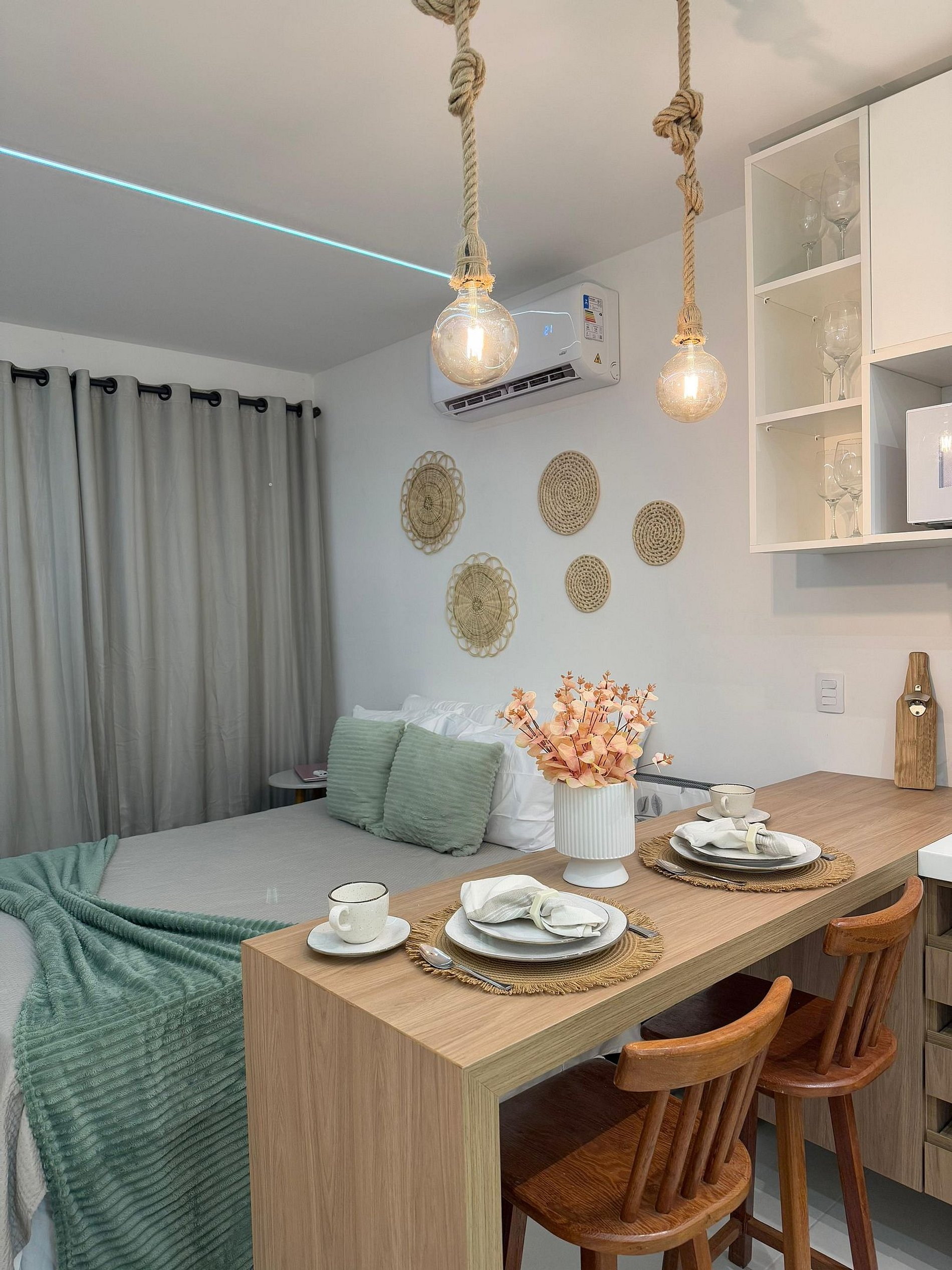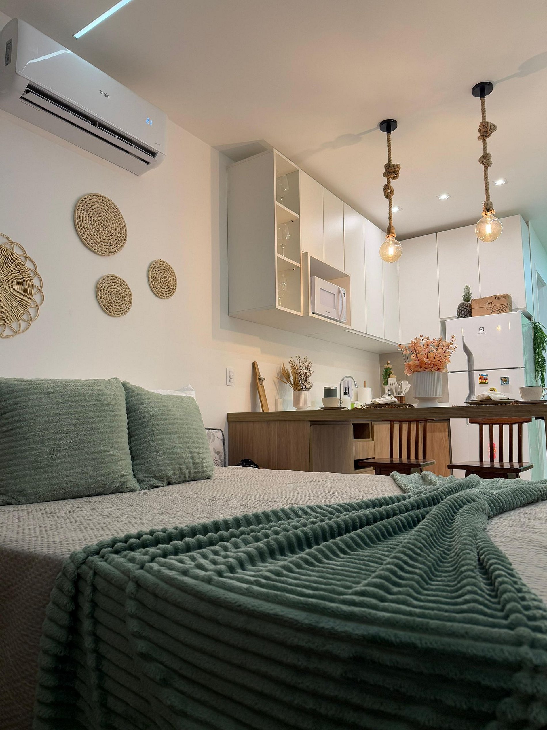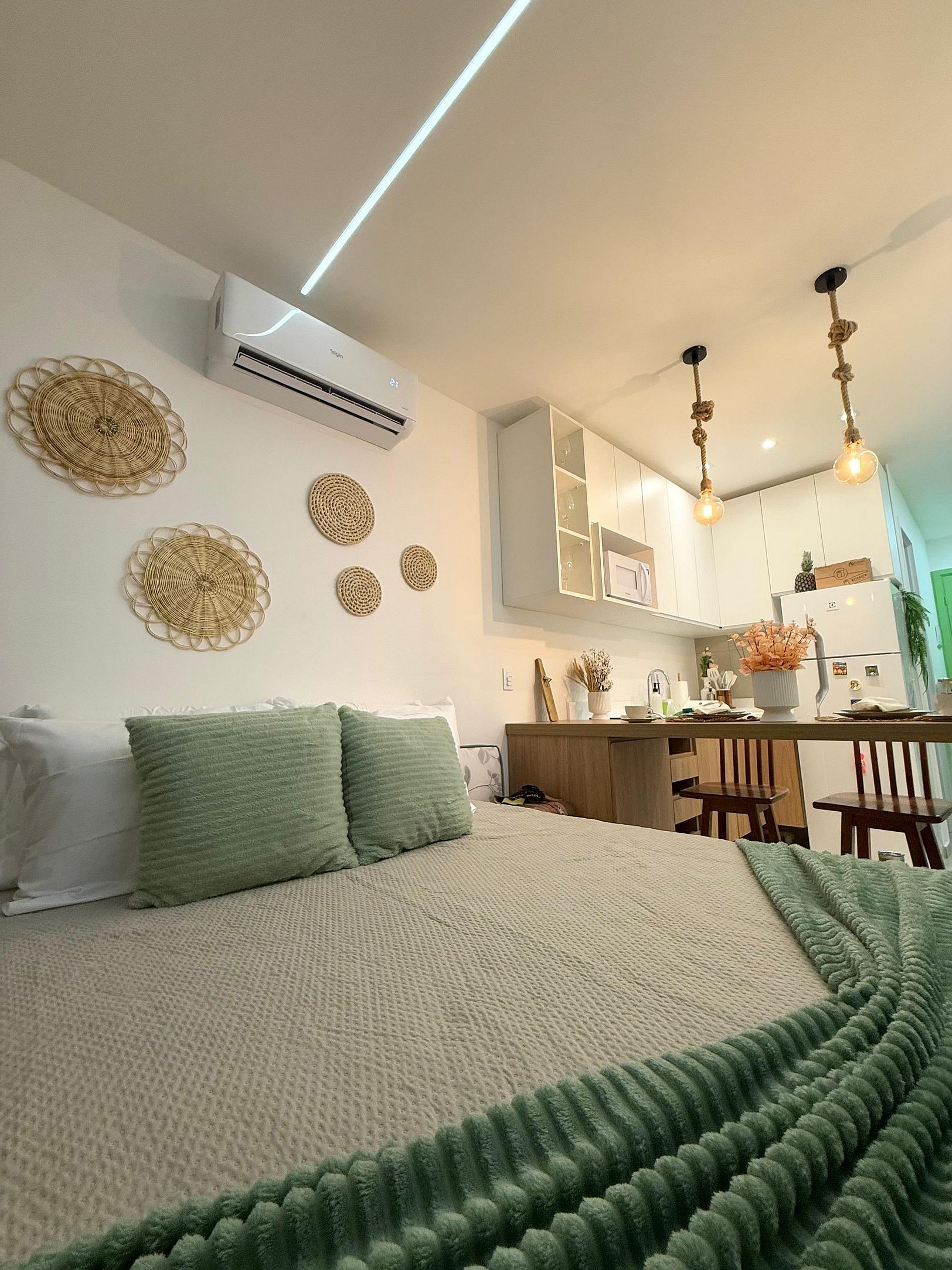 Nosso flat é novo, fino e muito bem decorado e comporta bem até 2 pessoas com 1 cama de casal extremamente confortável, o ambiente bem iluminados e aconchegante, todos equipados com roupas de cama de qualidade e ar-condicionado para seu máximo conforto. A cozinha totalmente equipada com todos os itens necessários para você realizar qualquer refeição.