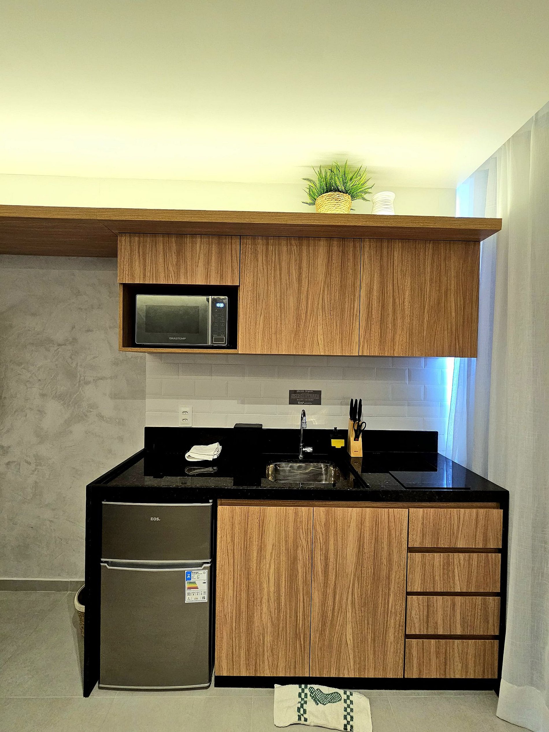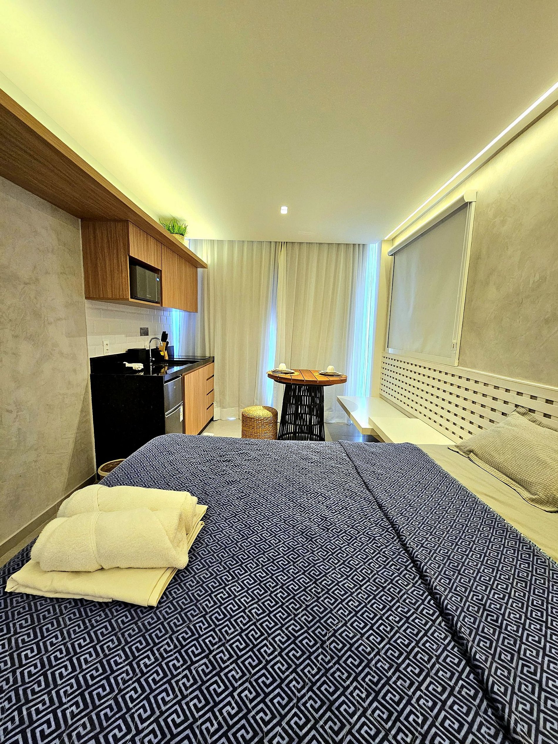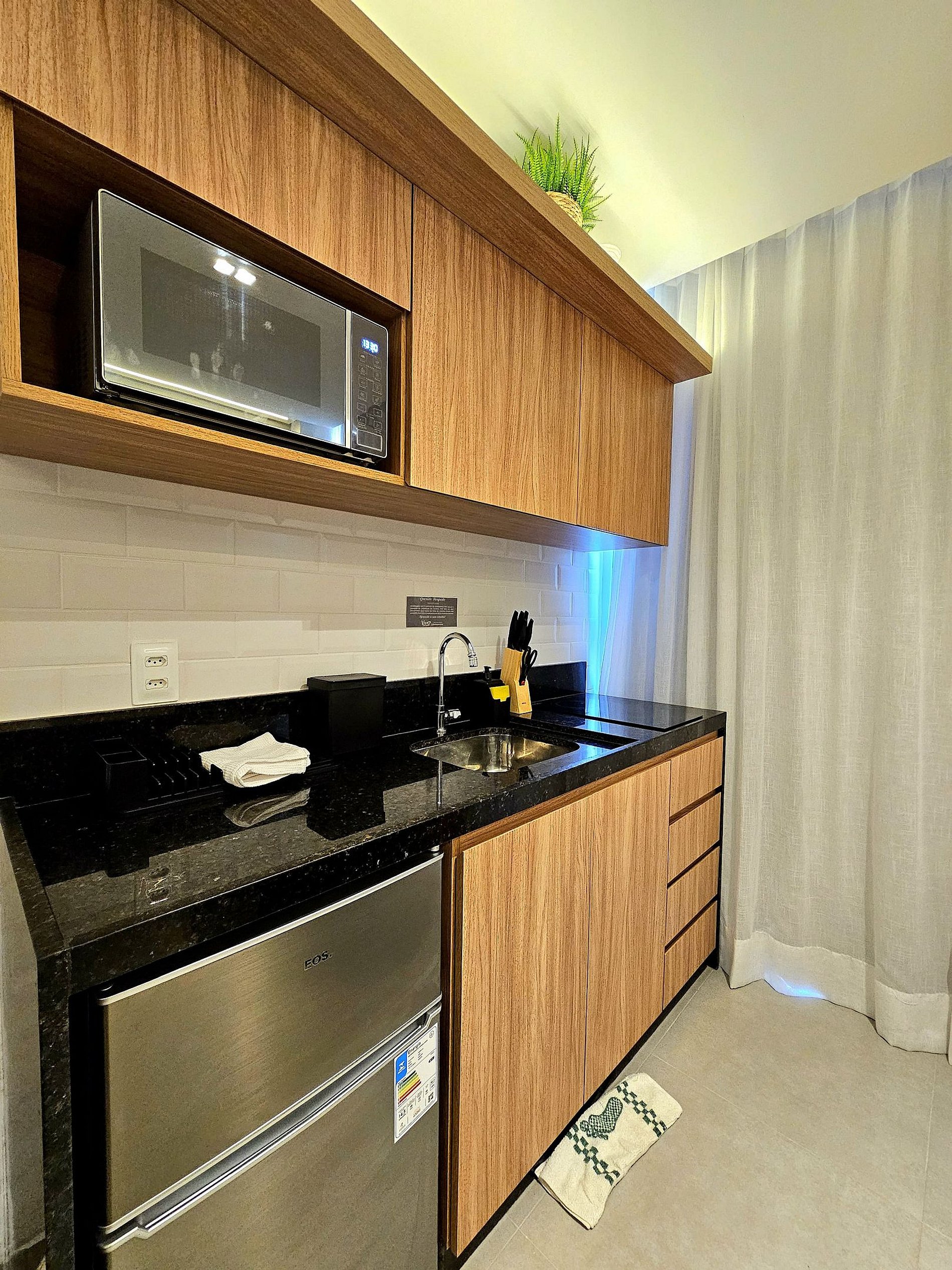 Nosso flat foi cuidadosamente pensado para proporcionar uma experiência inesquecível. Comporta bem até 3 pessoas com uma cama de casal extremamente confortável, uma cama auxiliar e uma cozinha equipada com cooktop, microondas, frigobar, cafeteira, sanduicheira, liquidificador para você realizar qualquer refeição.