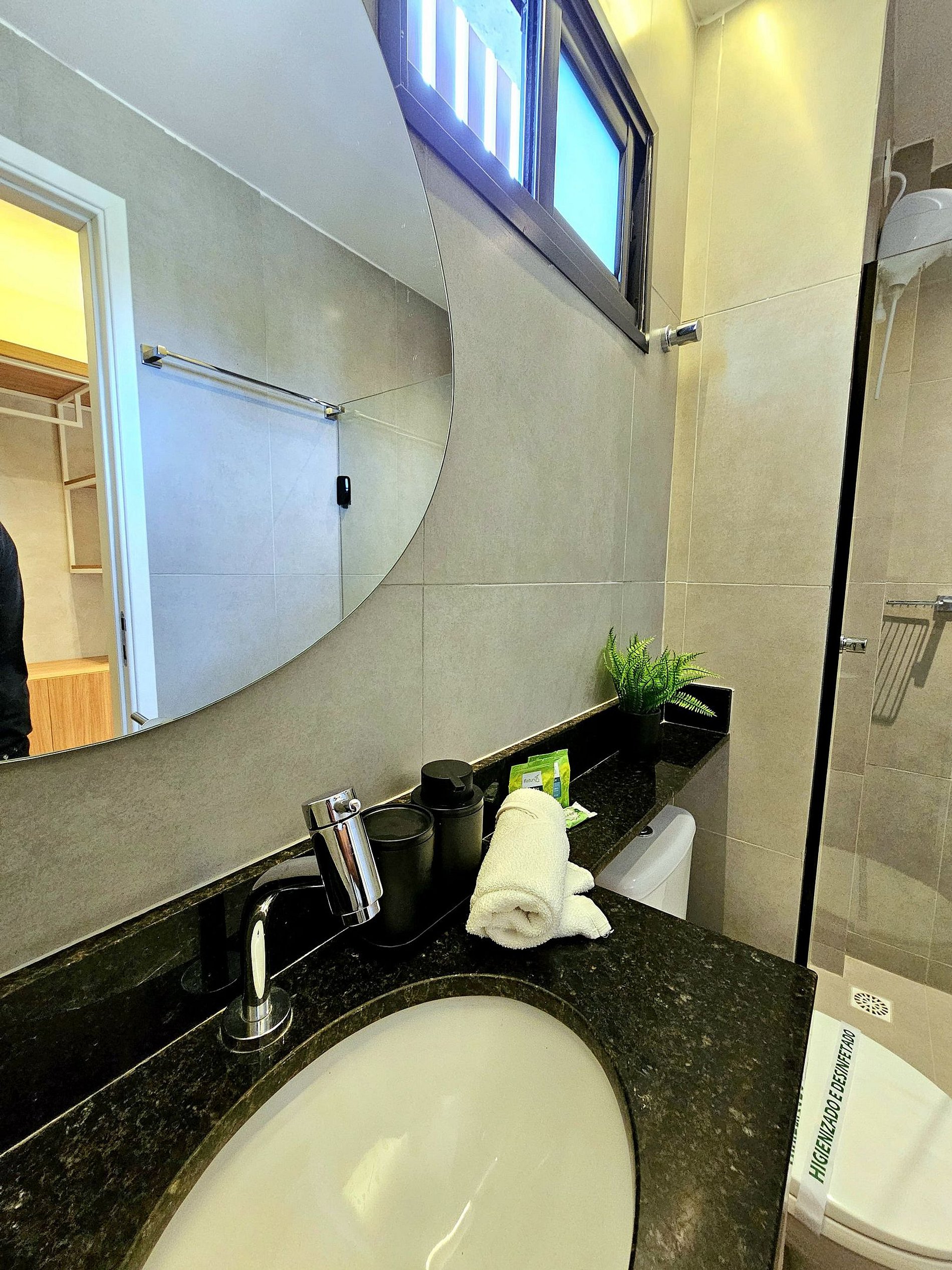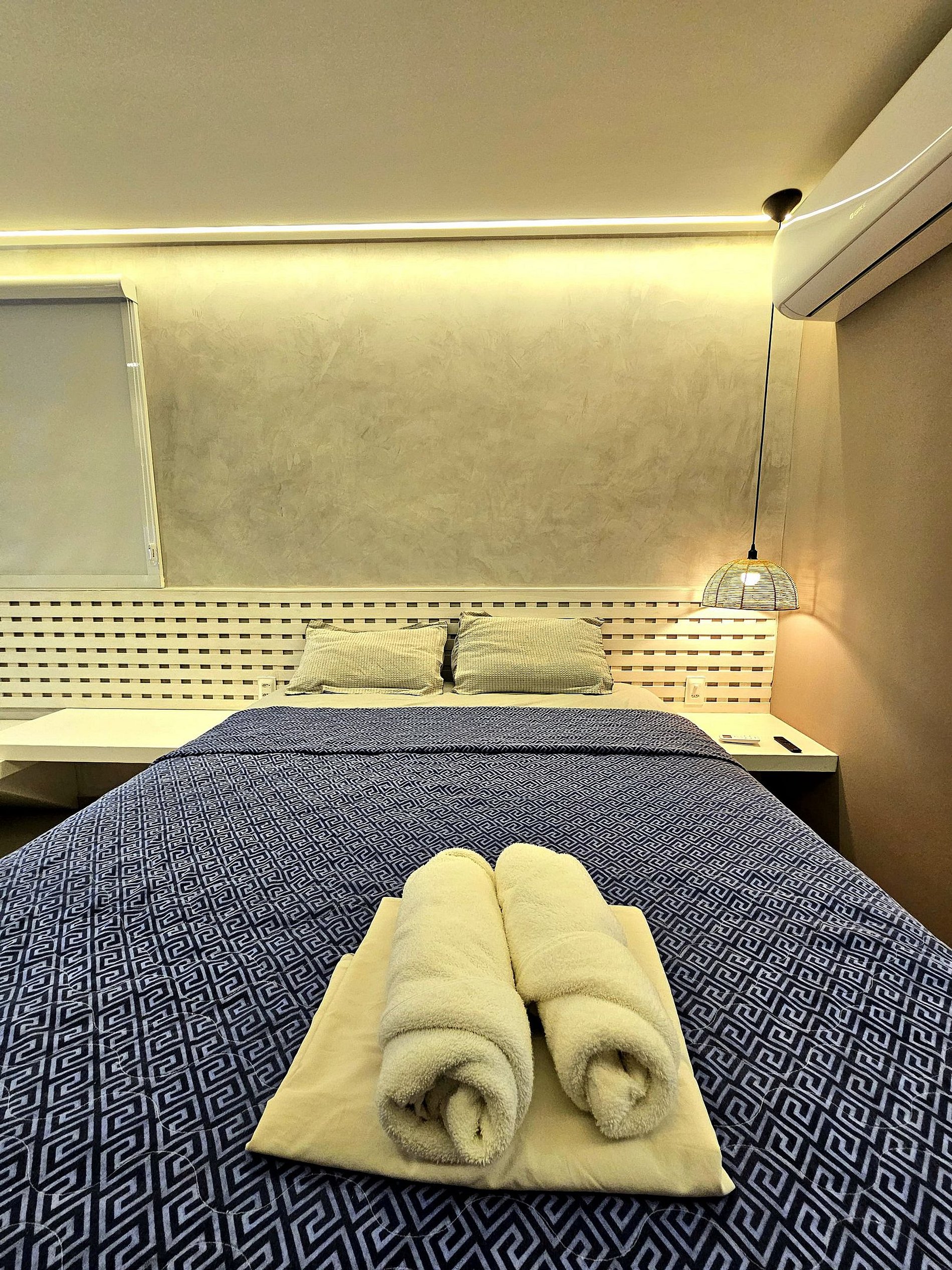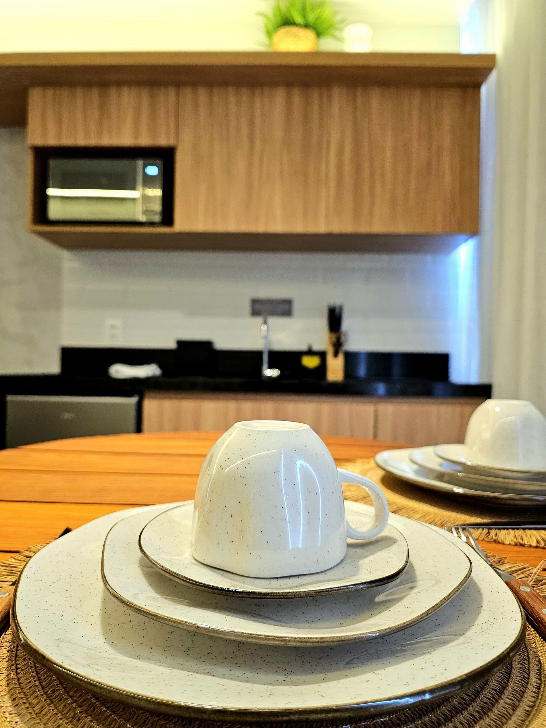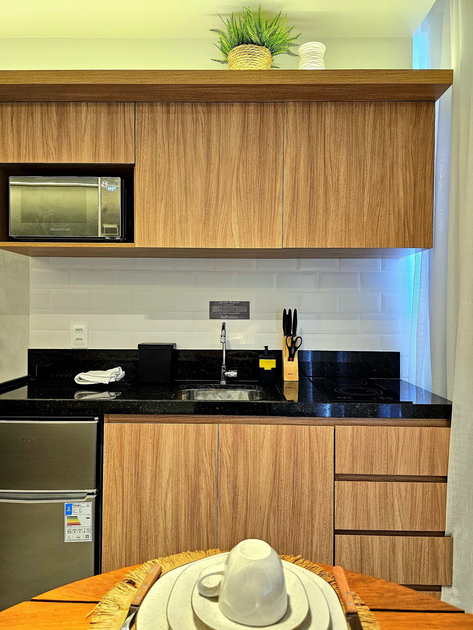 Nosso flat foi cuidadosamente pensado para proporcionar uma experiência inesquecível. Comporta bem até 3 pessoas com uma cama de casal extremamente confortável, uma cama auxiliar e uma cozinha equipada com cooktop, microondas, frigobar, cafeteira, sanduicheira, liquidificador para você realizar qualquer refeição.