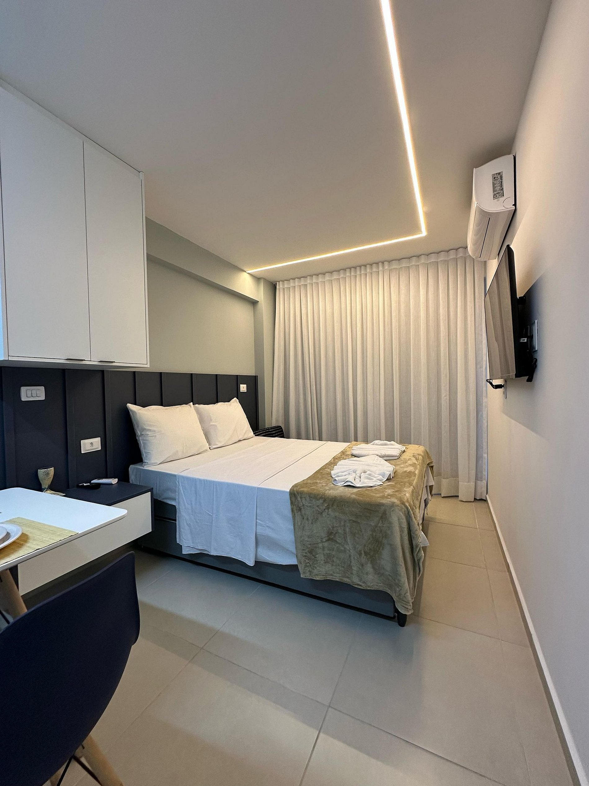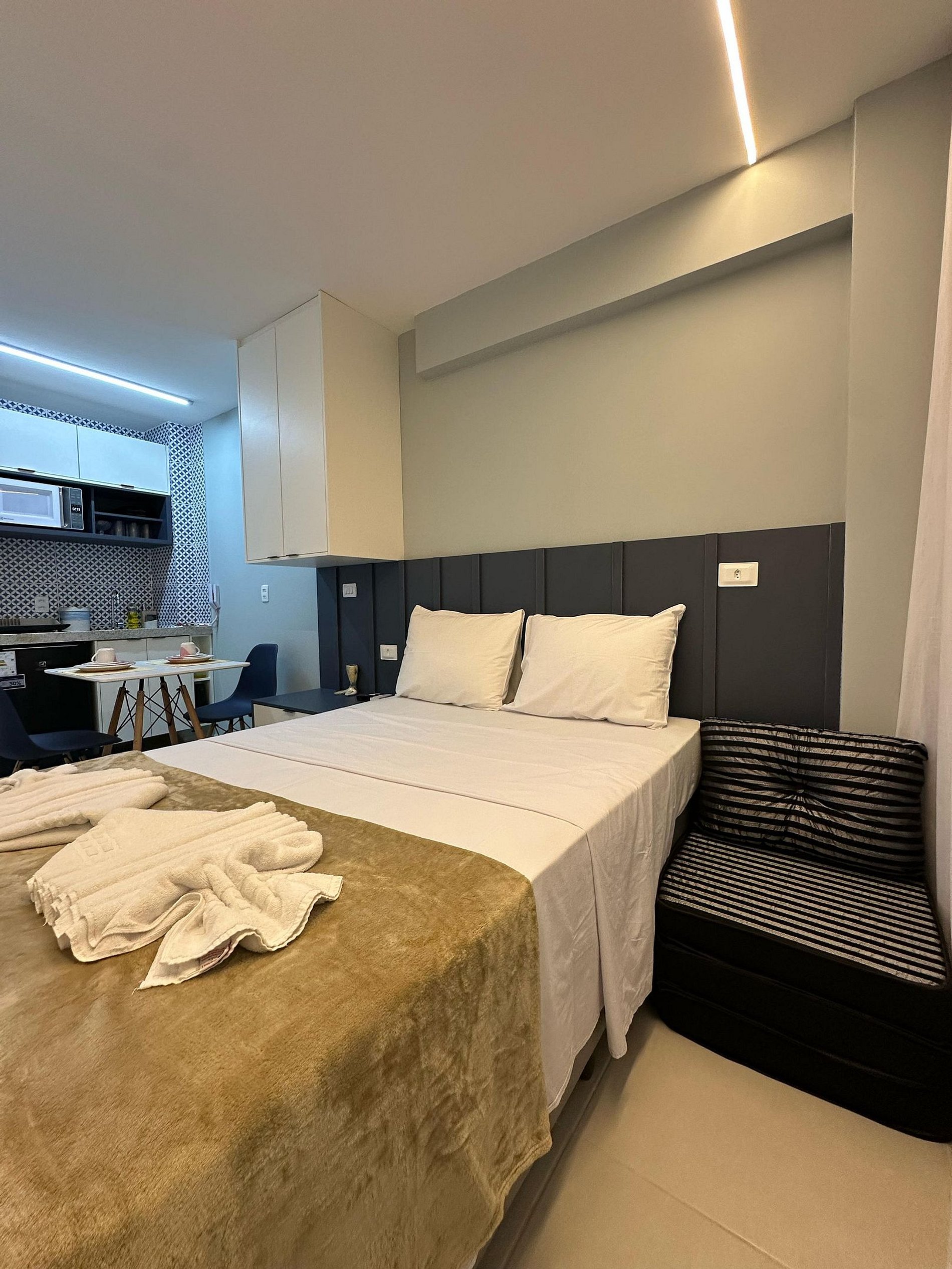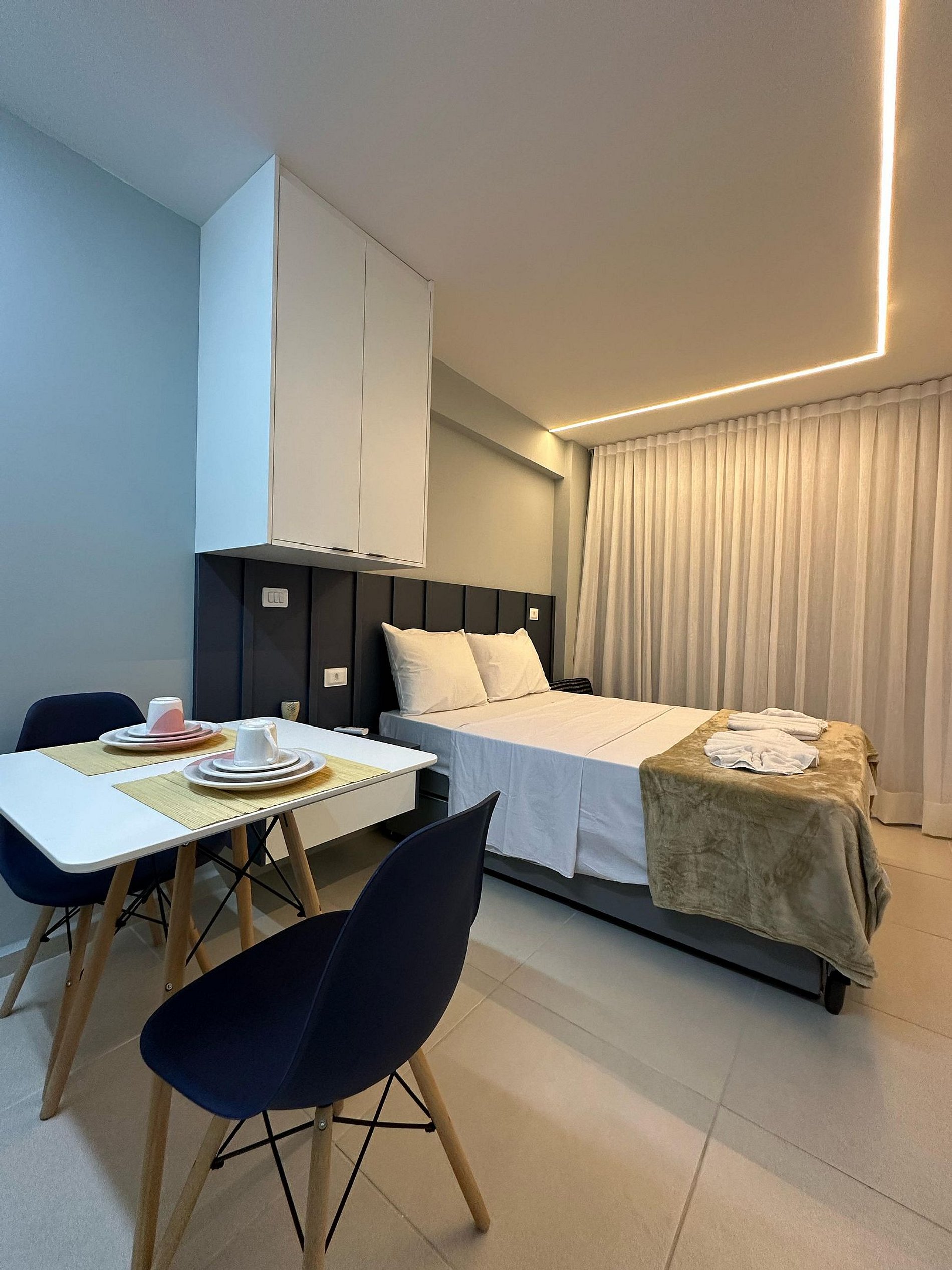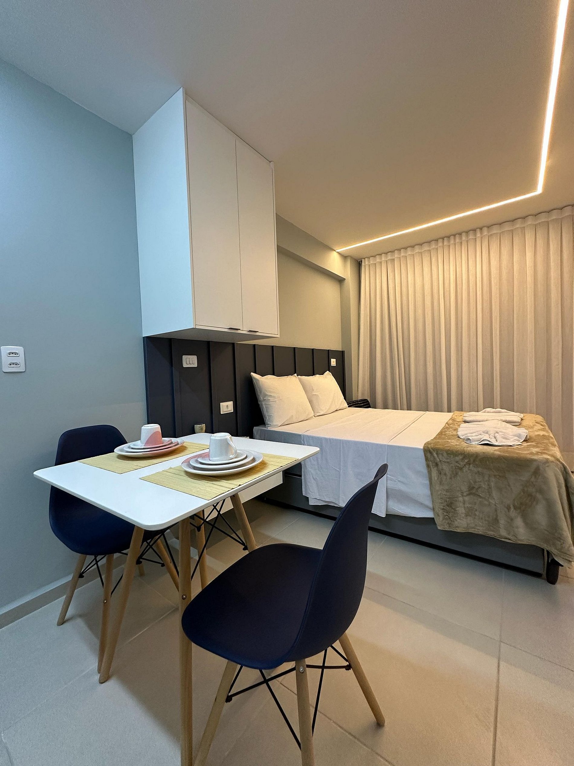 Nosso flat conta com apartamentos bem equipados, projetados para proporcionar a você o máximo de conforto. Cada unidade possui ar-condicionado, Wi-Fi gratuito, TV de tela plana e uma cozinha compacta, facilitando sua estadia. Descanse em camas confortáveis e aproveite os detalhes que tornam seu refúgio ainda mais especial.