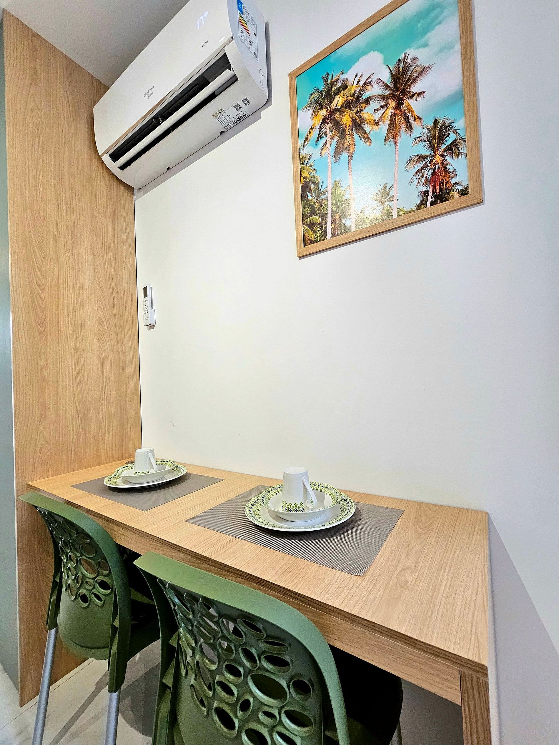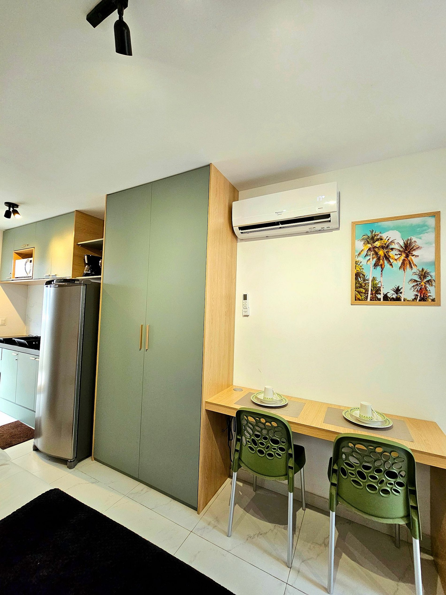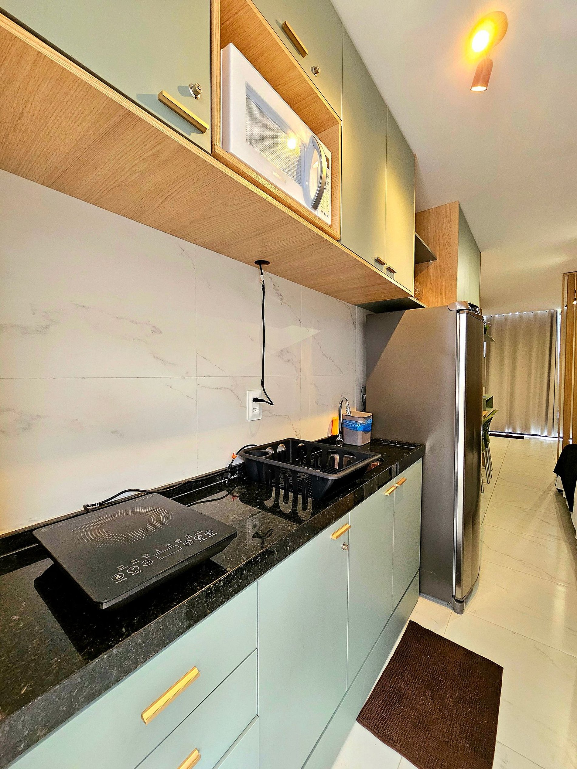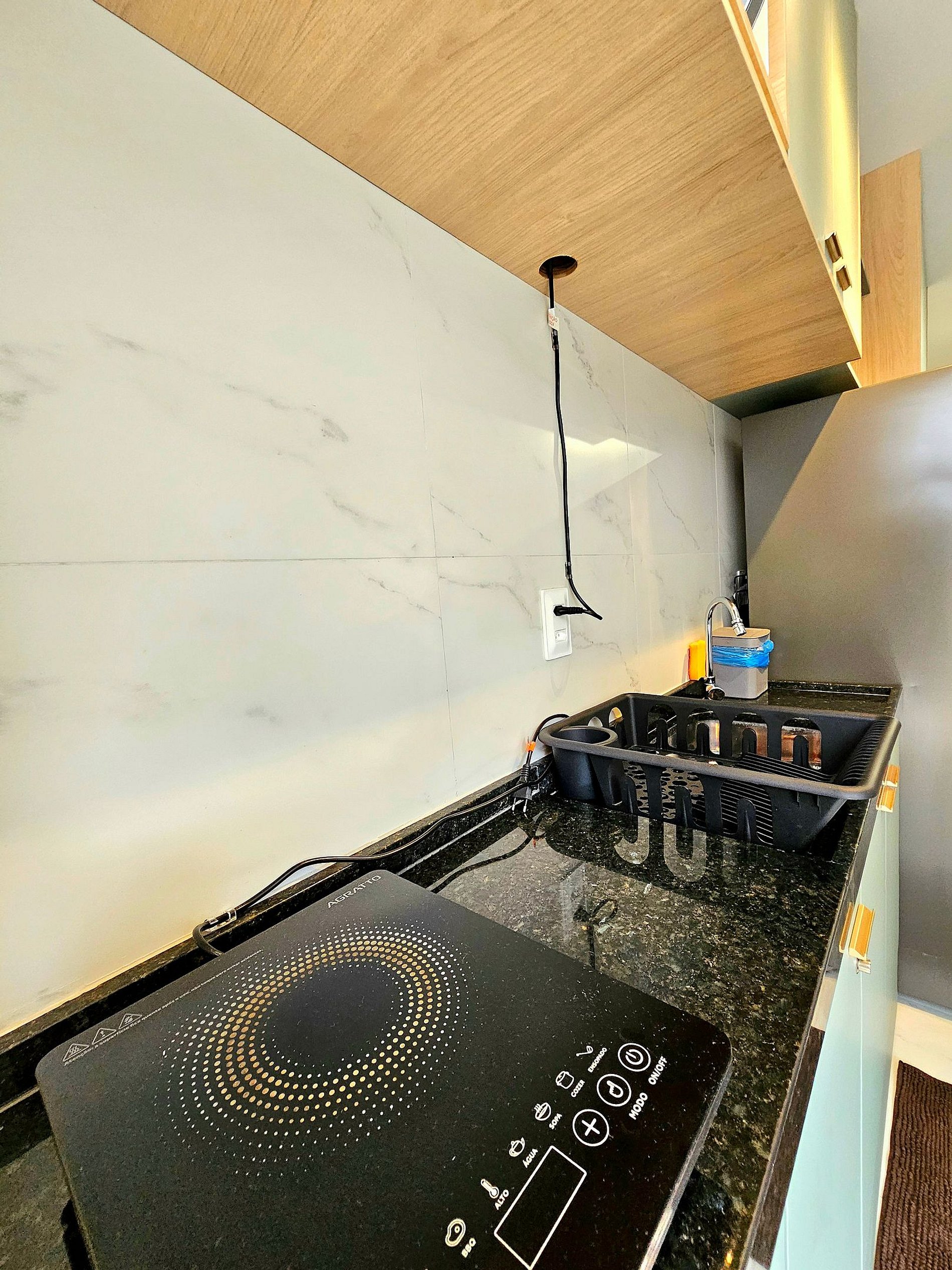 A cozinha é totalmente equipada com eletrodomésticos de alta qualidade, incluindo cooktop, geladeira, micro-ondas, sanduicheira, liquidificador, cafeteira e todos os utensílios (panelas, copos, taças, pratos e talheres) para realizar sua refeição.