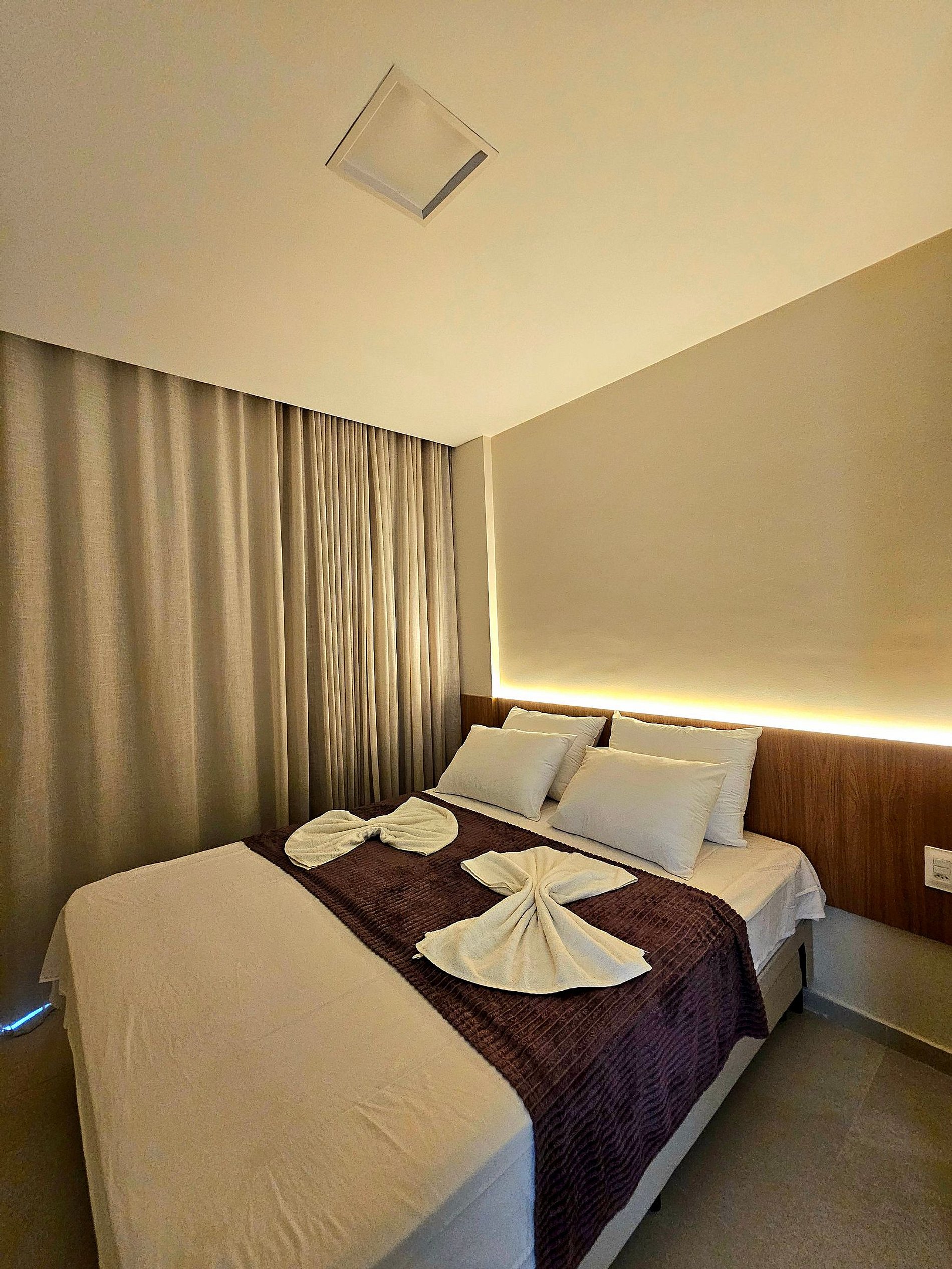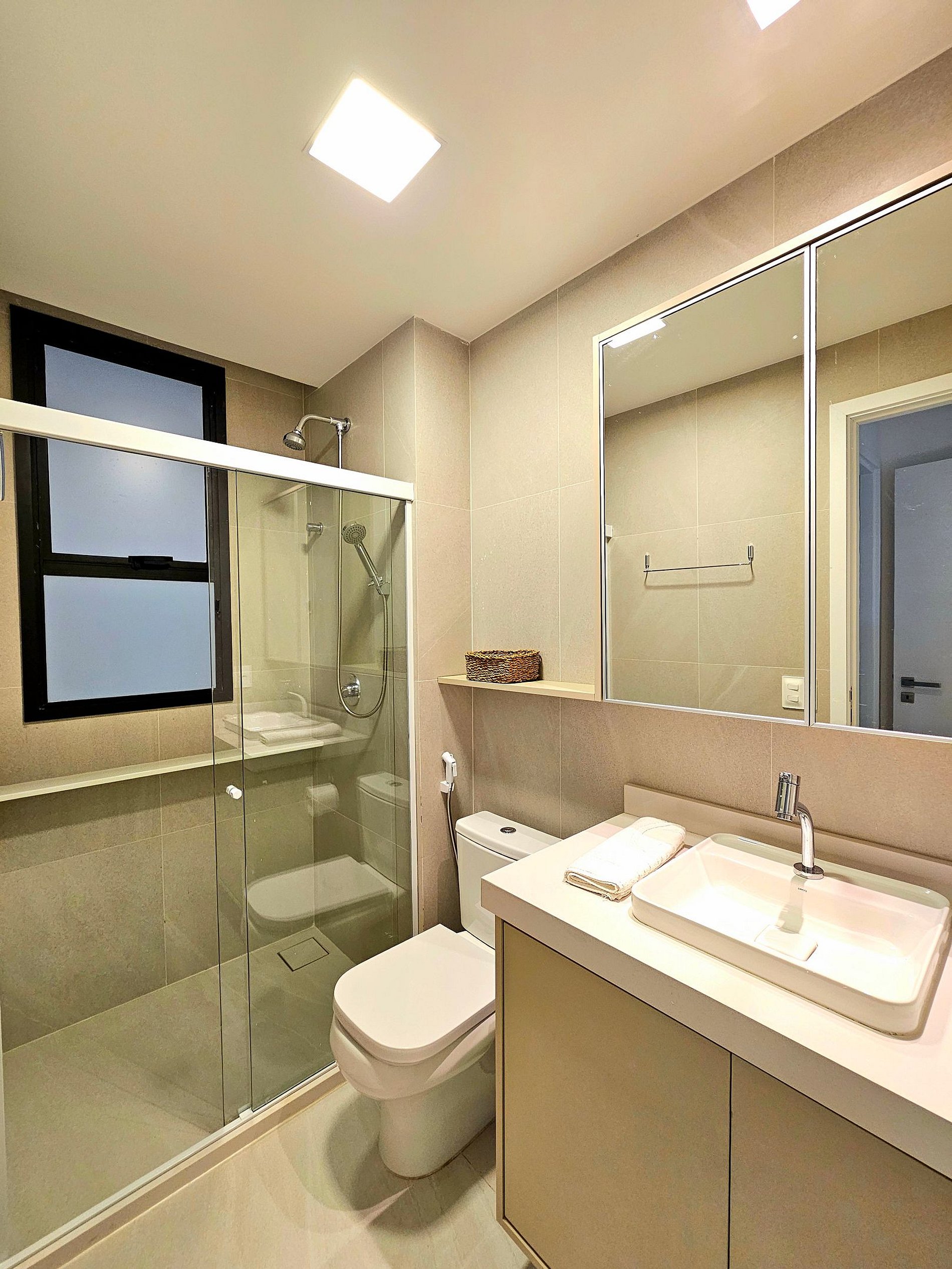 Nosso apartamento todo novo possui 2 quartos (1 deles suíte), 2 banheiros ao todo, foi montado e equipado com tudo o que há de melhor, Utensílios e eletrodomésticos modernos e de excelente qualidade, possuímos de diferencial: