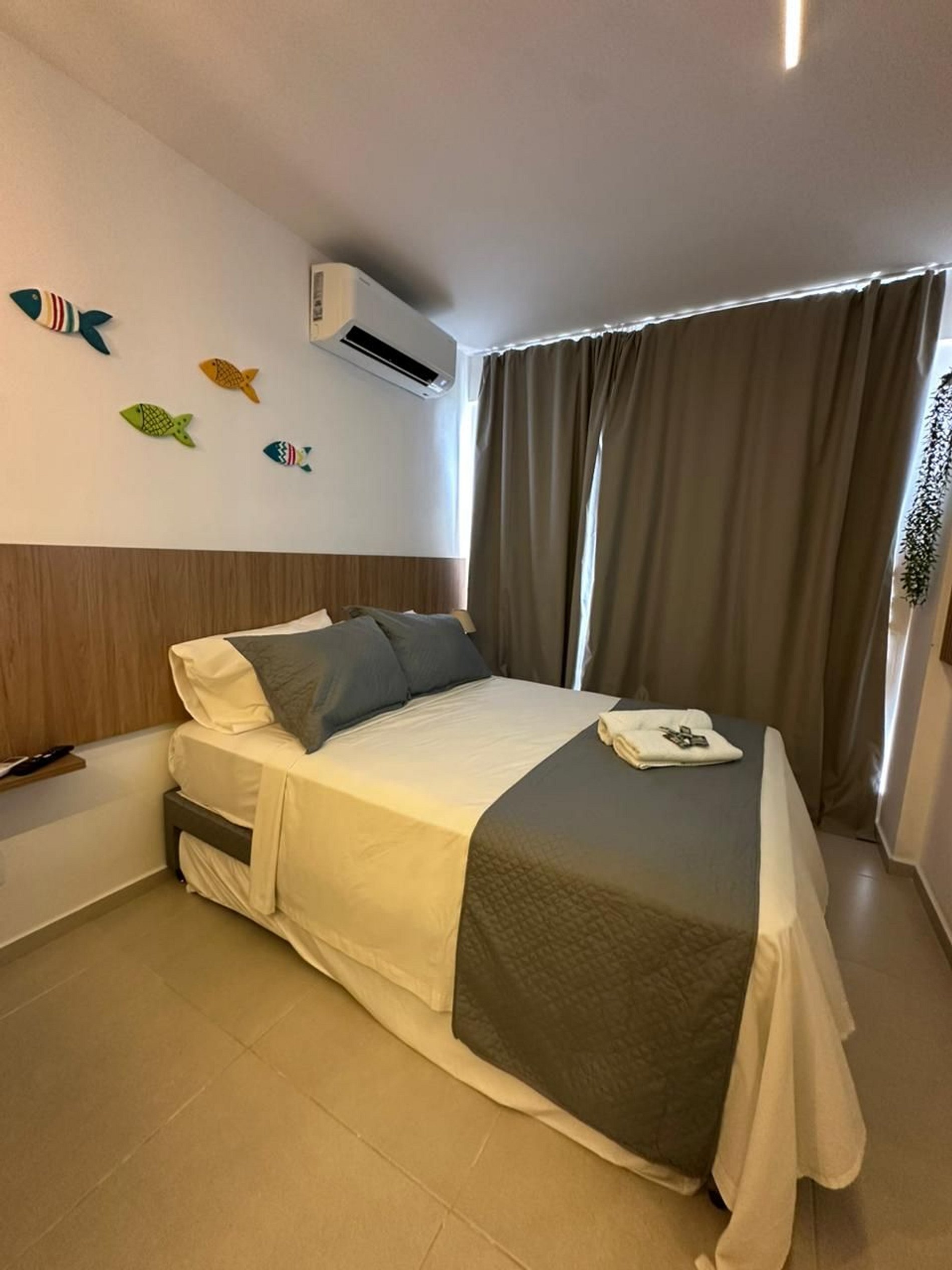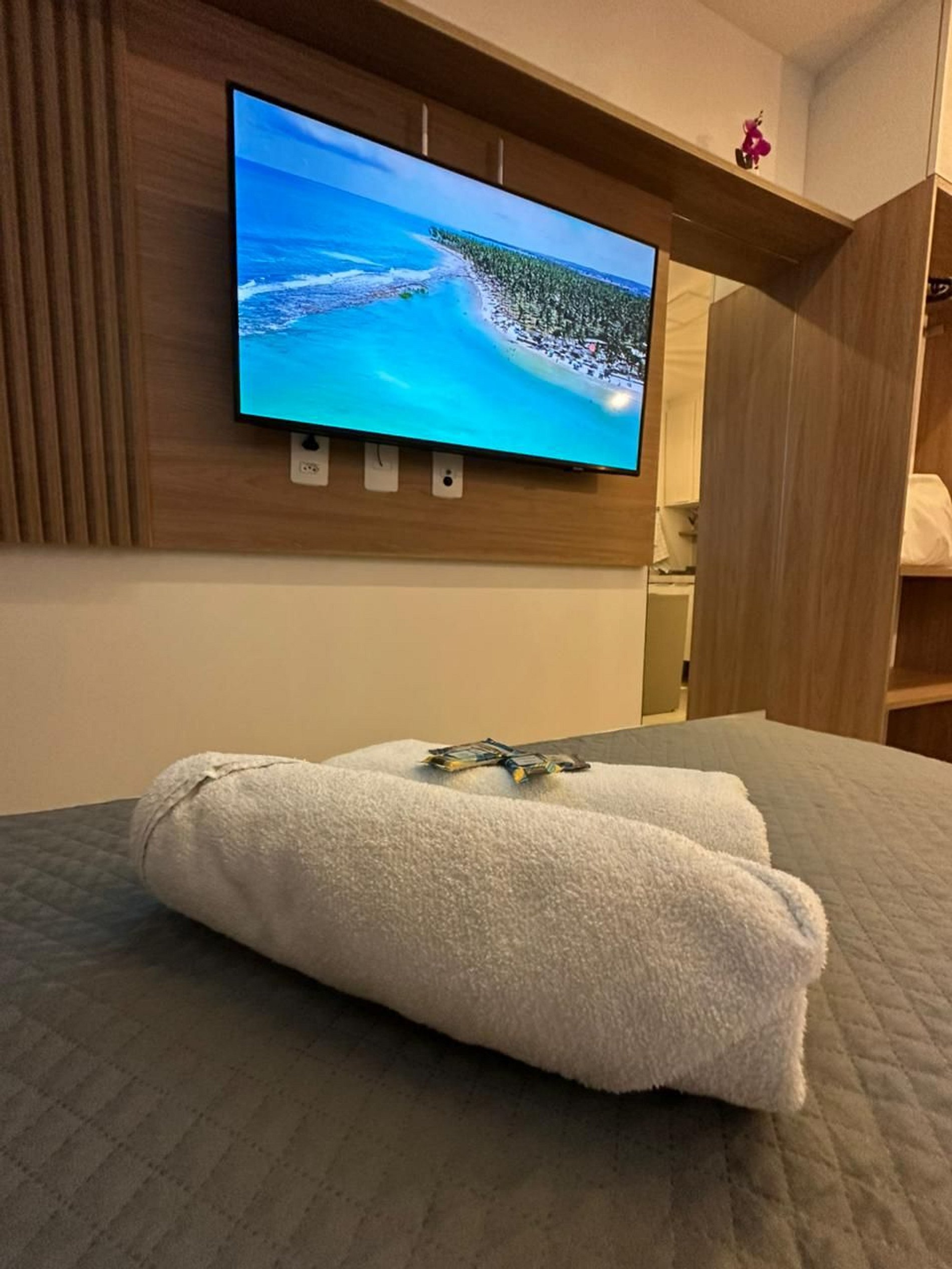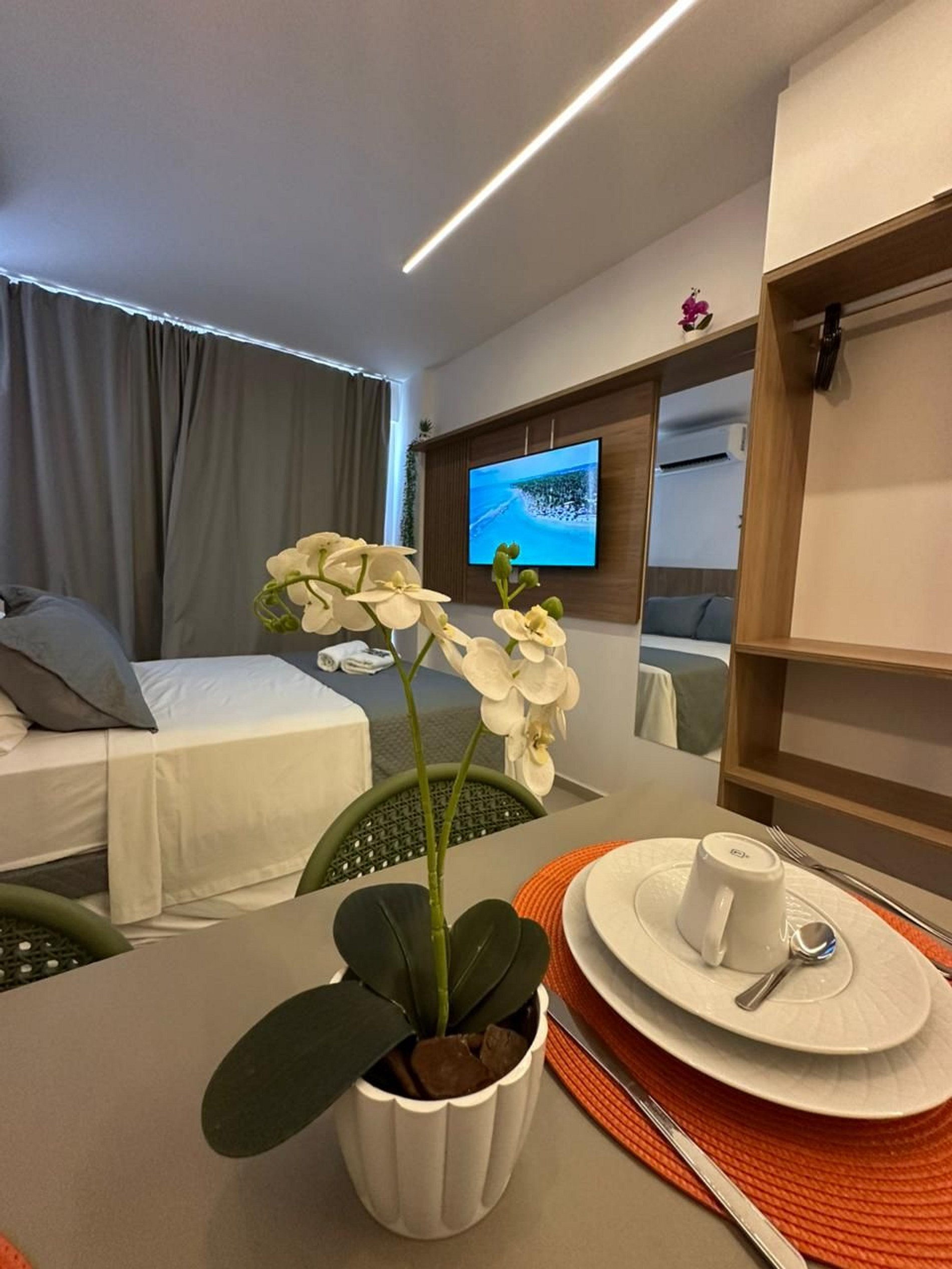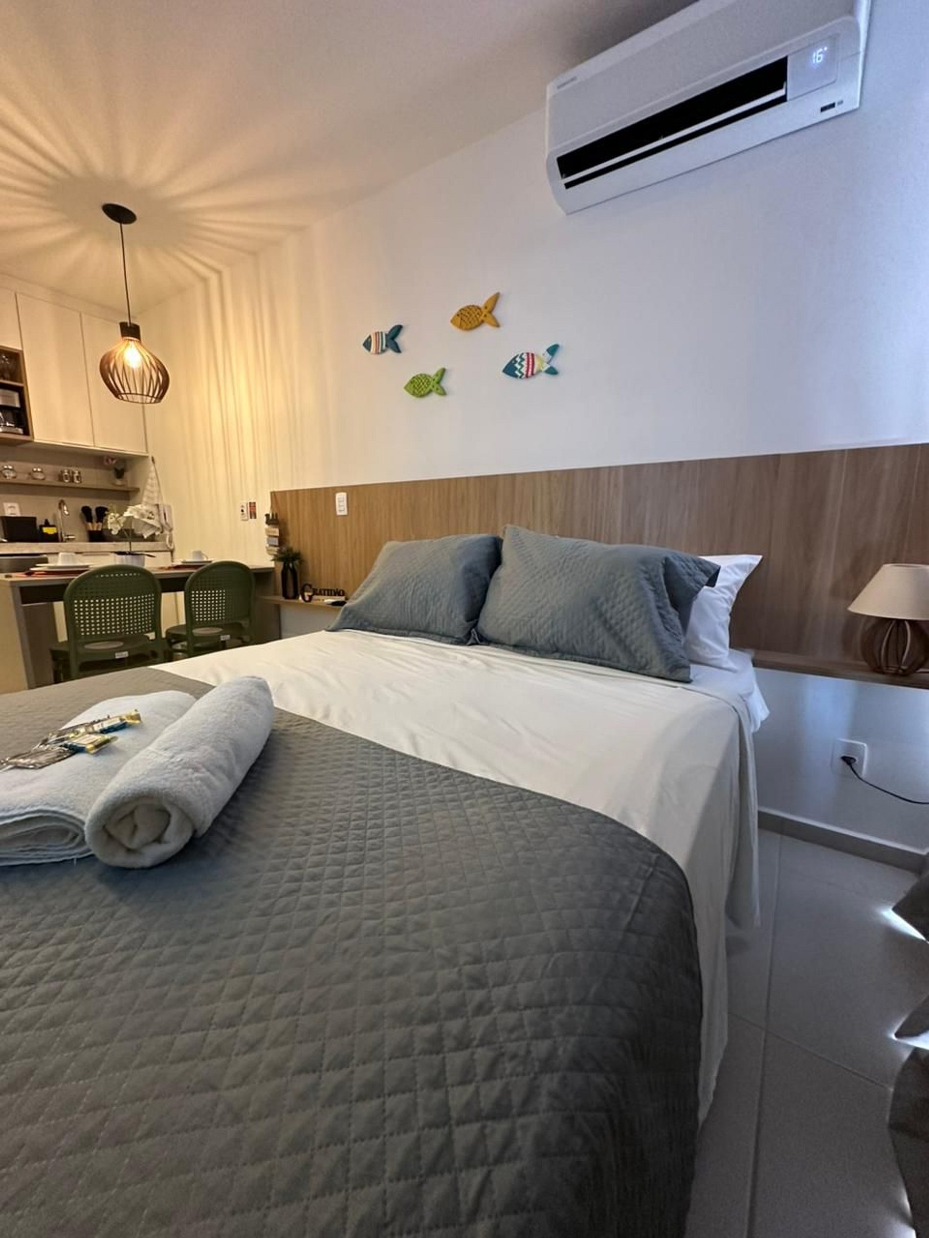 Nosso flat conta com apartamentos bem equipados, projetados para proporcionar a você o máximo de conforto. Cada unidade possui ar-condicionado, Wi-Fi gratuito, TV de tela plana e uma cozinha compacta, facilitando sua estadia. Descanse em camas confortáveis e aproveite os detalhes que tornam seu refúgio ainda mais especial.