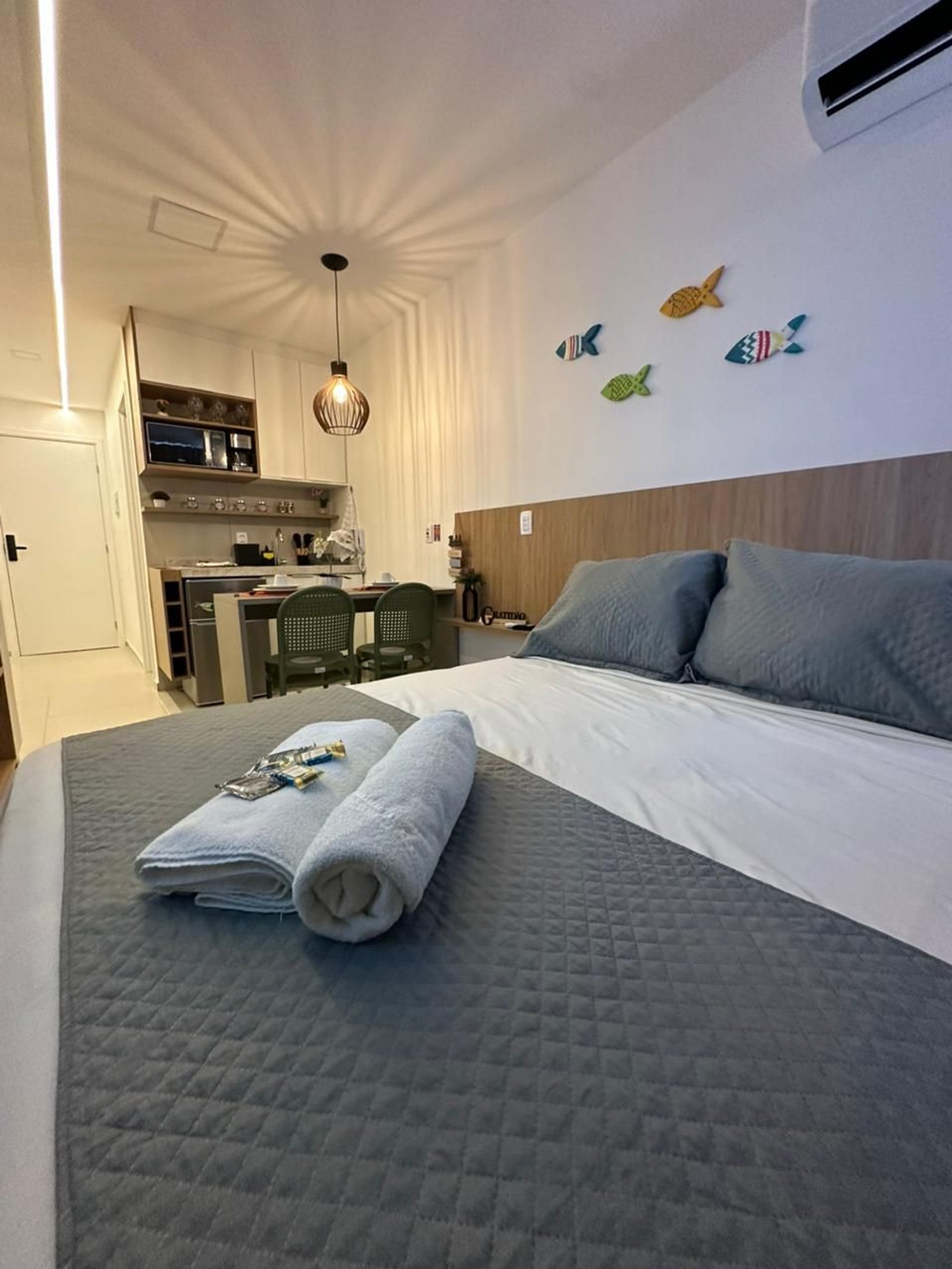 Nosso flat é novo, fino e muito bem decorado e comporta até 3 pessoas com 1 cama de casal extremamente confortável e 1 cama auxiliar, o ambiente bem iluminados e aconchegante, todos equipados com roupas de cama de qualidade e ar-condicionado para seu máximo conforto. A cozinha equipada com cooktop, sanduicheira, liquidificador, micro-ondas, cafeteira, air-fryer e todos os utensílios necessários para você realizar qualquer refeição.