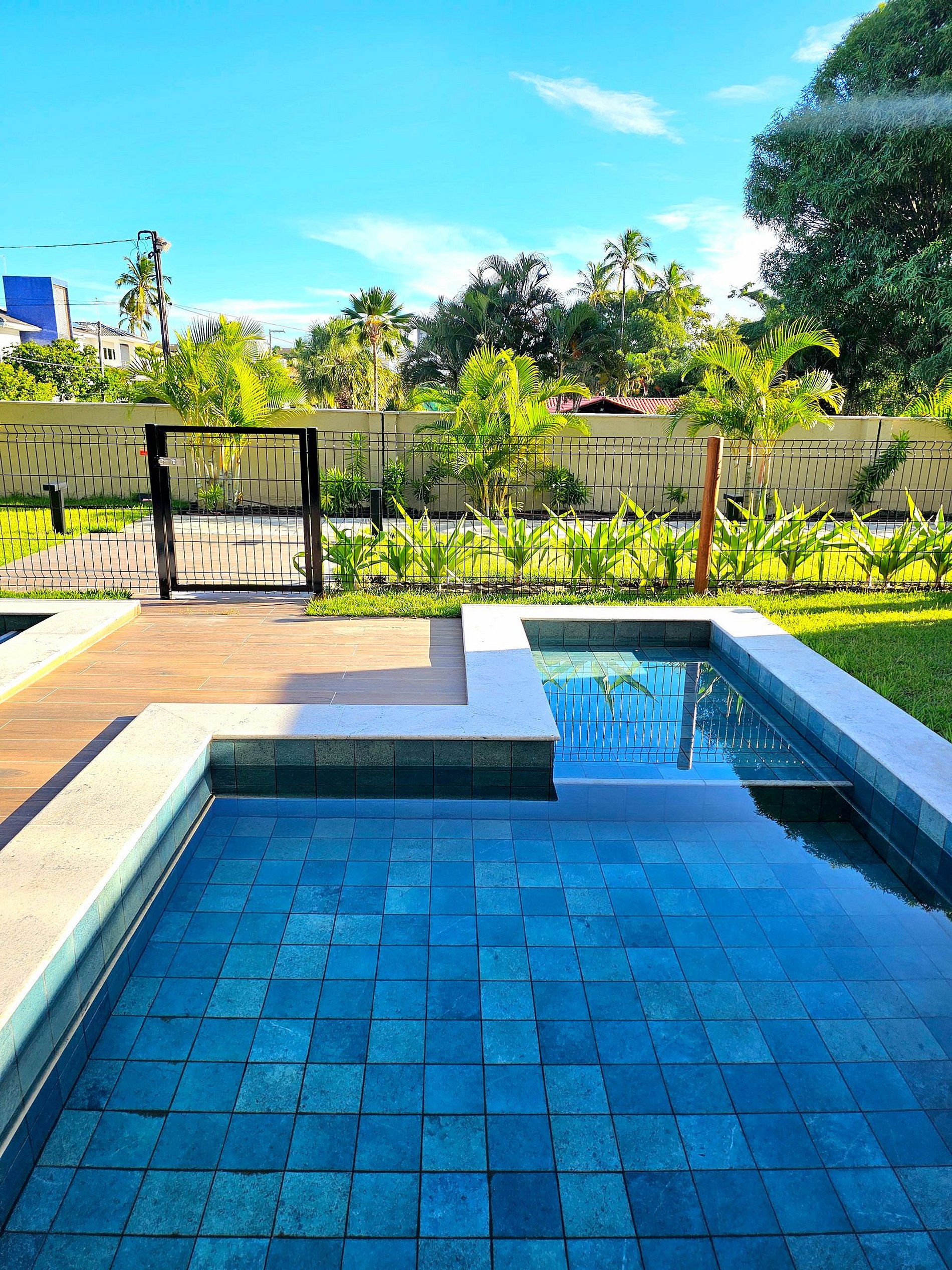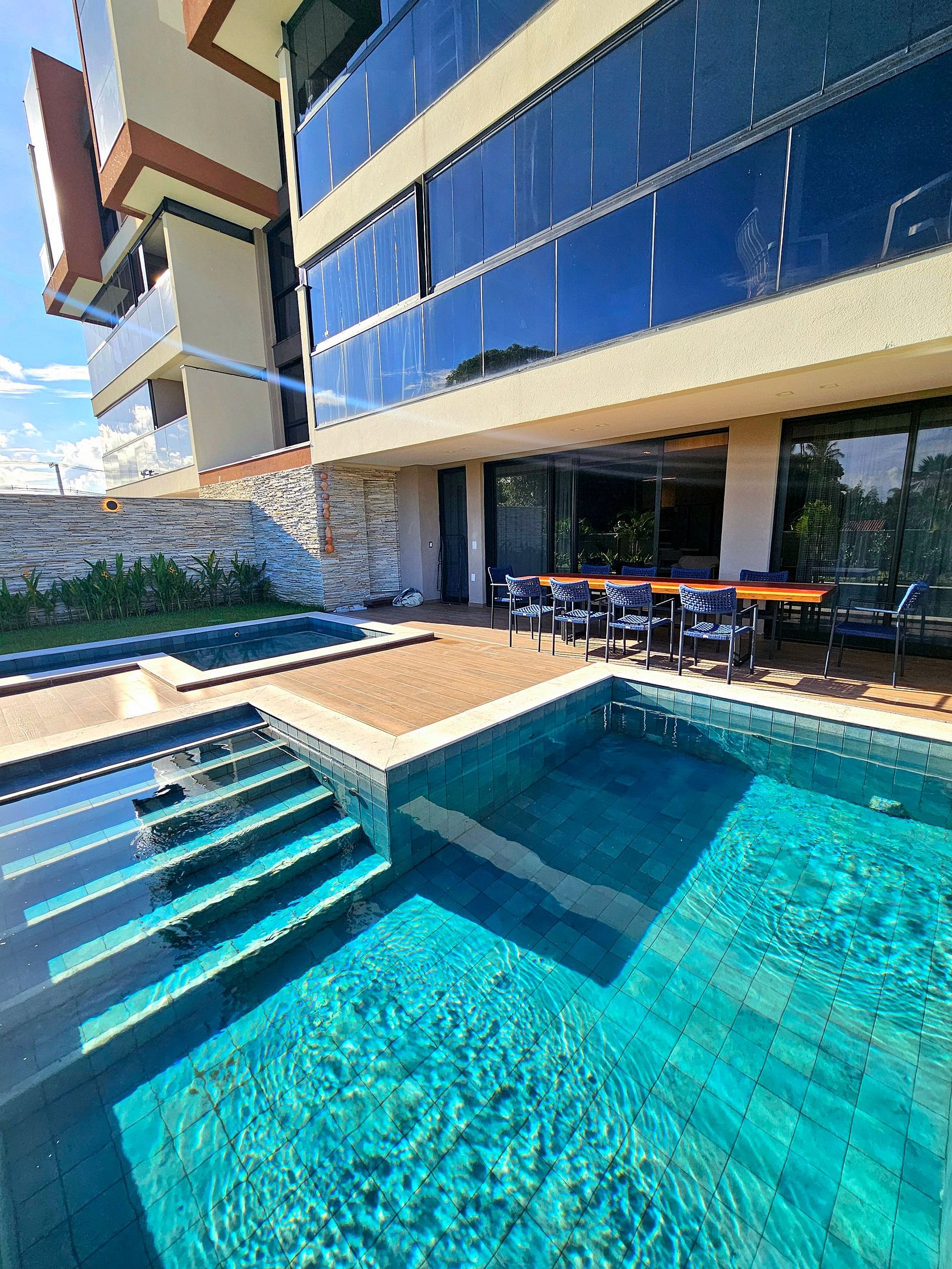 Nosso apartamento térreo com uma linda área externa com 2 piscinas privativas, jardim, localizado em uma posição estratégica em nosso condomínio, próximo a piscina infantil (com brinquedos aquáticos), próximo também a quadra poliesportiva, mercadinho, porém em um local mais reservado.