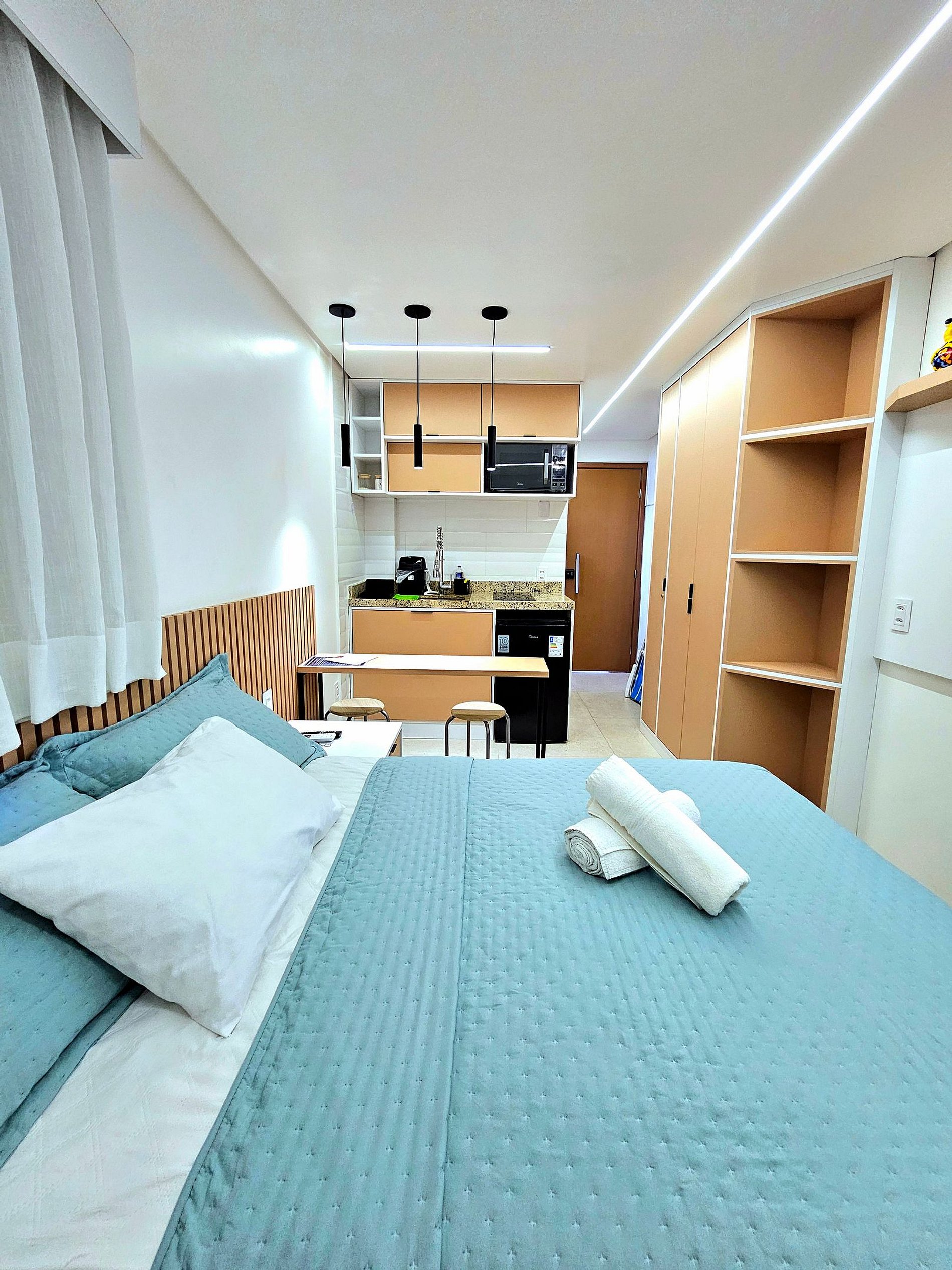 Conforto e Praticidade: O studio acomoda confortavelmente até quatro hóspedes, dispondo de uma cama de casal, uma cama de solteiro e 1 cama auxiliar de solteiro (embaixo da cama de solteiro). Cada elemento foi pensado para proporcionar o máximo de conforto e uma boa noite de sono.
