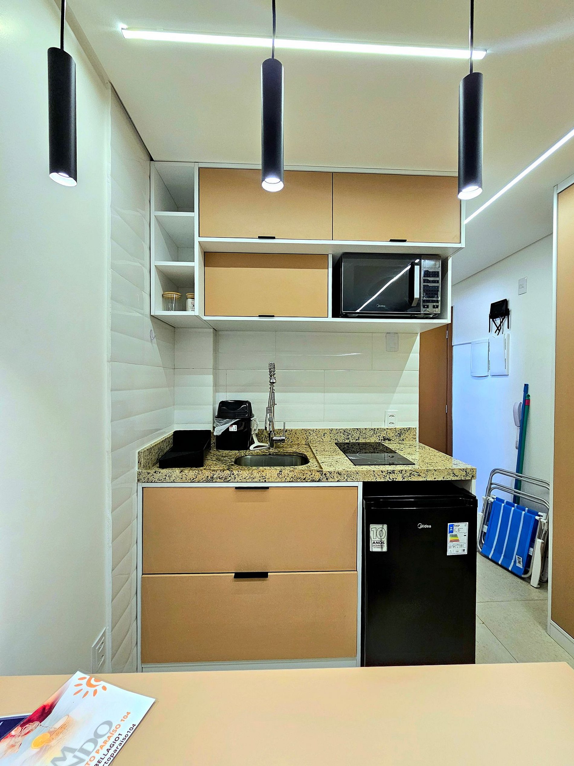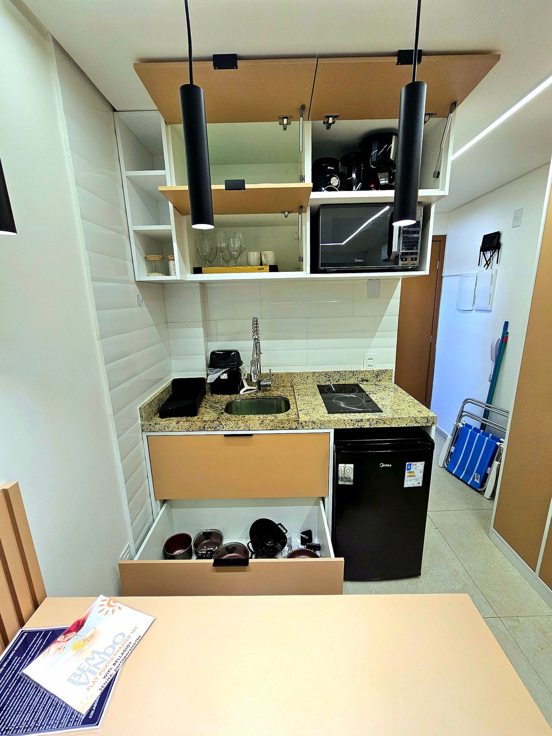 Cozinha Equipada Prepare suas refeições com facilidade na cozinha bem equipada, que inclui os principais eletrodomésticos modernos (Liquidificador, cafeteira, microondas, sanduicheira). Seja para um café da manhã rápido antes de explorar a cidade ou para um jantar especial, você encontrará tudo o que precisa para cozinhar com praticidade e eficiência.