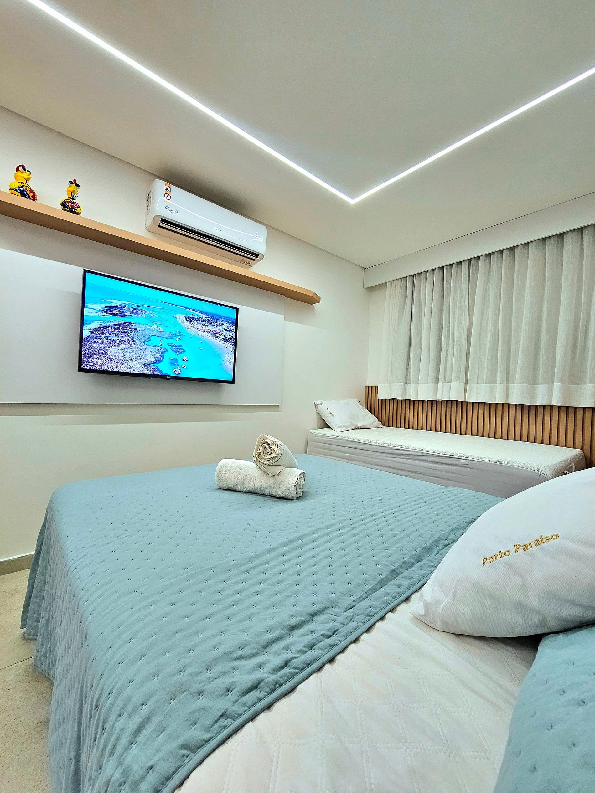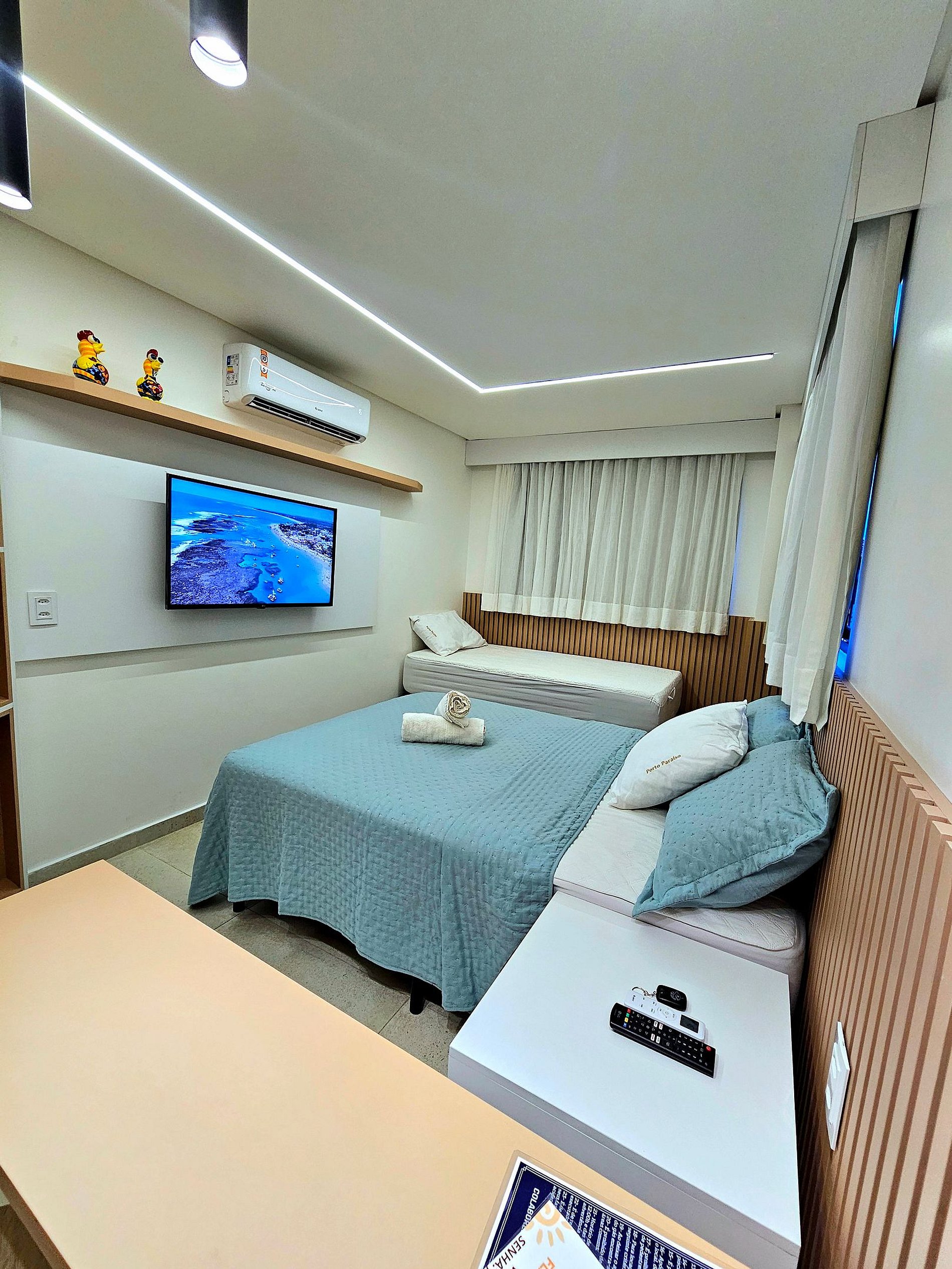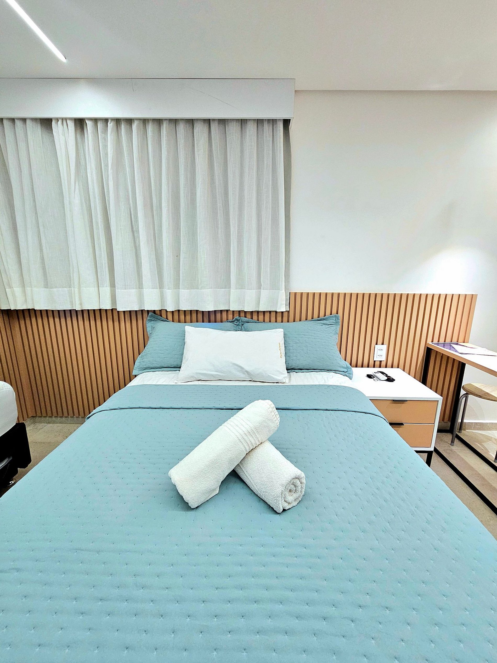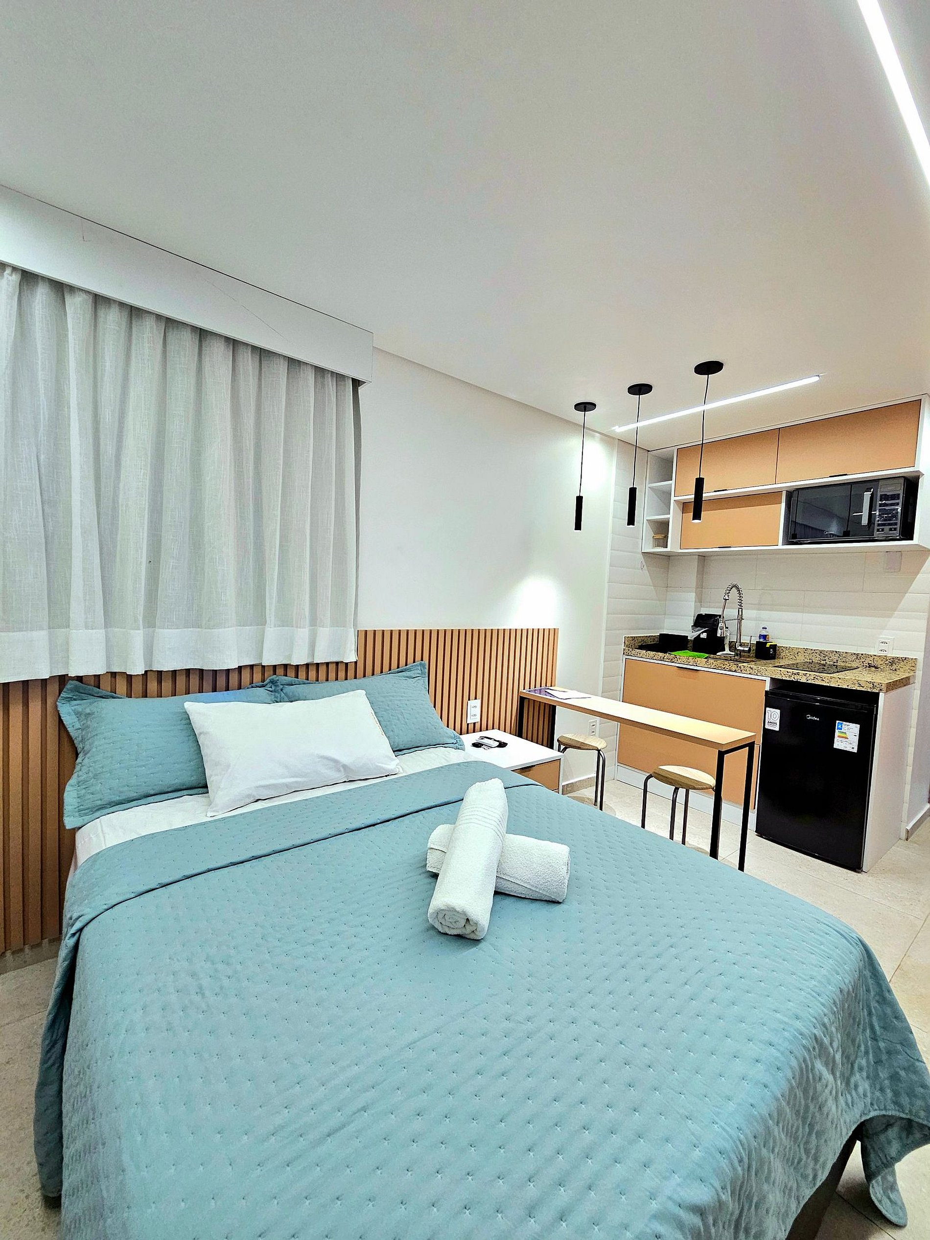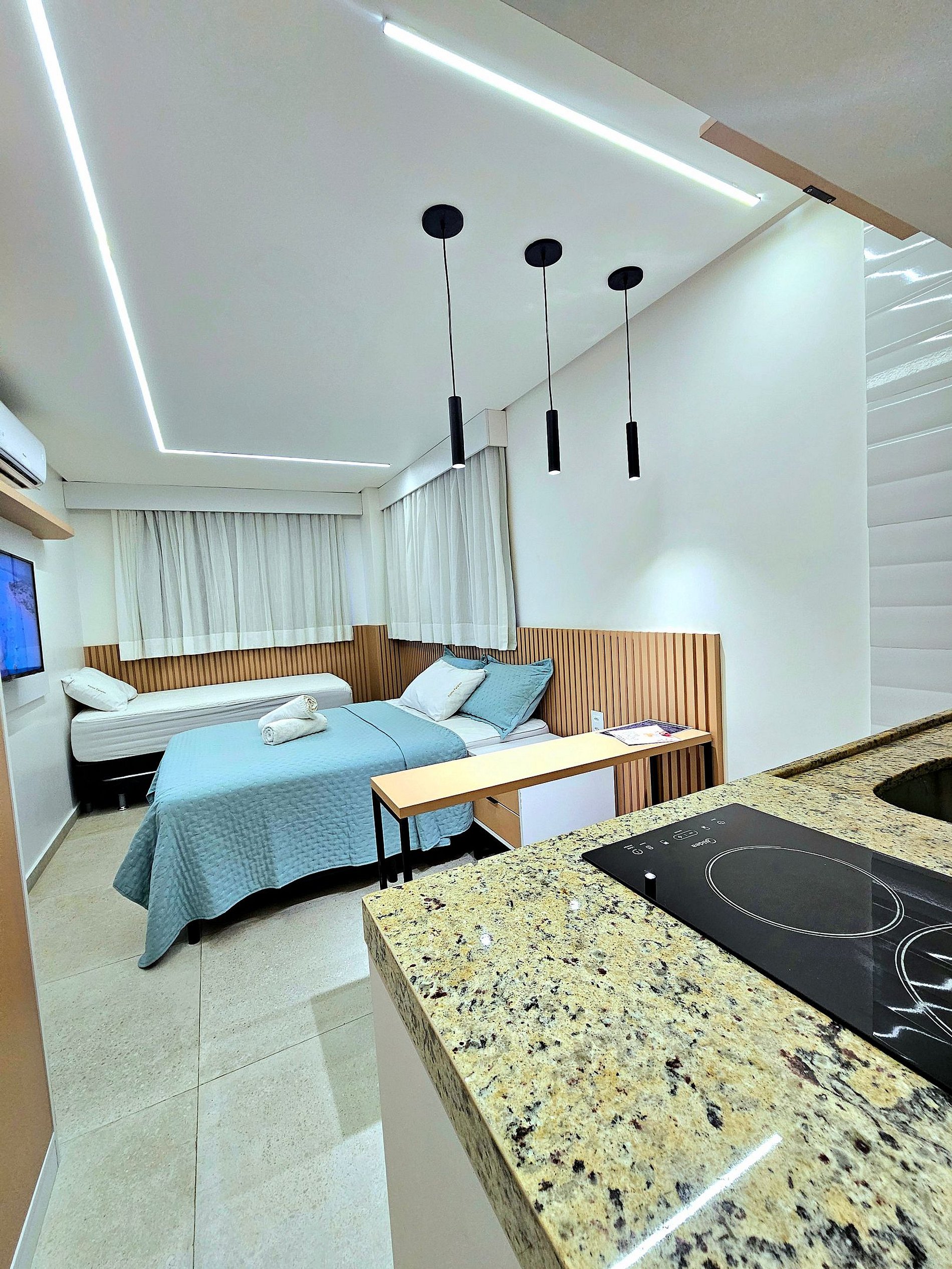 Conforto e Praticidade: O studio acomoda confortavelmente até quatro hóspedes, dispondo de uma cama de casal, uma cama de solteiro e 1 cama auxiliar de solteiro (embaixo da cama de solteiro). Cada elemento foi pensado para proporcionar o máximo de conforto e uma boa noite de sono.
