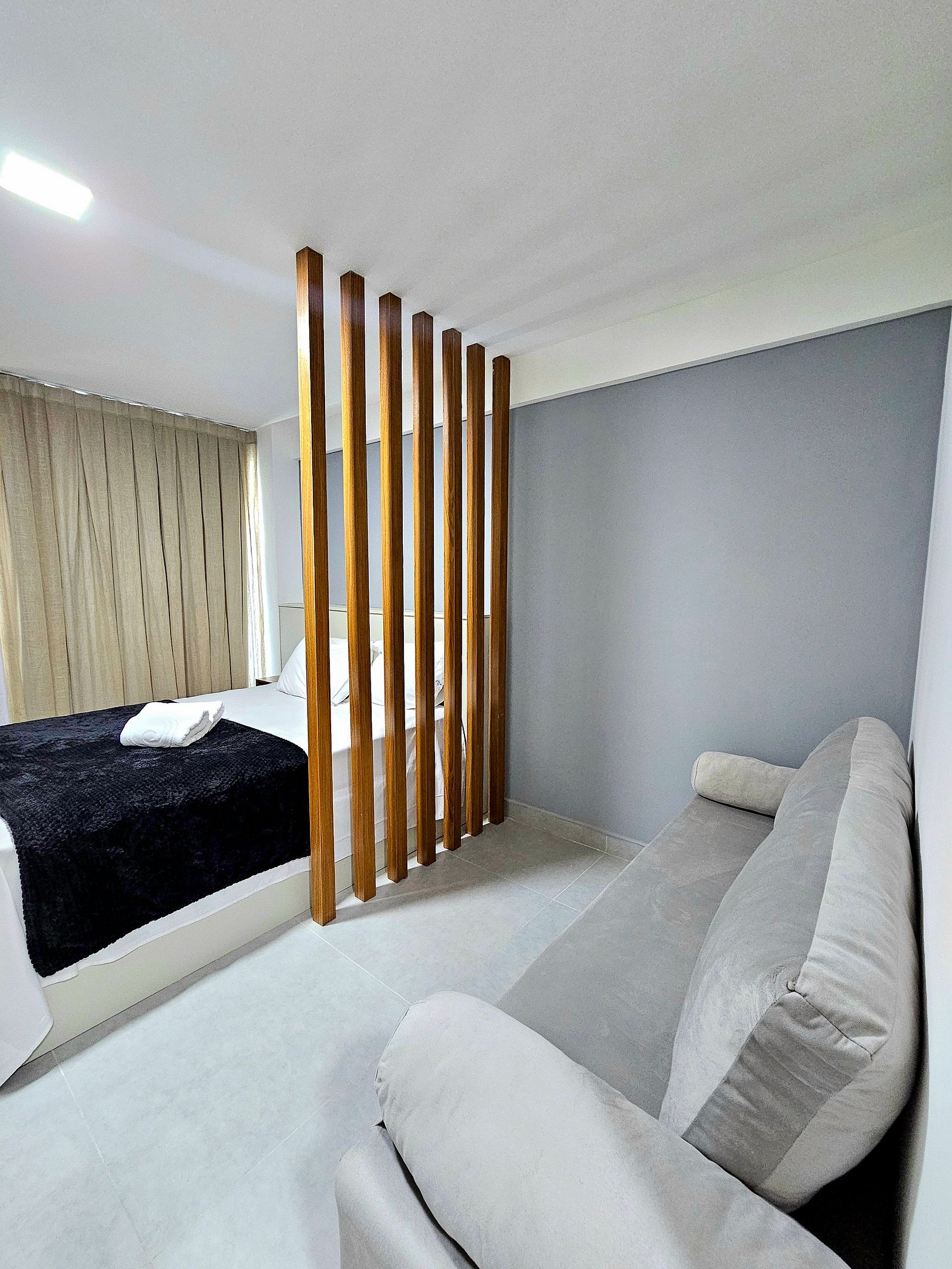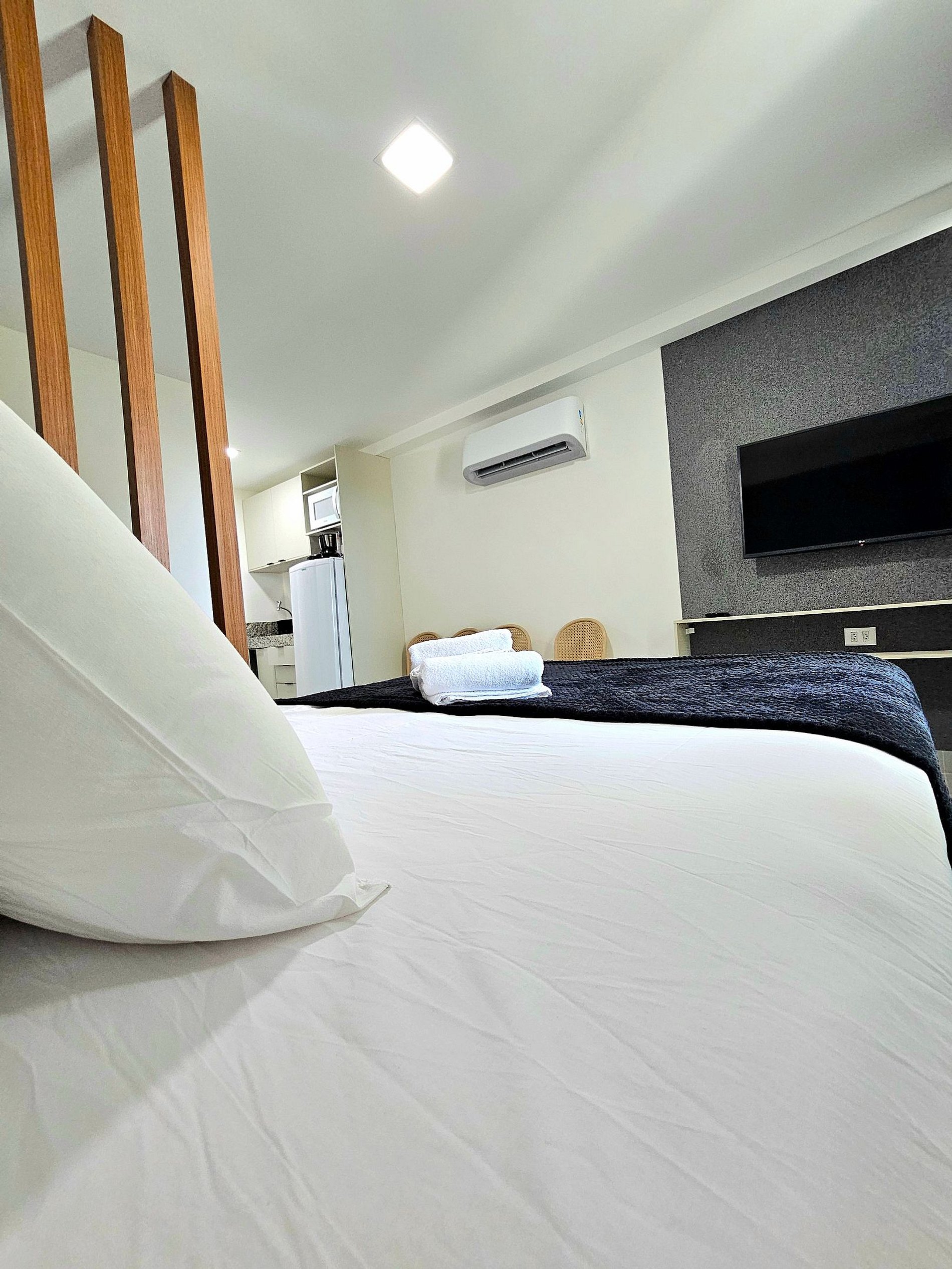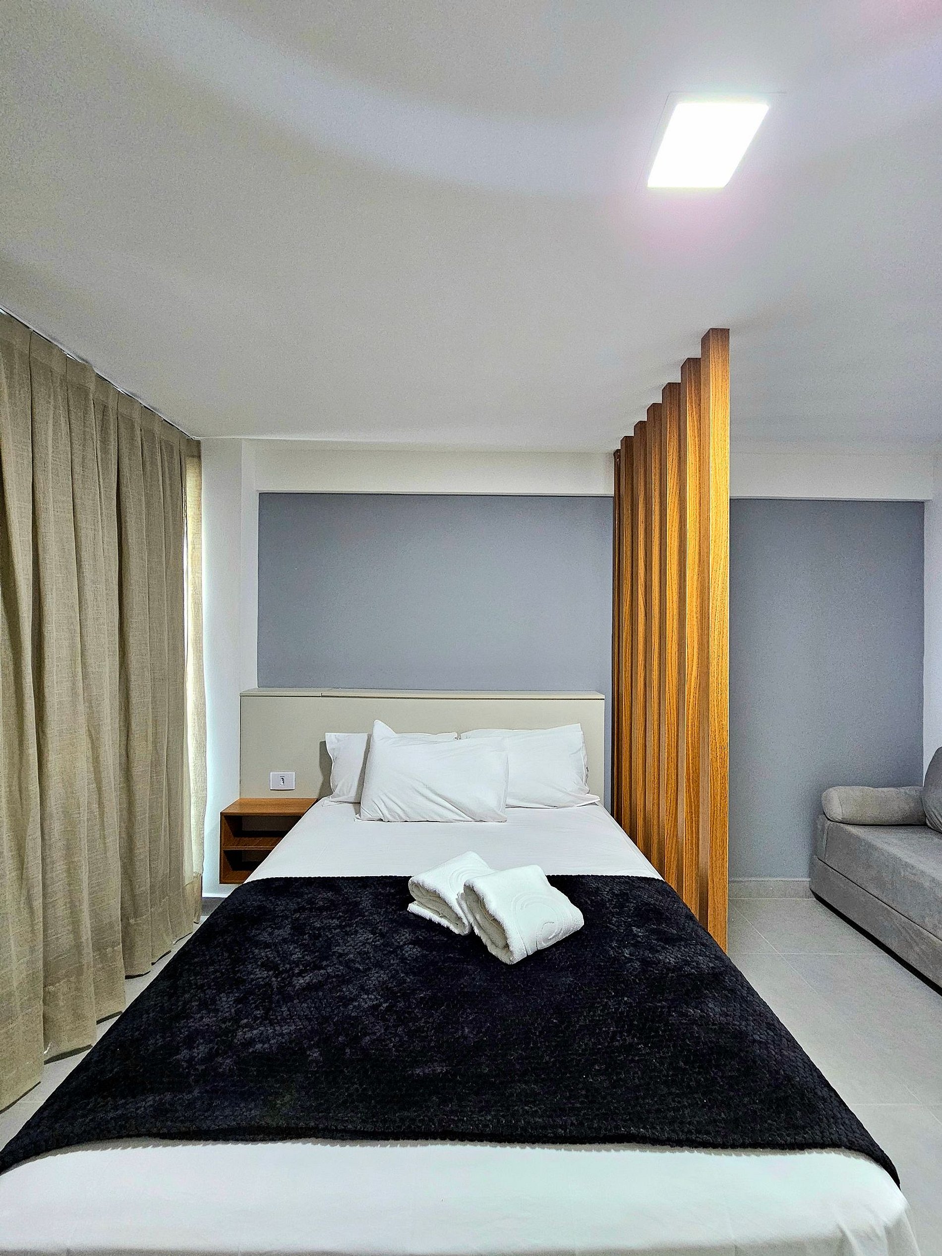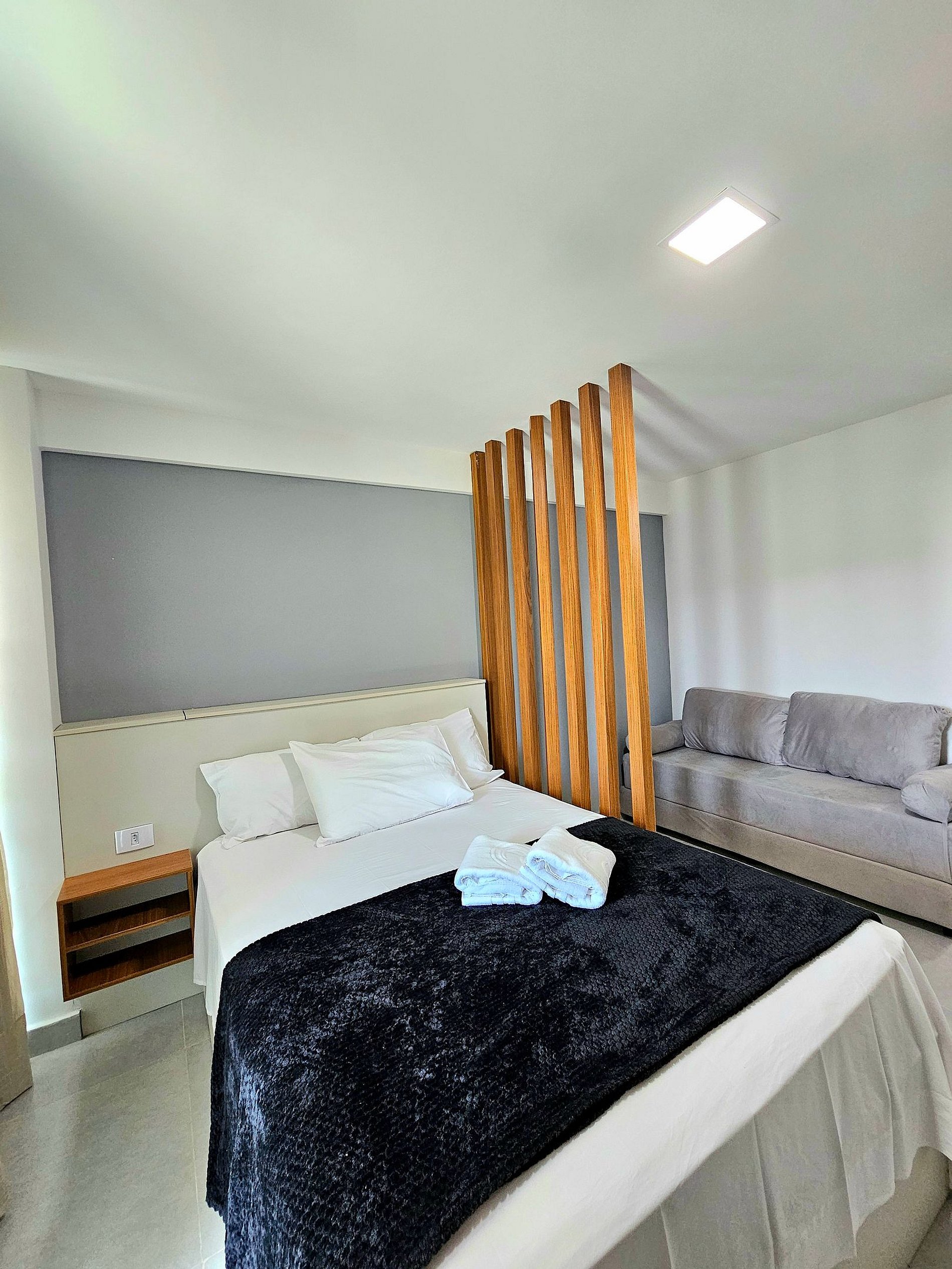 Conforto e Praticidade O studio acomoda confortavelmente até 3 hóspedes, dispondo de uma cama de casal e um excelente sofá-cama. Cada elemento foi pensado para proporcionar o máximo de conforto e uma boa noite de sono.