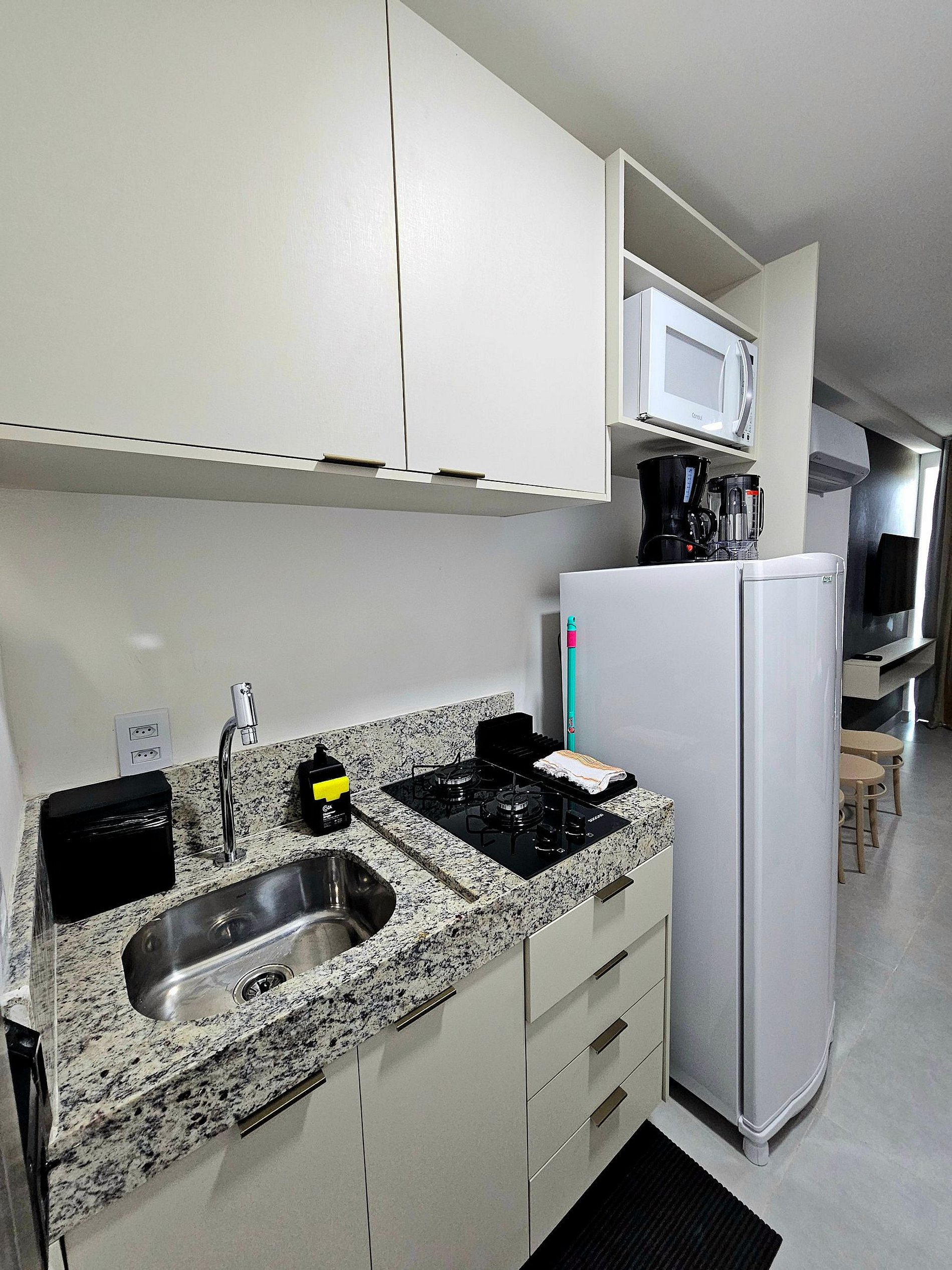 Cozinha Equipada Prepare suas refeições com facilidade na cozinha bem equipada, que inclui os principais eletrodomésticos modernos (Liquidificador, cafeteira, microondas, sanduicheira) Seja para um café da manhã rápido antes de explorar a cidade ou para um jantar especial, você encontrará tudo o que precisa para cozinhar com praticidade e eficiência.