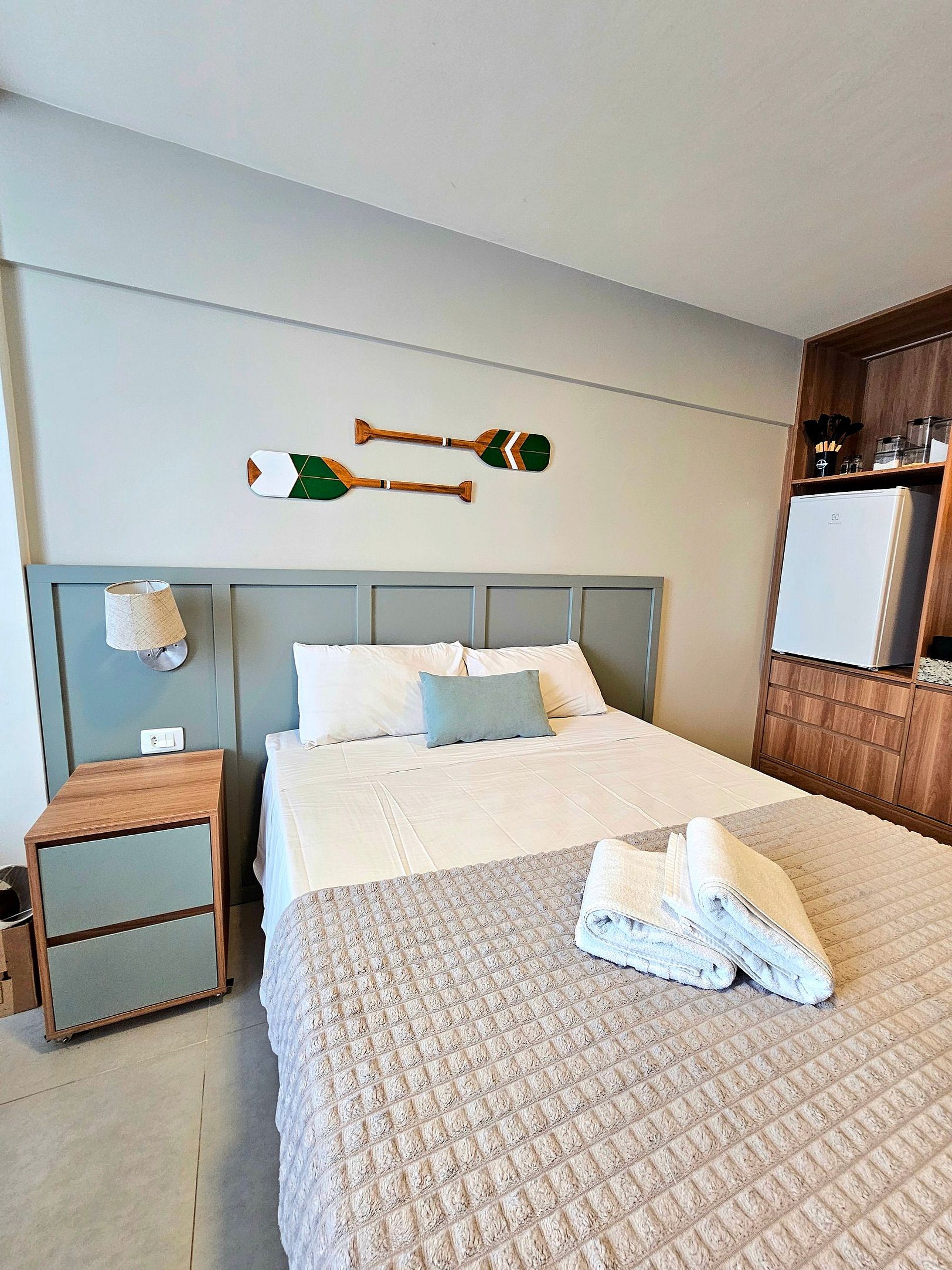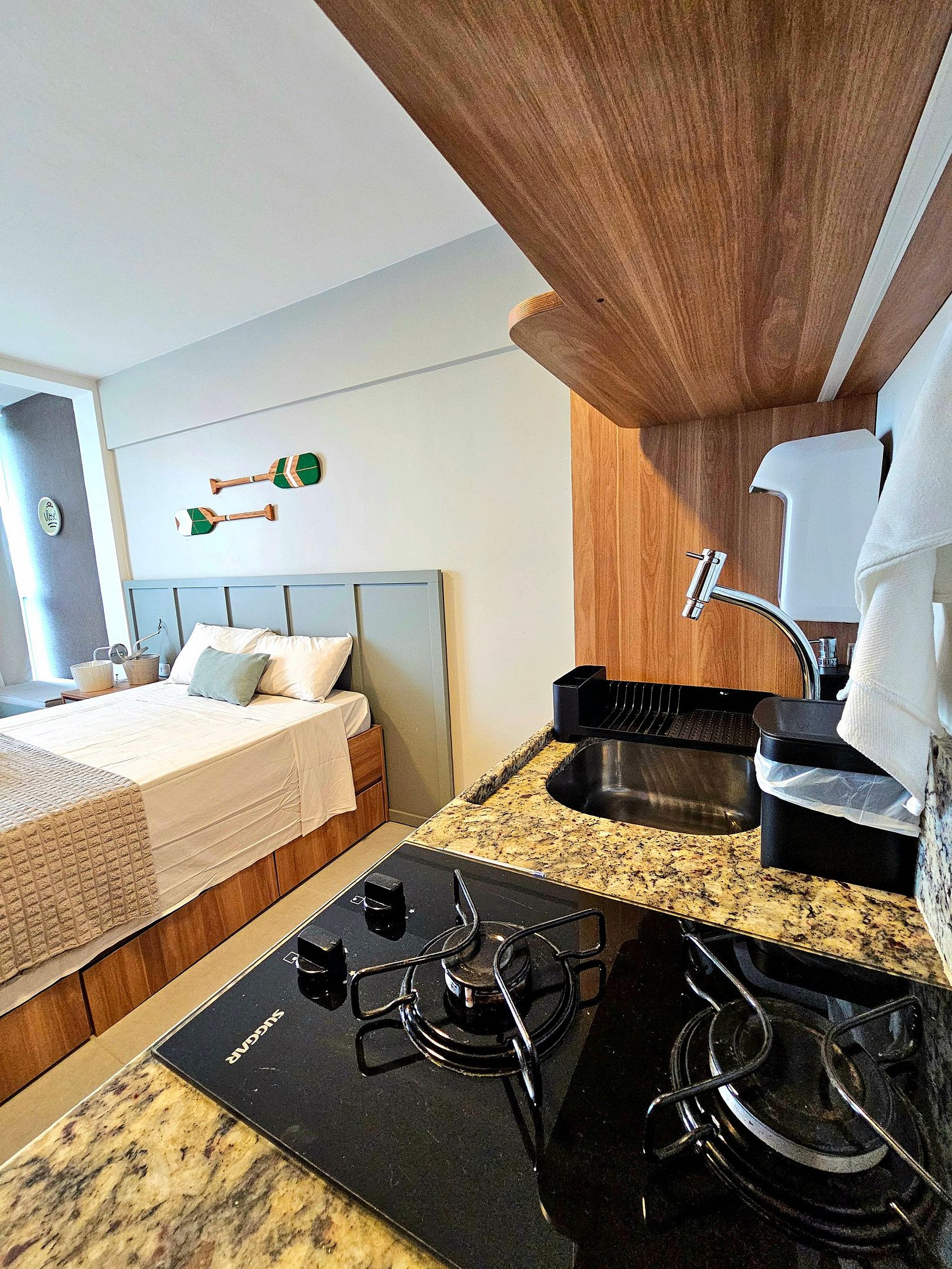 Conforto e Praticidade O studio acomoda confortavelmente até 3 hóspedes, dispondo de uma cama de casal e uma cama auxiliar. Cada elemento foi pensado para proporcionar o máximo de conforto e uma boa noite de sono.
