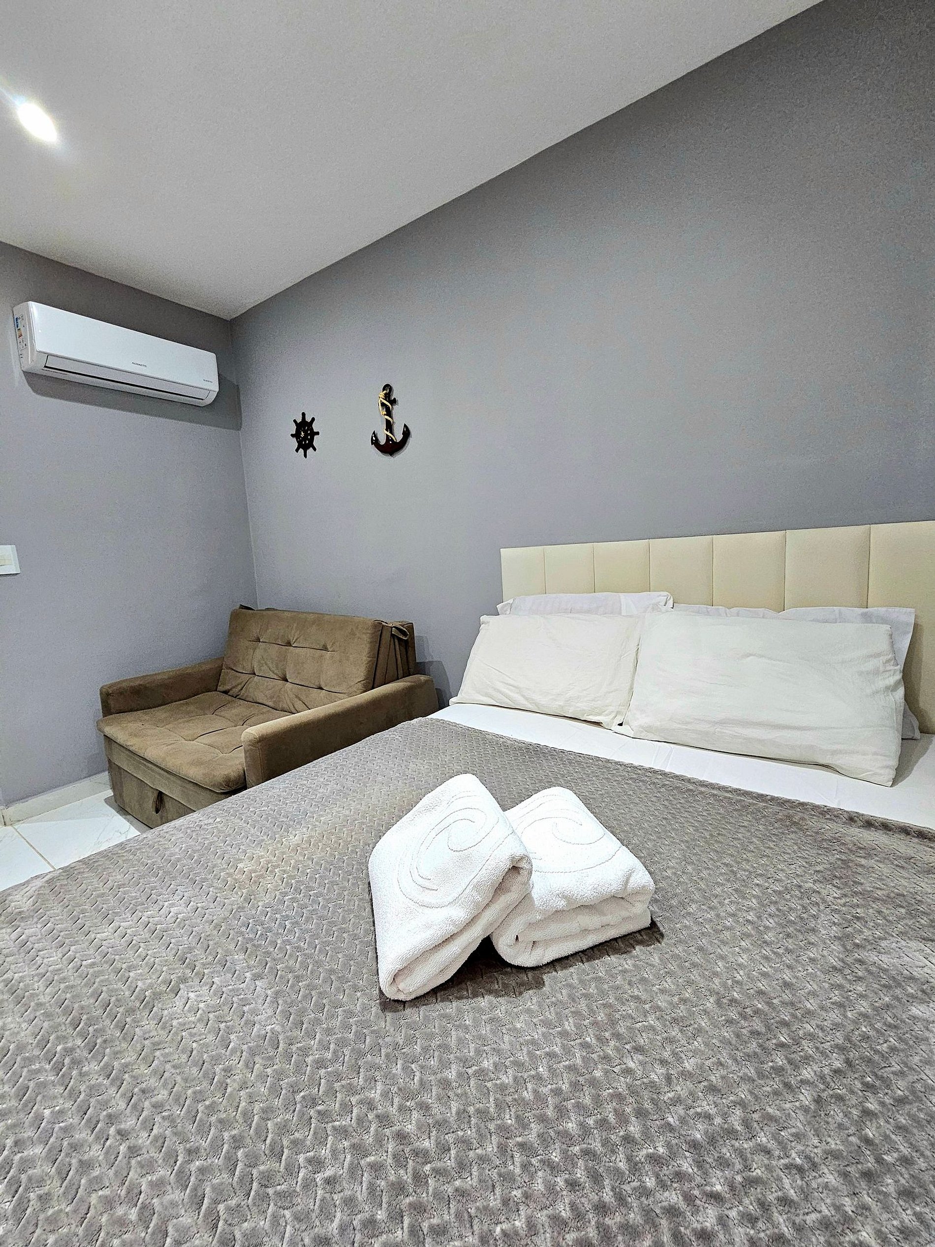 Perfeito para famílias pequenas, casais ou amigos, o ambiente foi pensado para acomodar 1 casal e mais 1 adulto com total conforto.