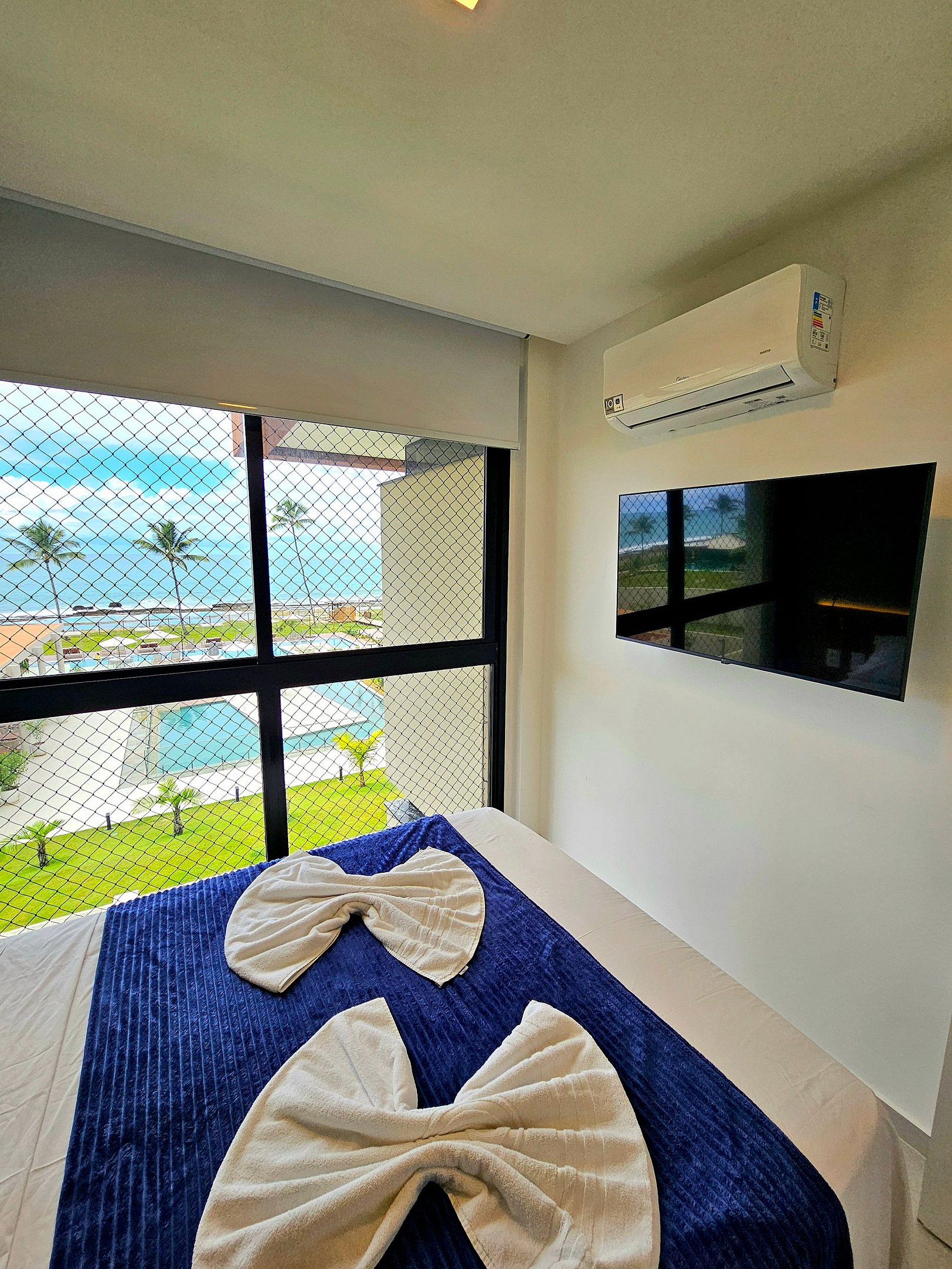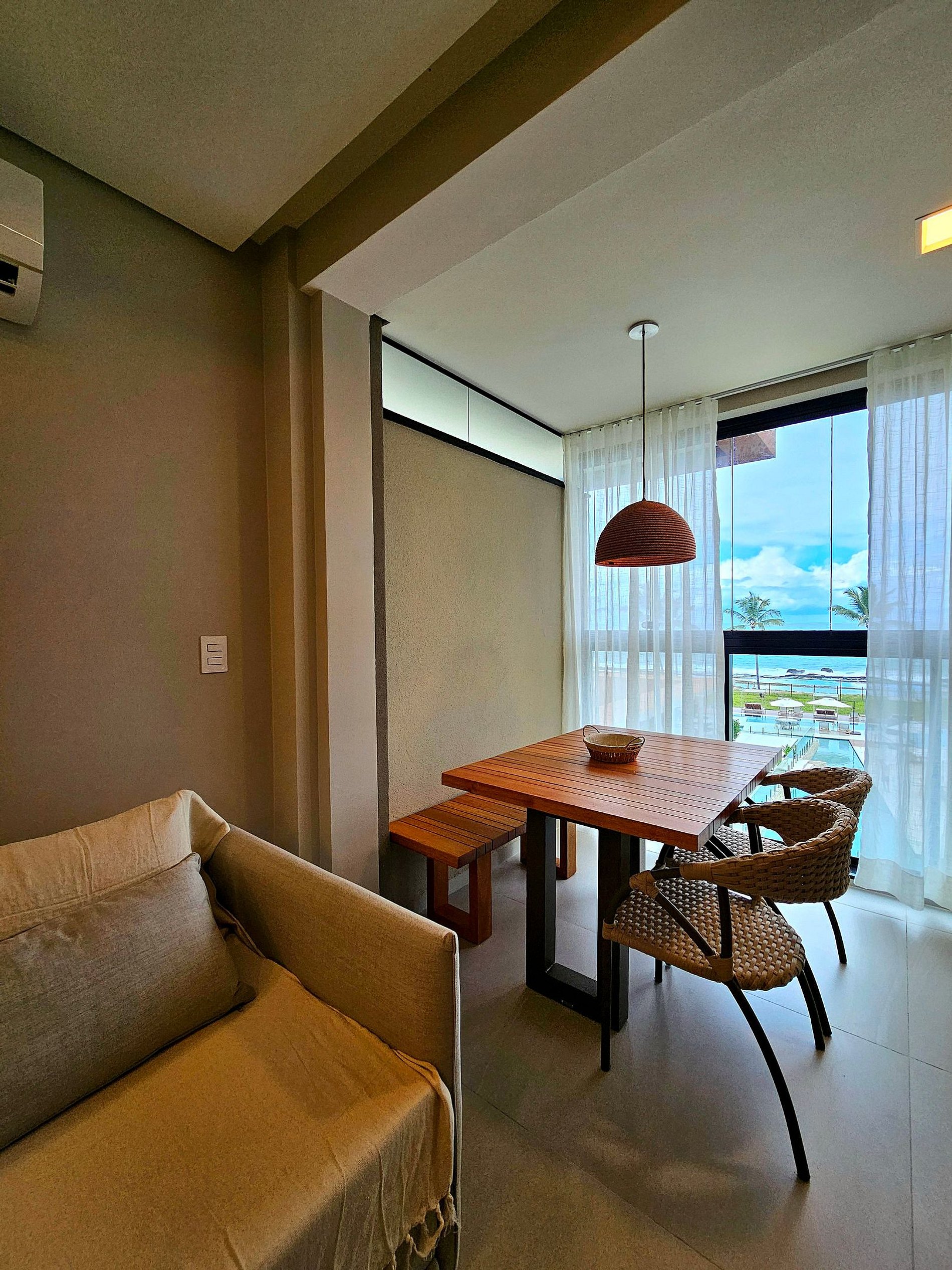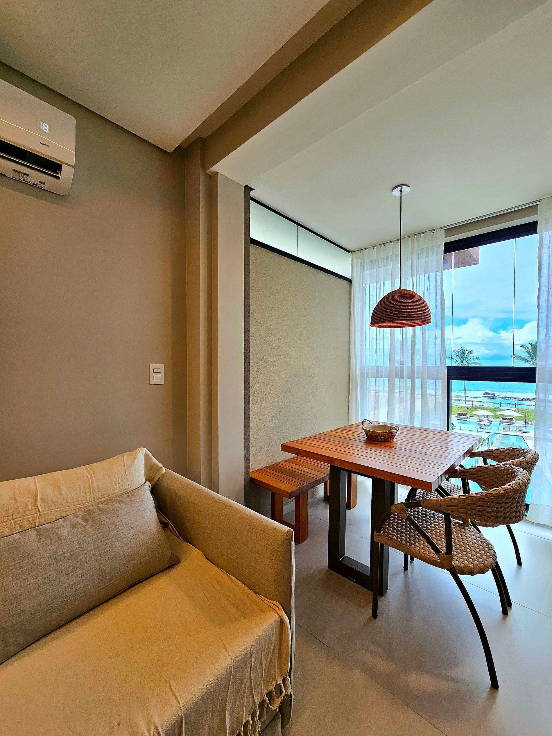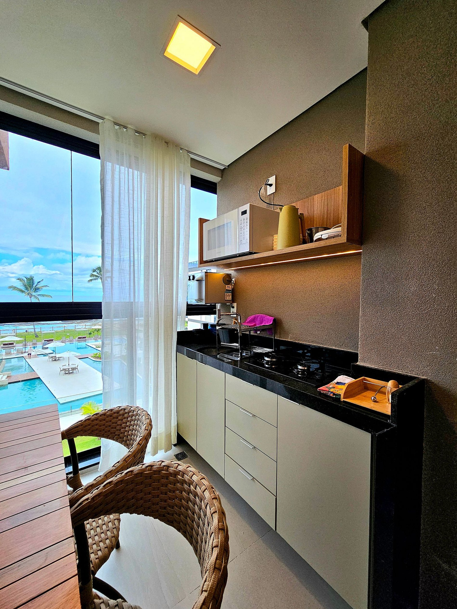Nosso apartamento todo novo e mobiliado bom bastante requinte possui 2 quartos, 1 banheiro social, uma incrível vista mar da nossa Sala/cozinha gourmet que também é um ambiente com vista panorâmica do Mar e da piscina principal do condomínio.