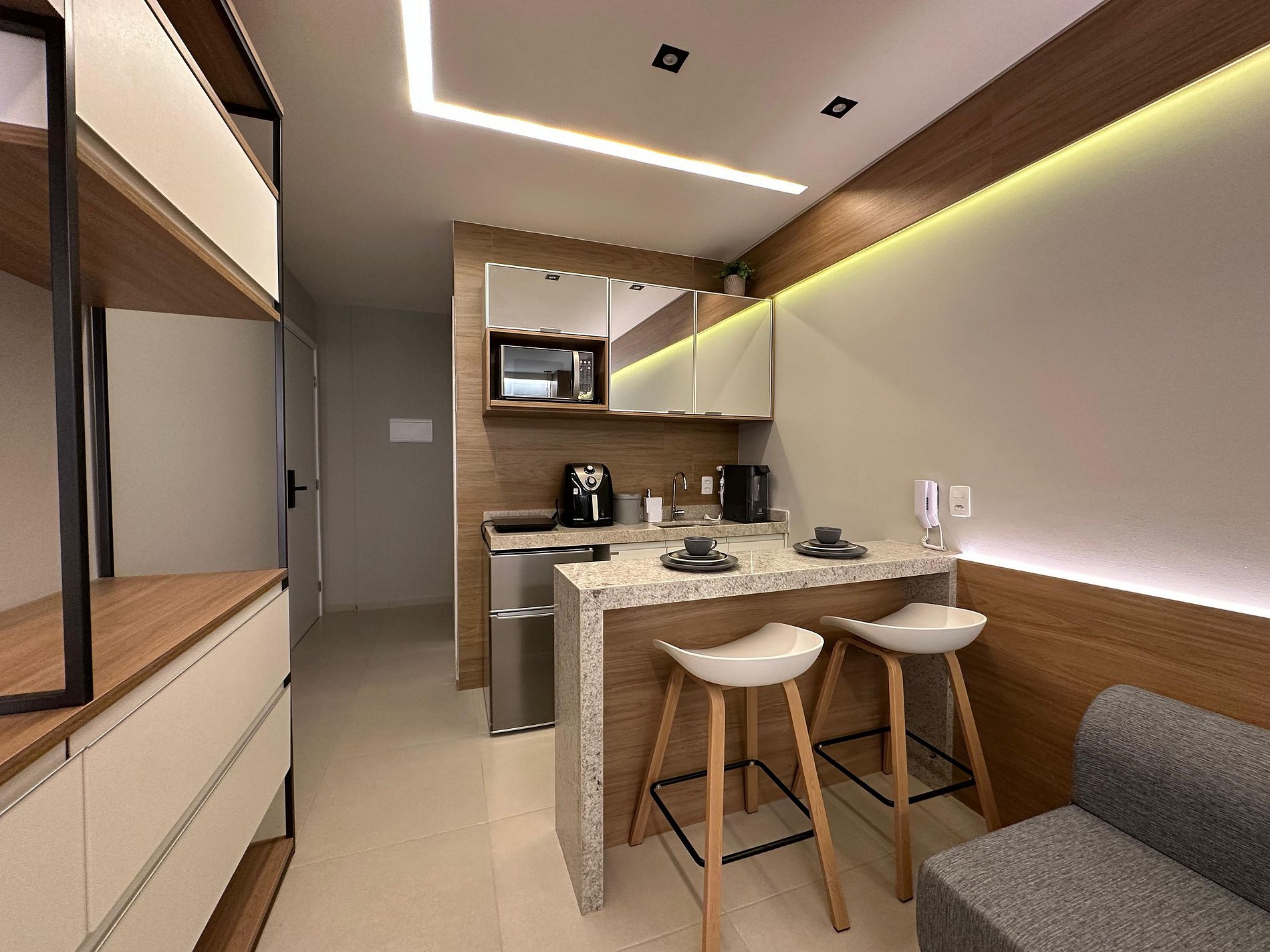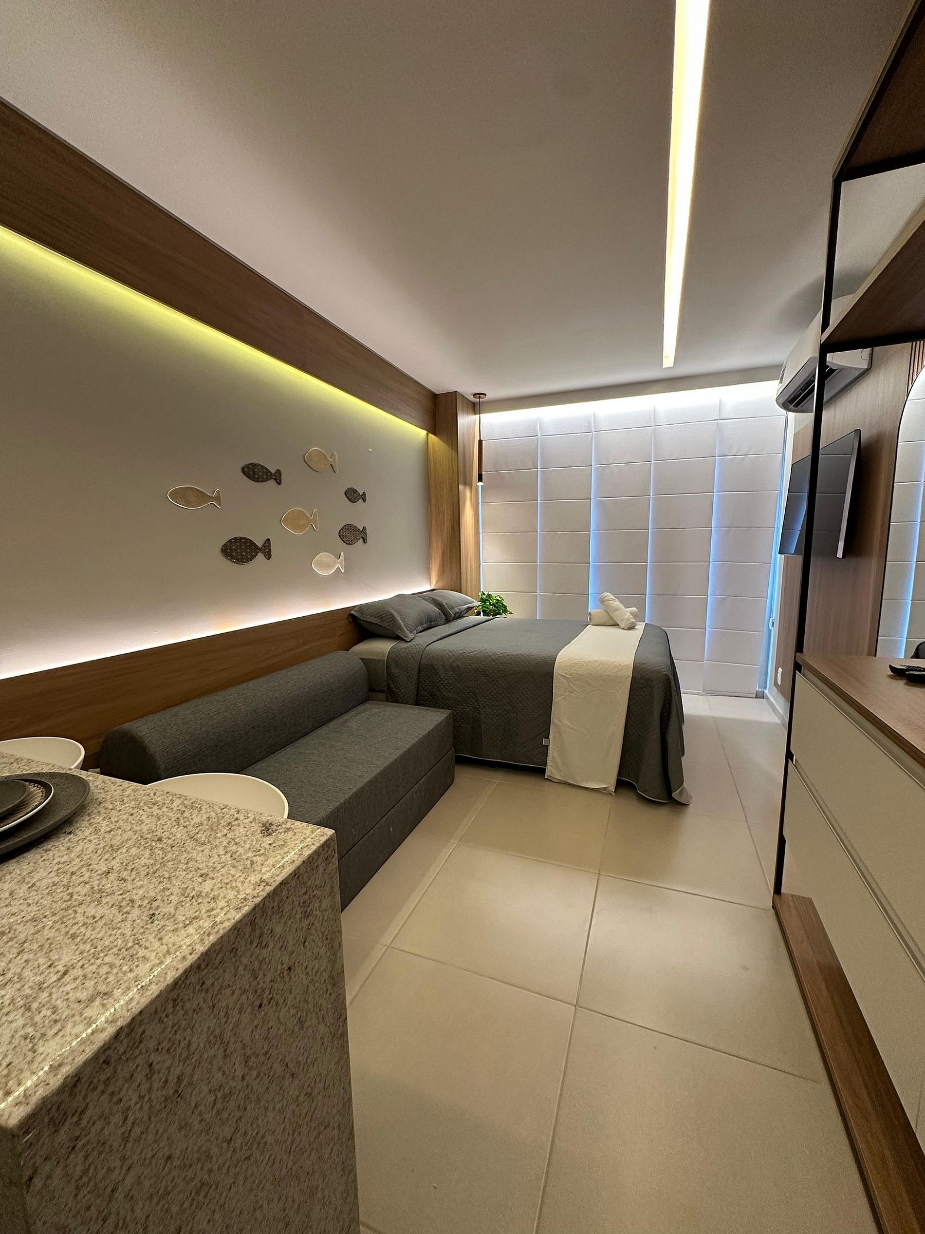 Nosso flat conta com apartamentos bem equipados, projetados para proporcionar a você o máximo de conforto. Cada unidade possui ar-condicionado, Wi-Fi gratuito, TV de tela plana e uma cozinha compacta, facilitando sua estadia. Descanse em camas confortáveis e aproveite os detalhes que tornam seu refúgio ainda mais especial.