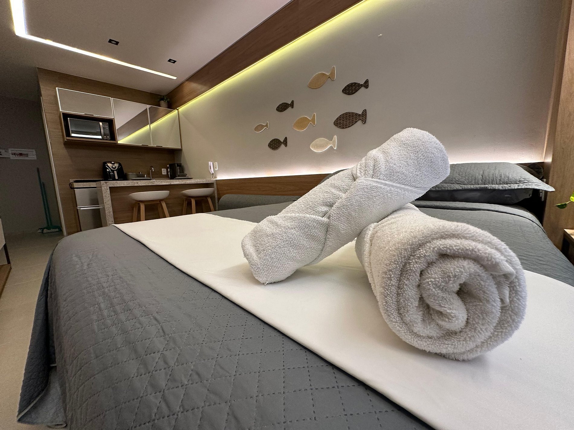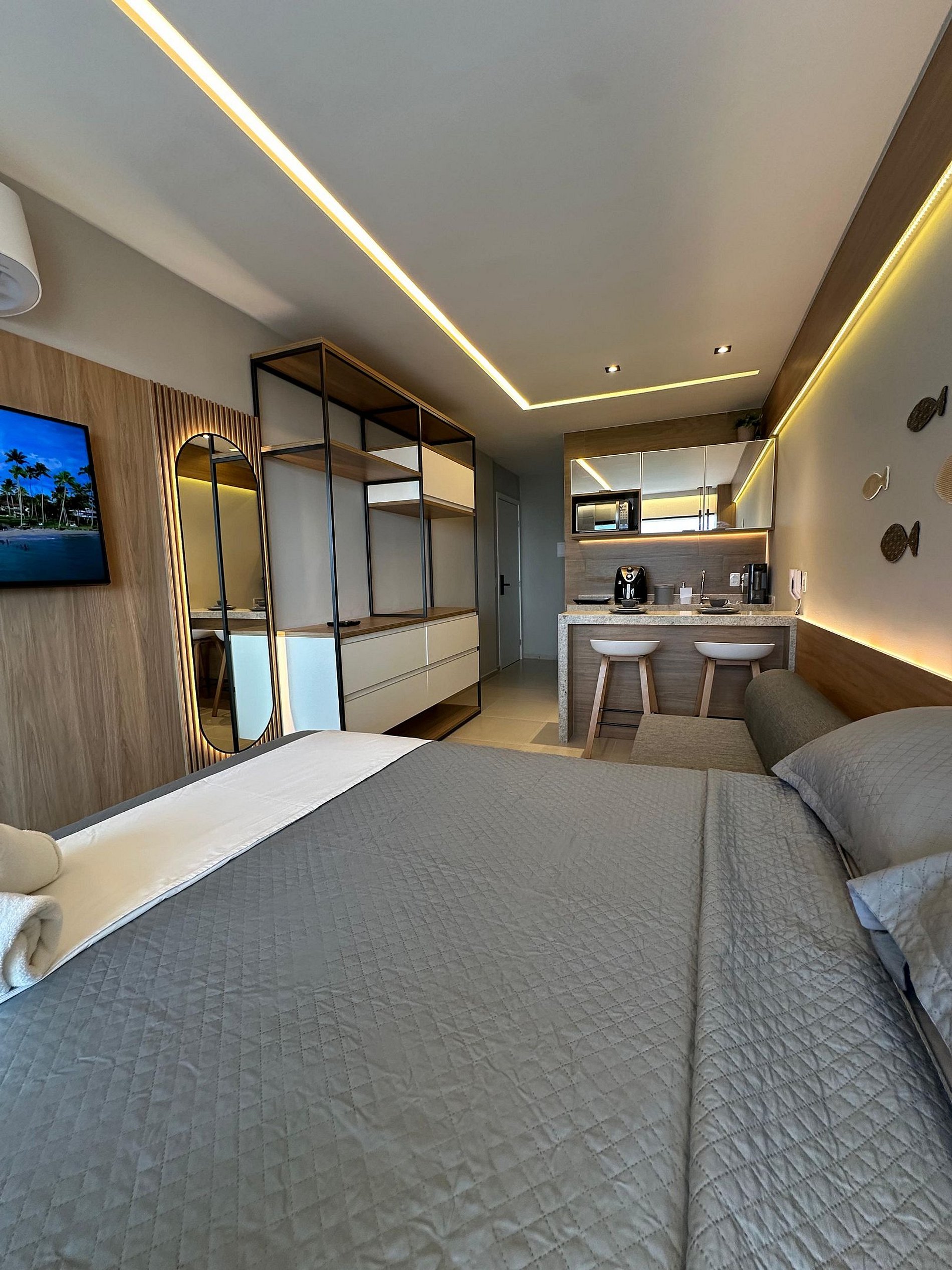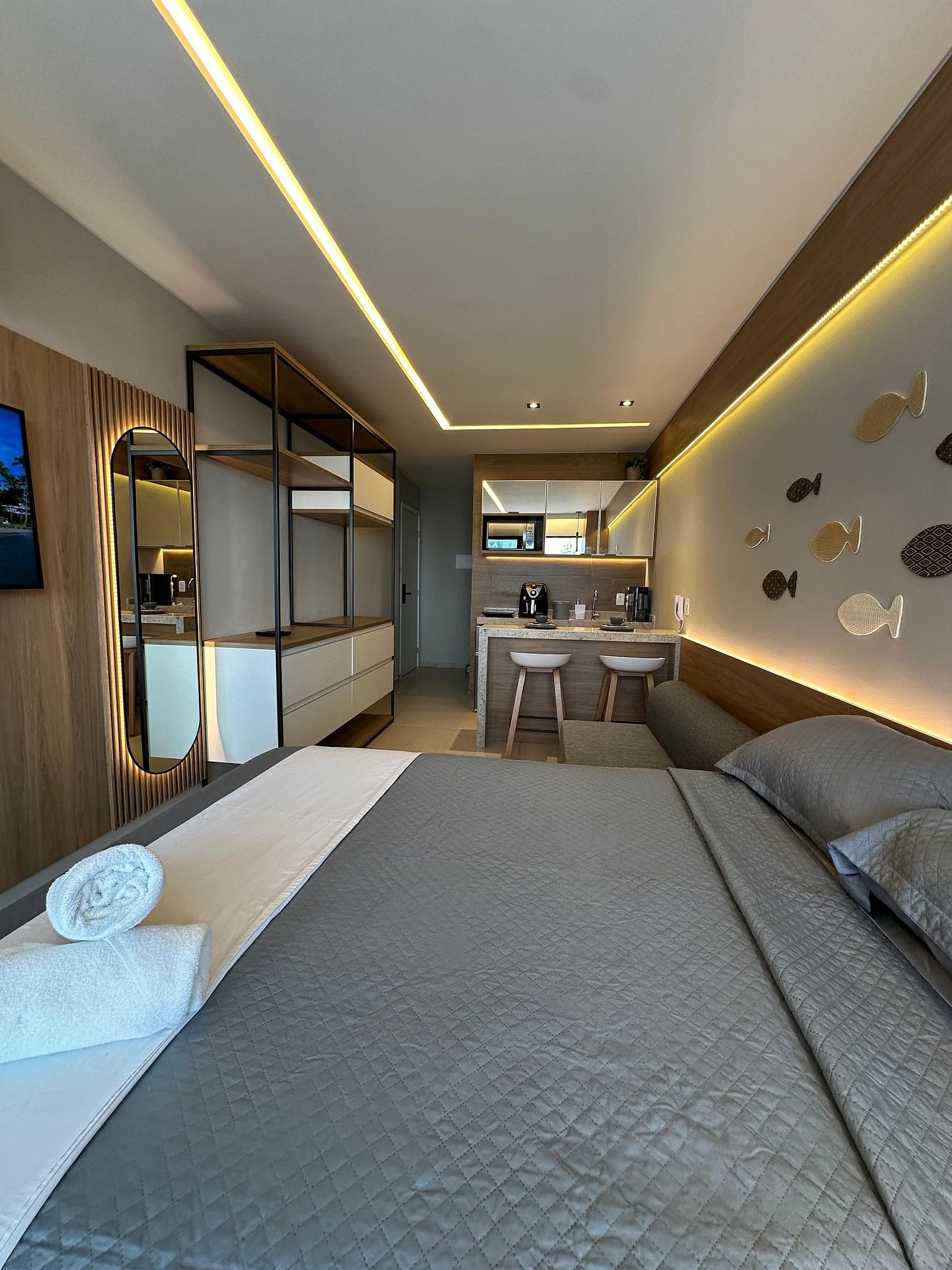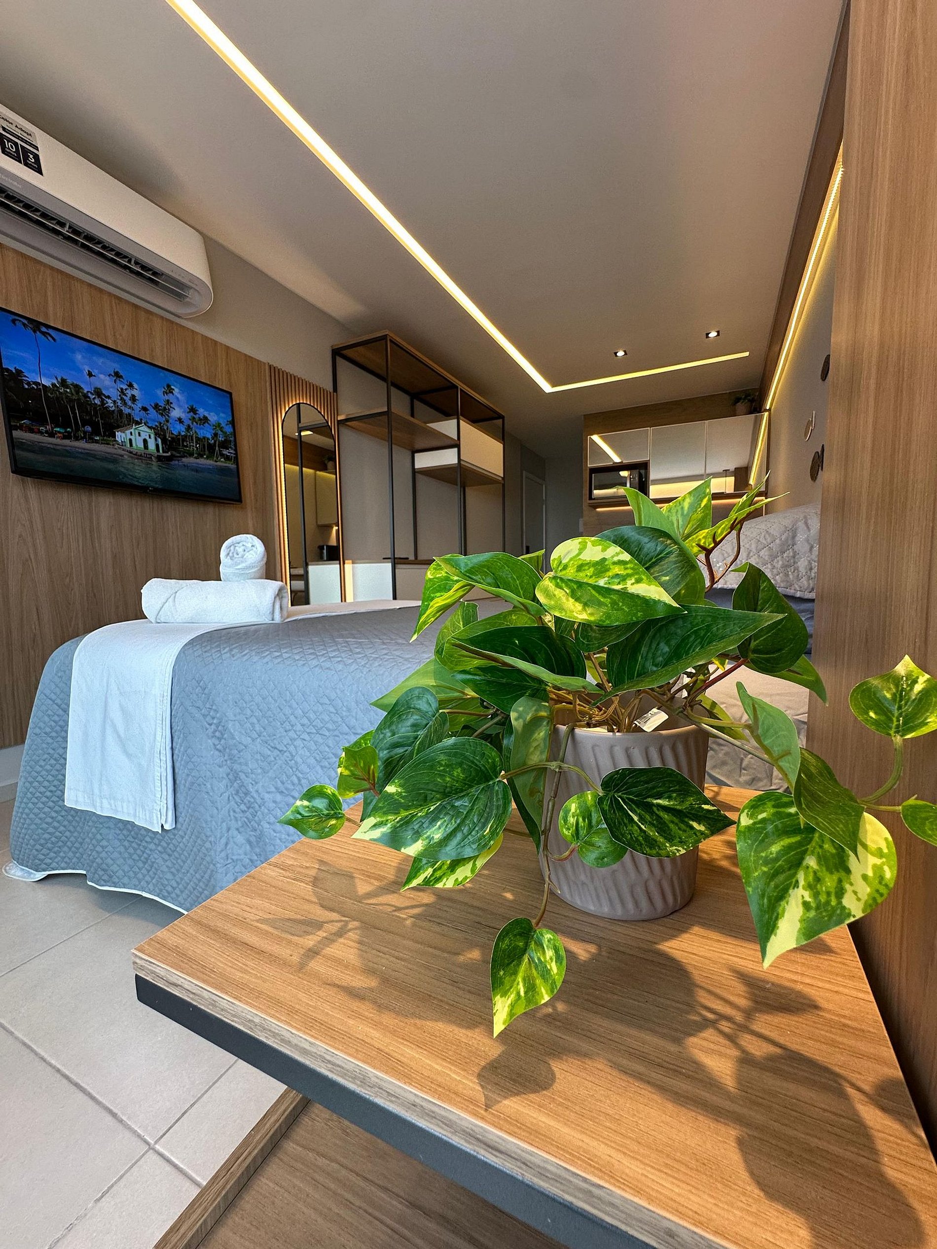 Nosso flat conta com apartamentos bem equipados, projetados para proporcionar a você o máximo de conforto. Cada unidade possui ar-condicionado, Wi-Fi gratuito, TV de tela plana e uma cozinha compacta, facilitando sua estadia. Descanse em camas confortáveis e aproveite os detalhes que tornam seu refúgio ainda mais especial.