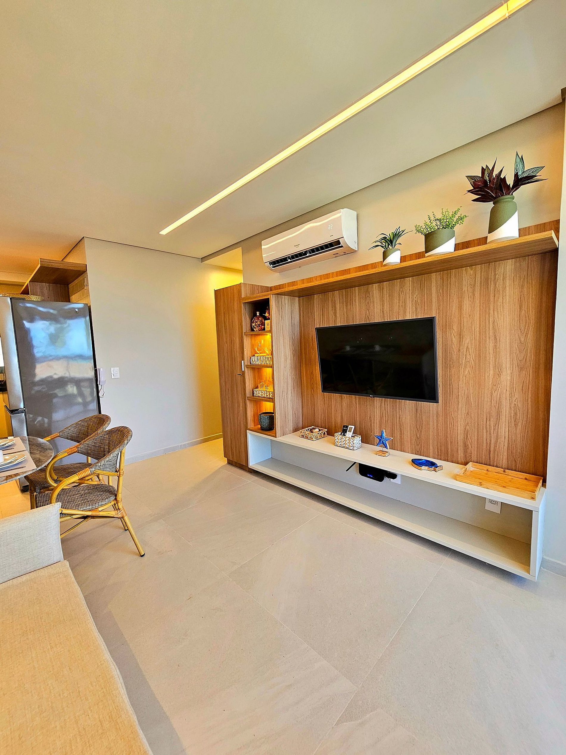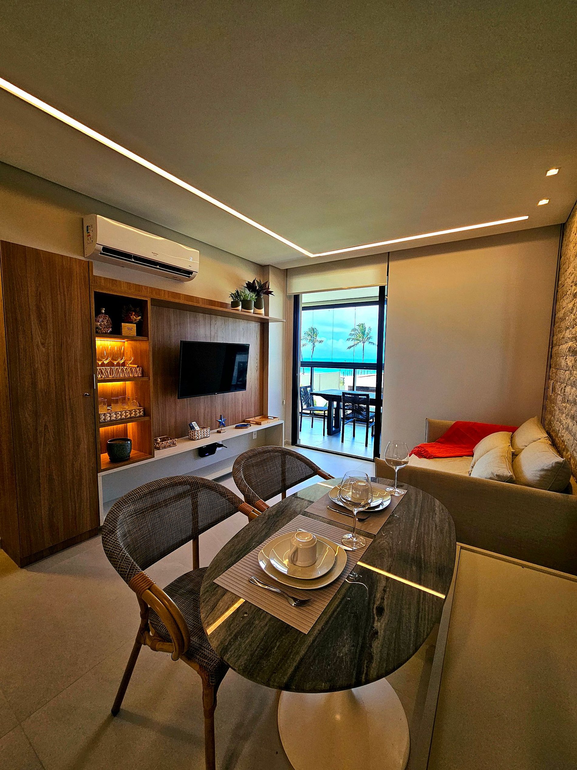 ar condicionado em todos os quartos e também na sala, acomodamos até 6 pessoas (Temos uma excelente cama de casal na suíte principal, 2 camas de solteiro e uma auxiliar de solteiro na segunda suíte e 1 sofá cama na sala), temos cozinha completa e equipada, além de uma estrutura completa que o nosso condomínio proporciona, incluindo mesas e cadeiras em um deck beira-mar.