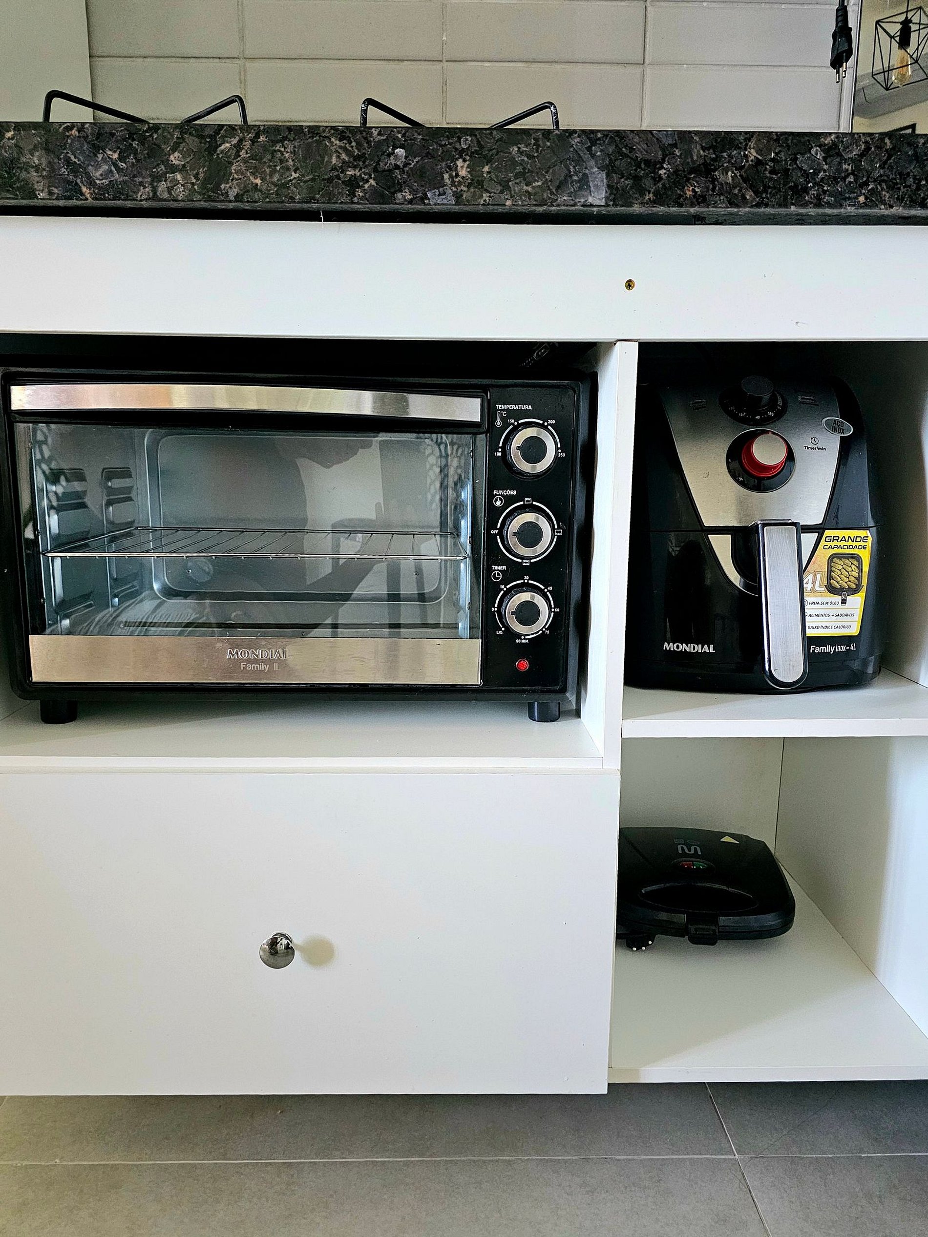 A cozinha completa é equipada com os principais eletrodomésticos, como geladeira, microondas, cooktop, forno elétrico, airfryer, liquidificador e sanduicheira, além de todos os utensílios necessários para que você possa preparar suas refeições de maneira prática e confortável. O espaço foi projetado para que você tenha tudo o que precisa ao seu alcance, garantindo uma estadia funcional e aconchegante.