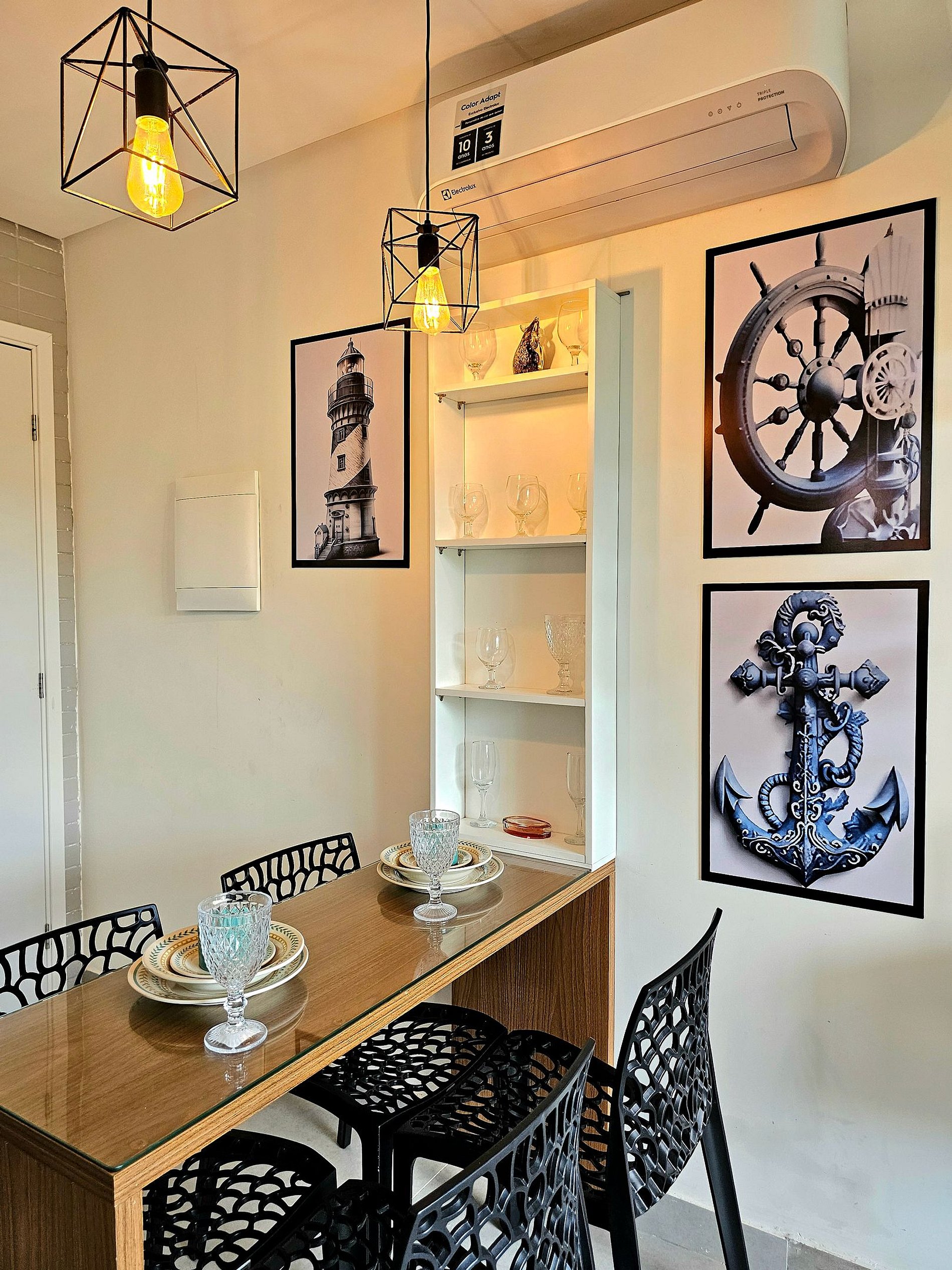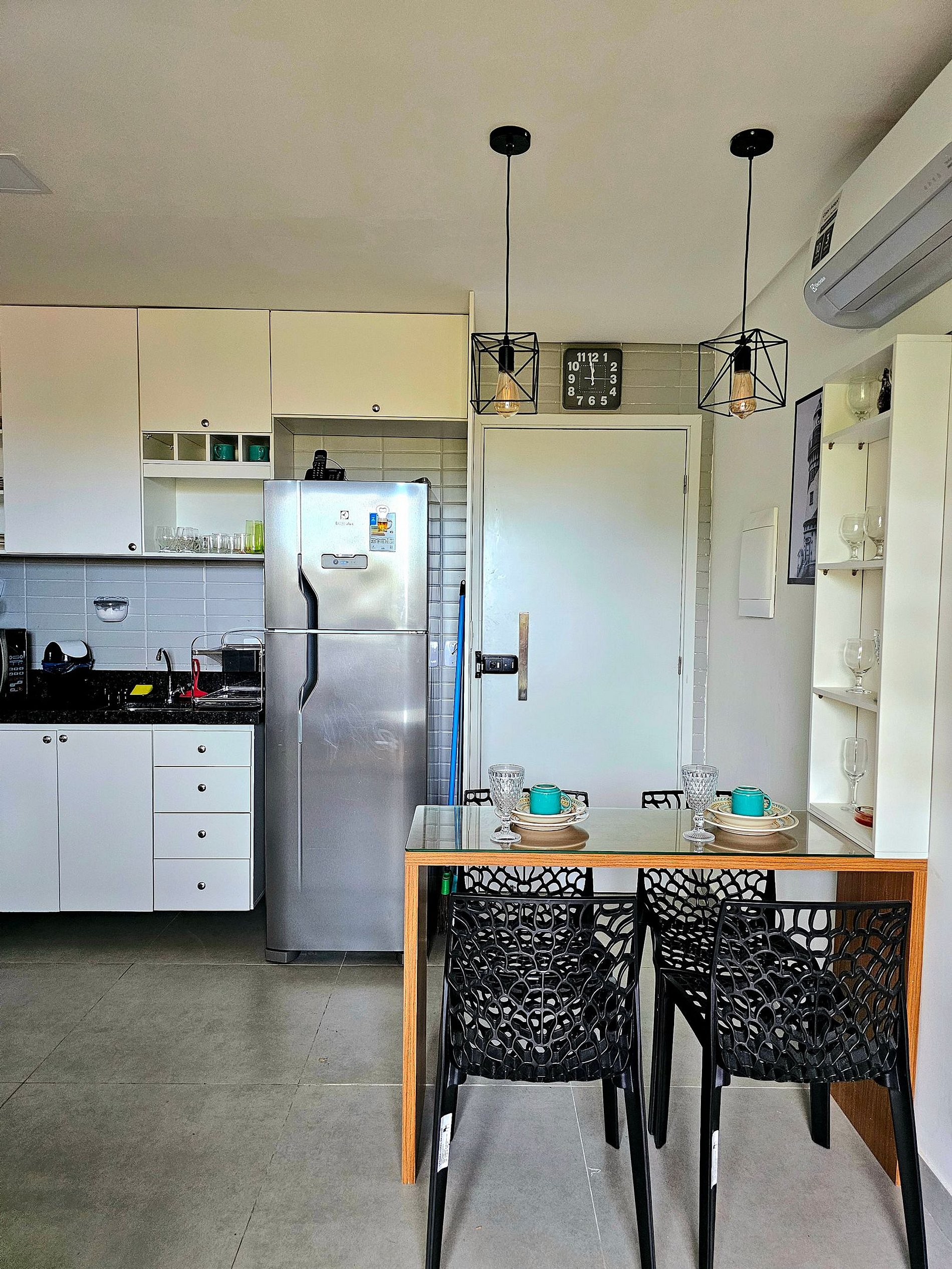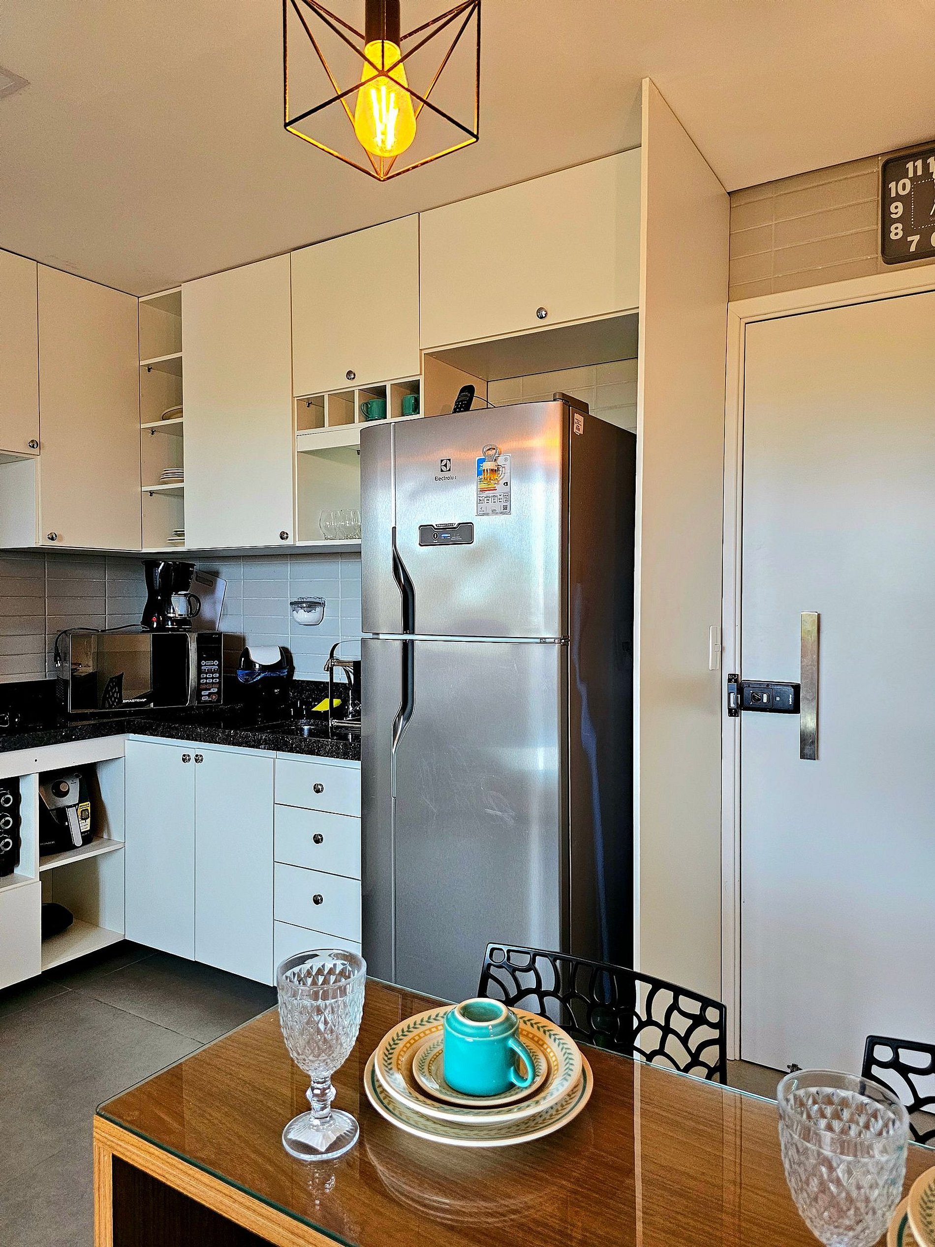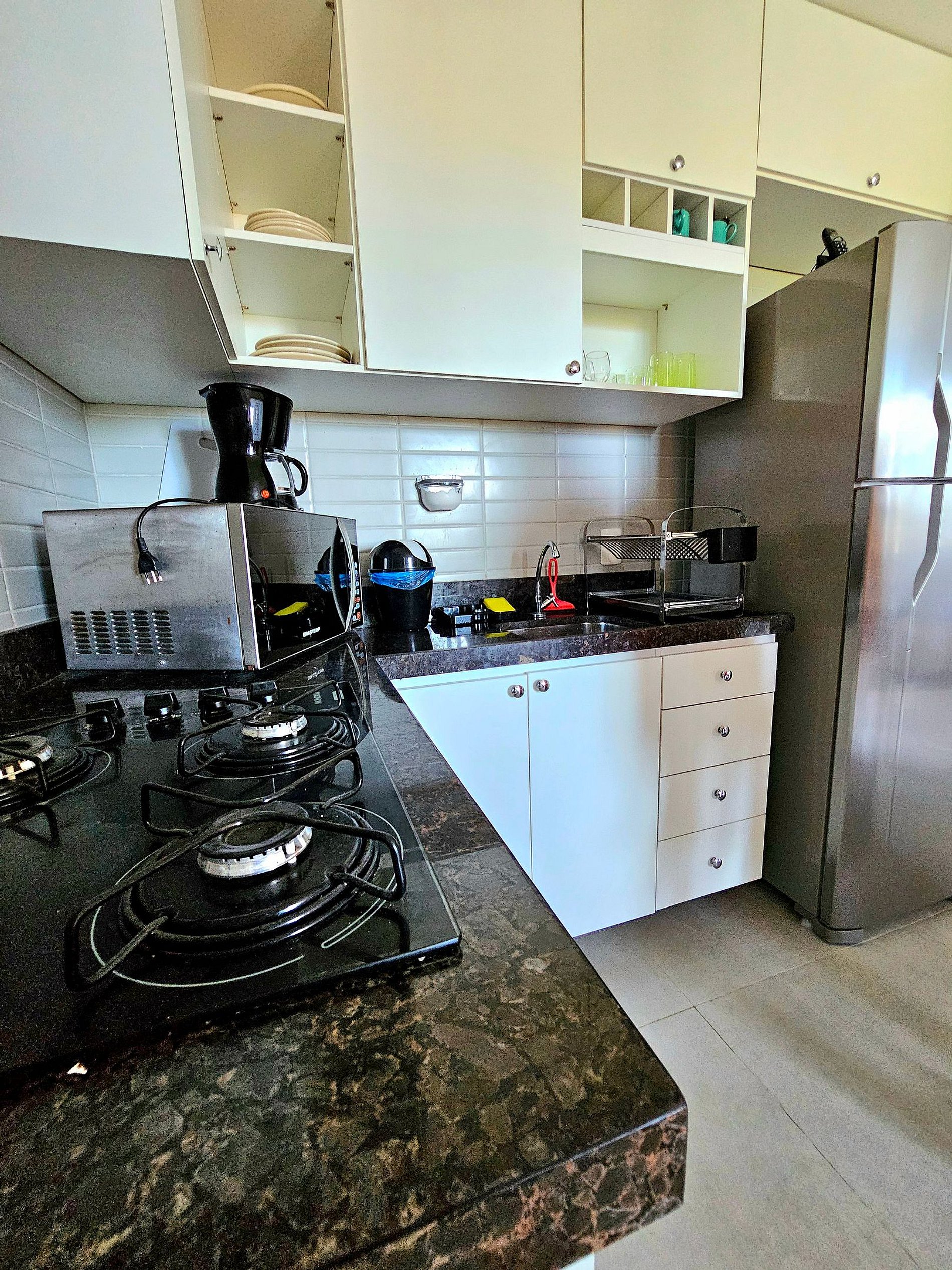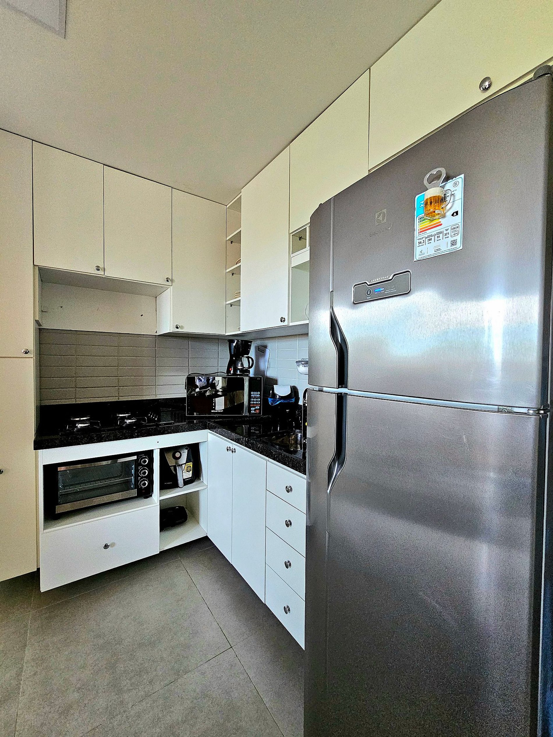 A cozinha completa é equipada com os principais eletrodomésticos, como geladeira, microondas, cooktop, forno elétrico, airfryer, liquidificador e sanduicheira, além de todos os utensílios necessários para que você possa preparar suas refeições de maneira prática e confortável. O espaço foi projetado para que você tenha tudo o que precisa ao seu alcance, garantindo uma estadia funcional e aconchegante.