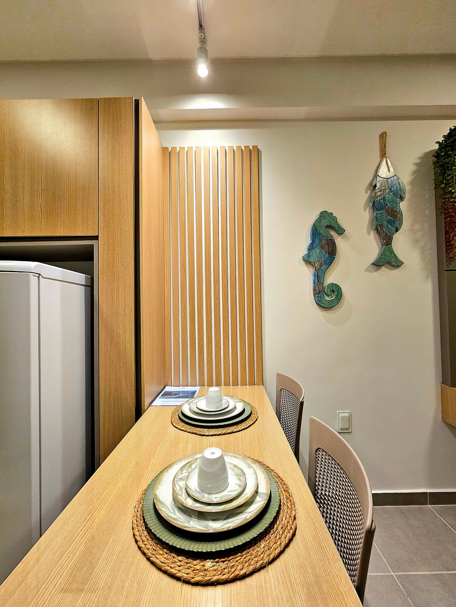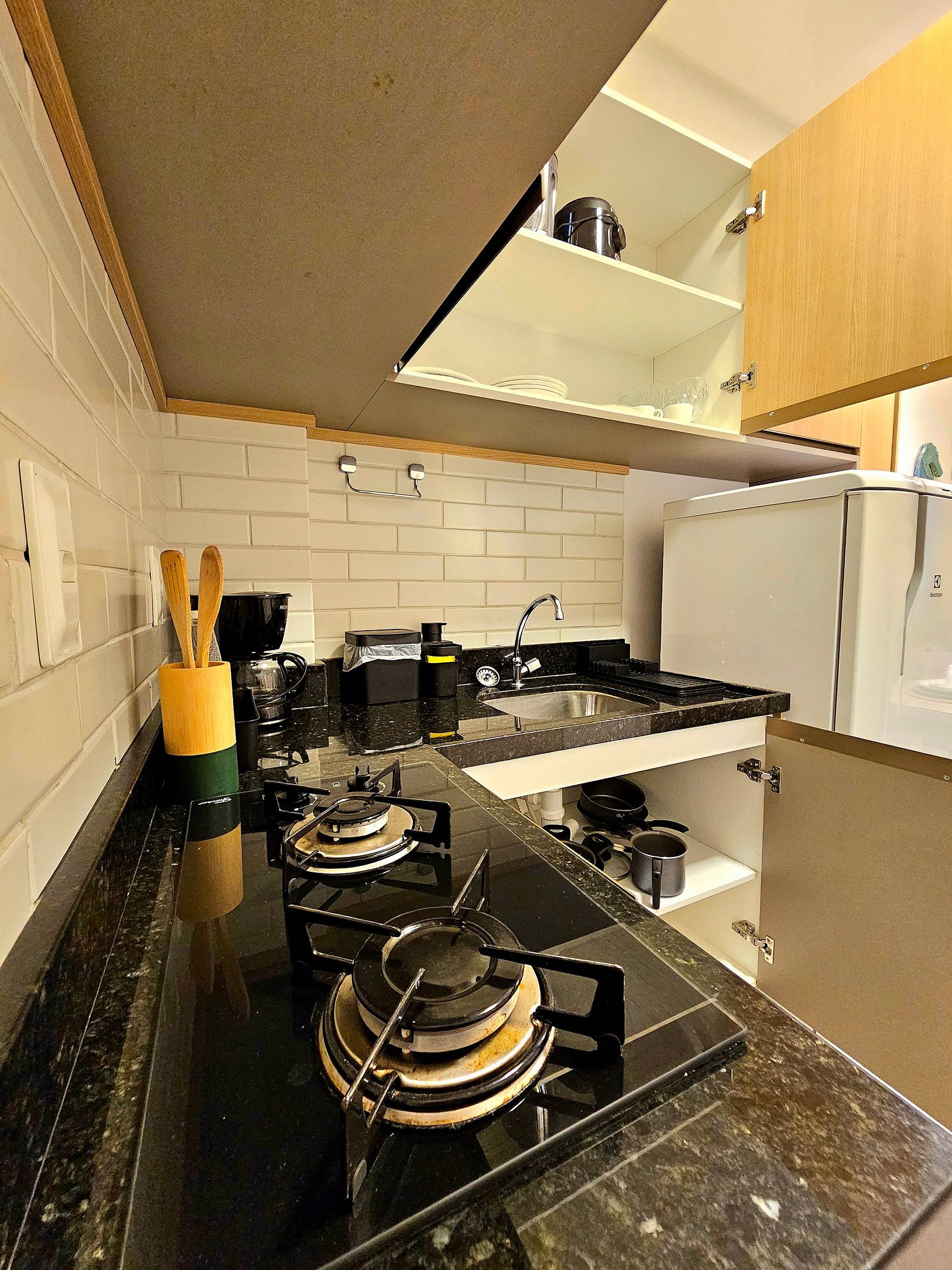 - Cozinha equipada com cooktop, airfryer, micro-ondas, cafeteira, sanduicheira, liquidificador.
