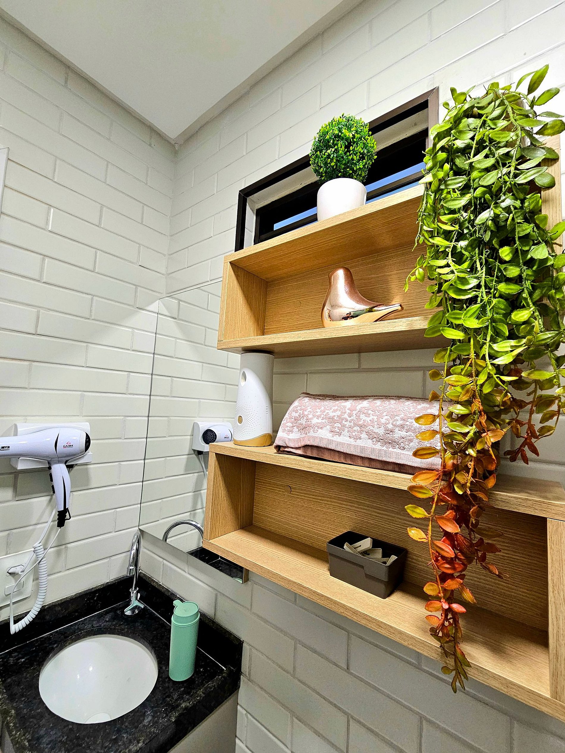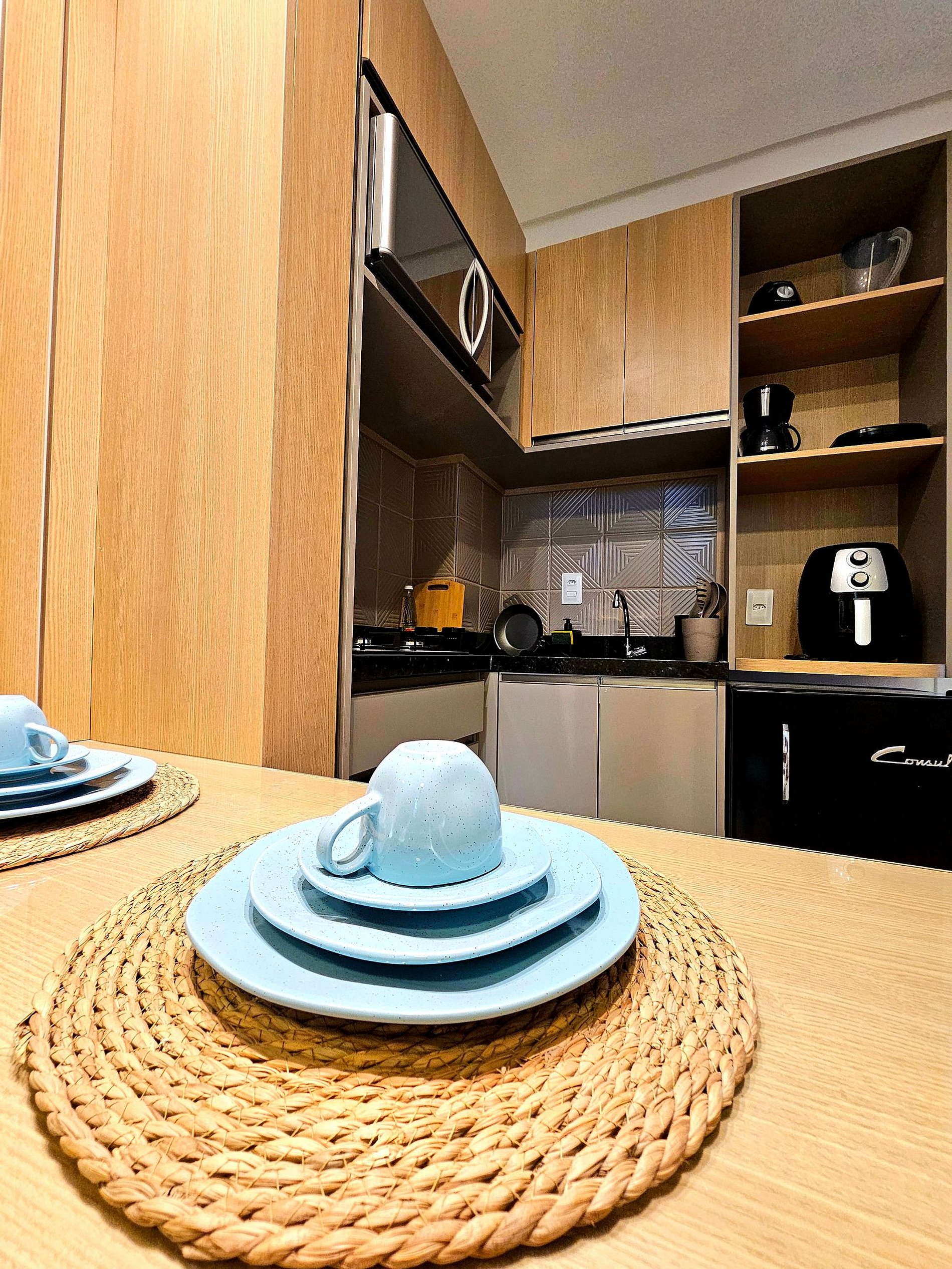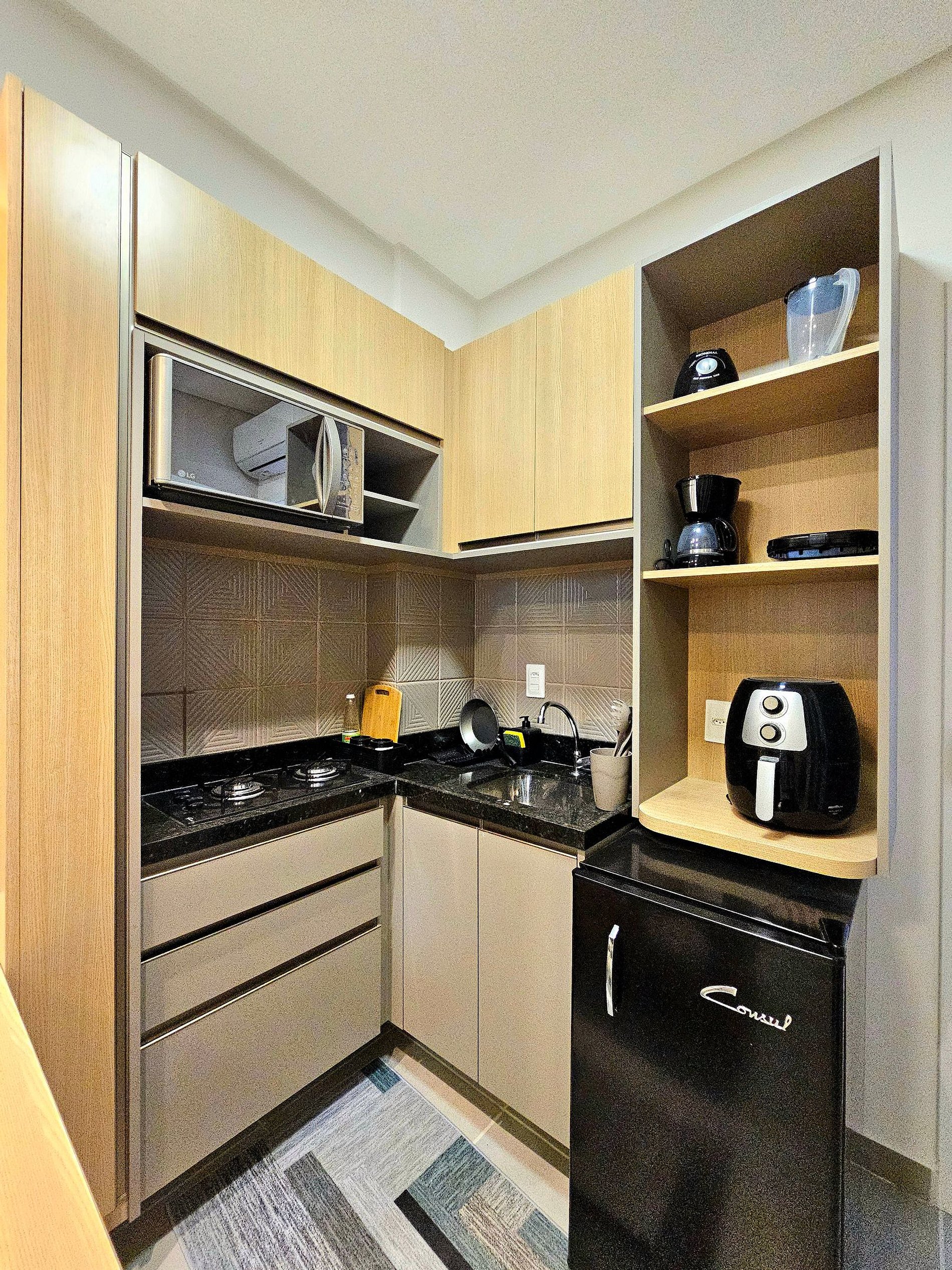 - Cozinha equipada com cooktop, airfryer, micro-ondas, cafeteira, sanduicheira, liquidificador.