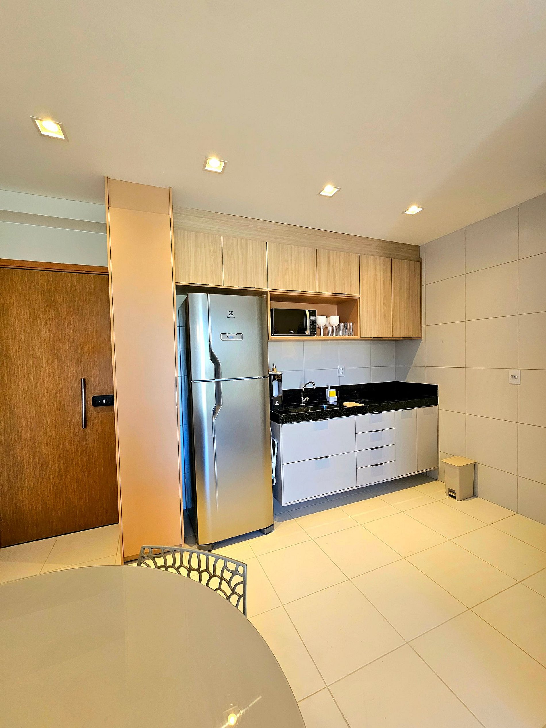 A cozinha completa é equipada com os principais eletrodomésticos, como geladeira, microondas, cooktop, liquidificador e sanduicheira, além de todos os utensílios necessários para que você possa preparar suas refeições de maneira prática e confortável.