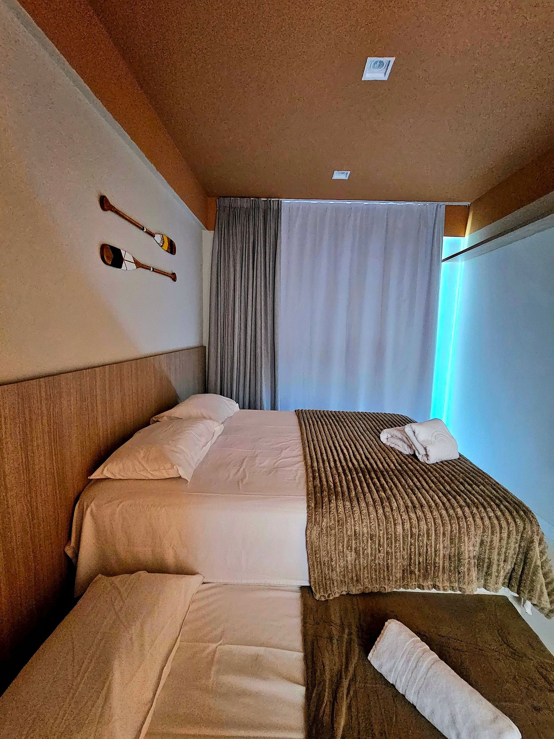 Com 2 quartos (1 deles suíte + 1 Bwc social), acomodamos 1 casal em excelente cama de casal e mais um terceiro adulto ou criança ao lado da cama de casal com colchão extra em cada um dos quartos, acomodando confortavelmente até 6 hóspedes.