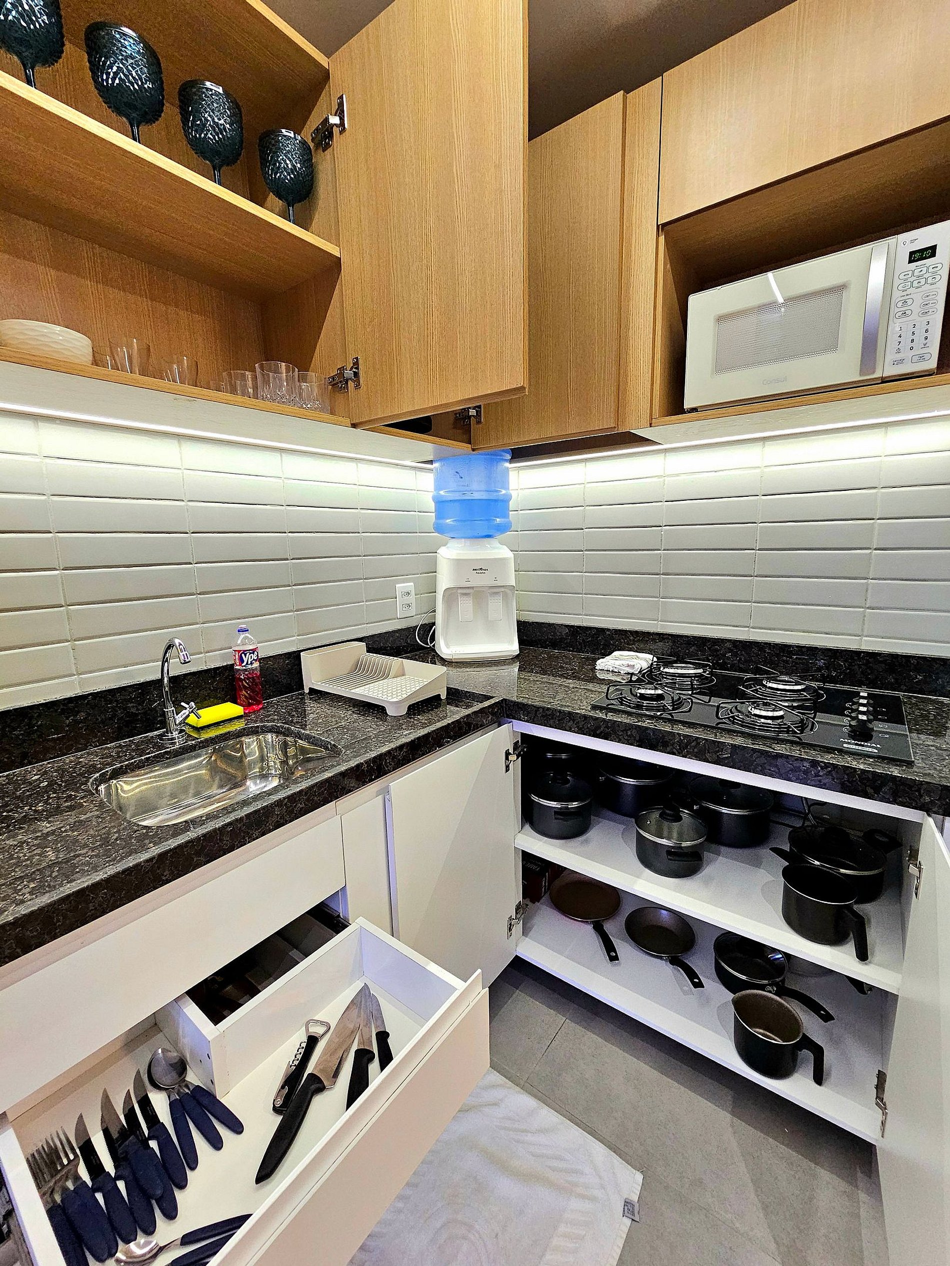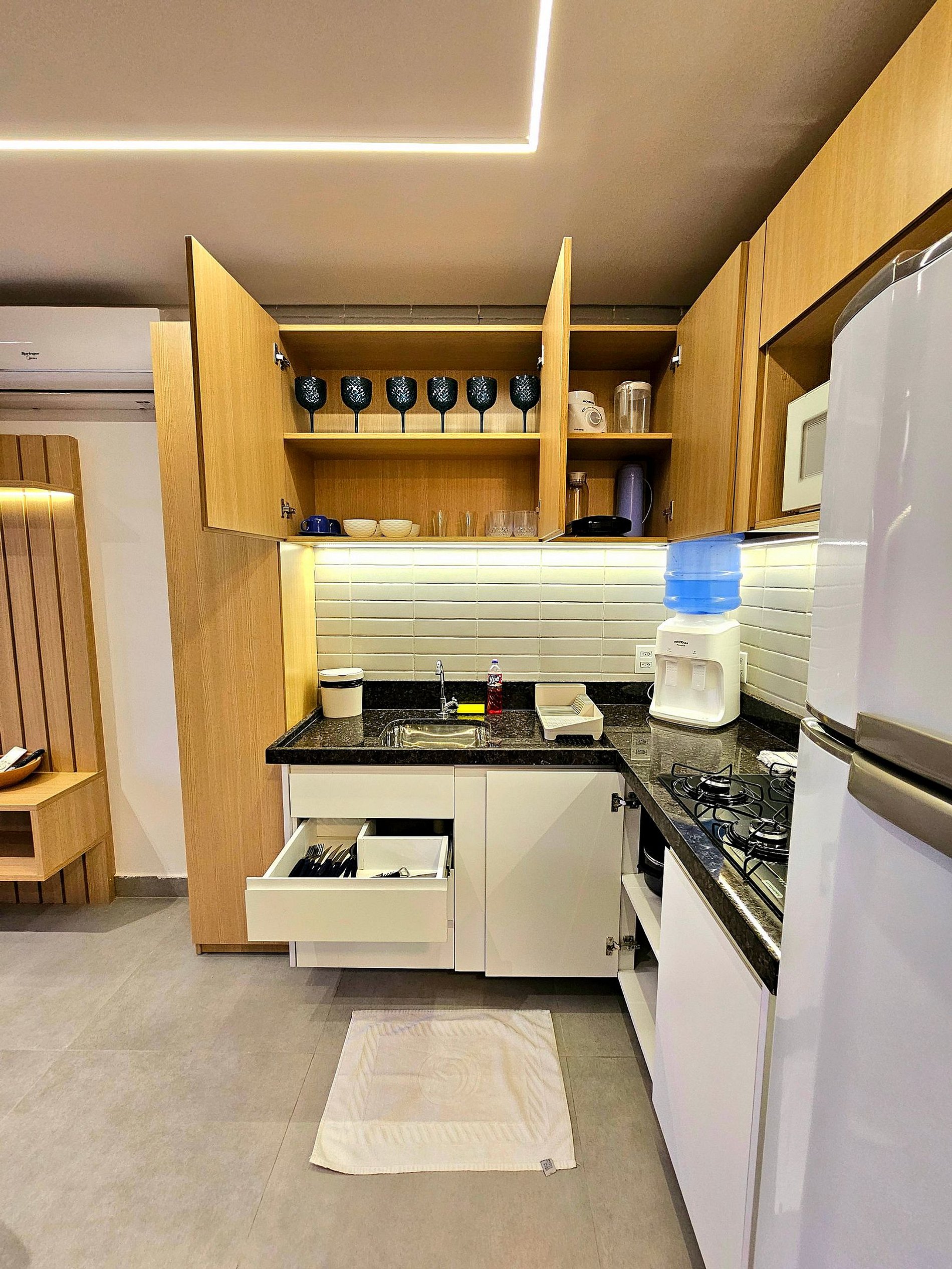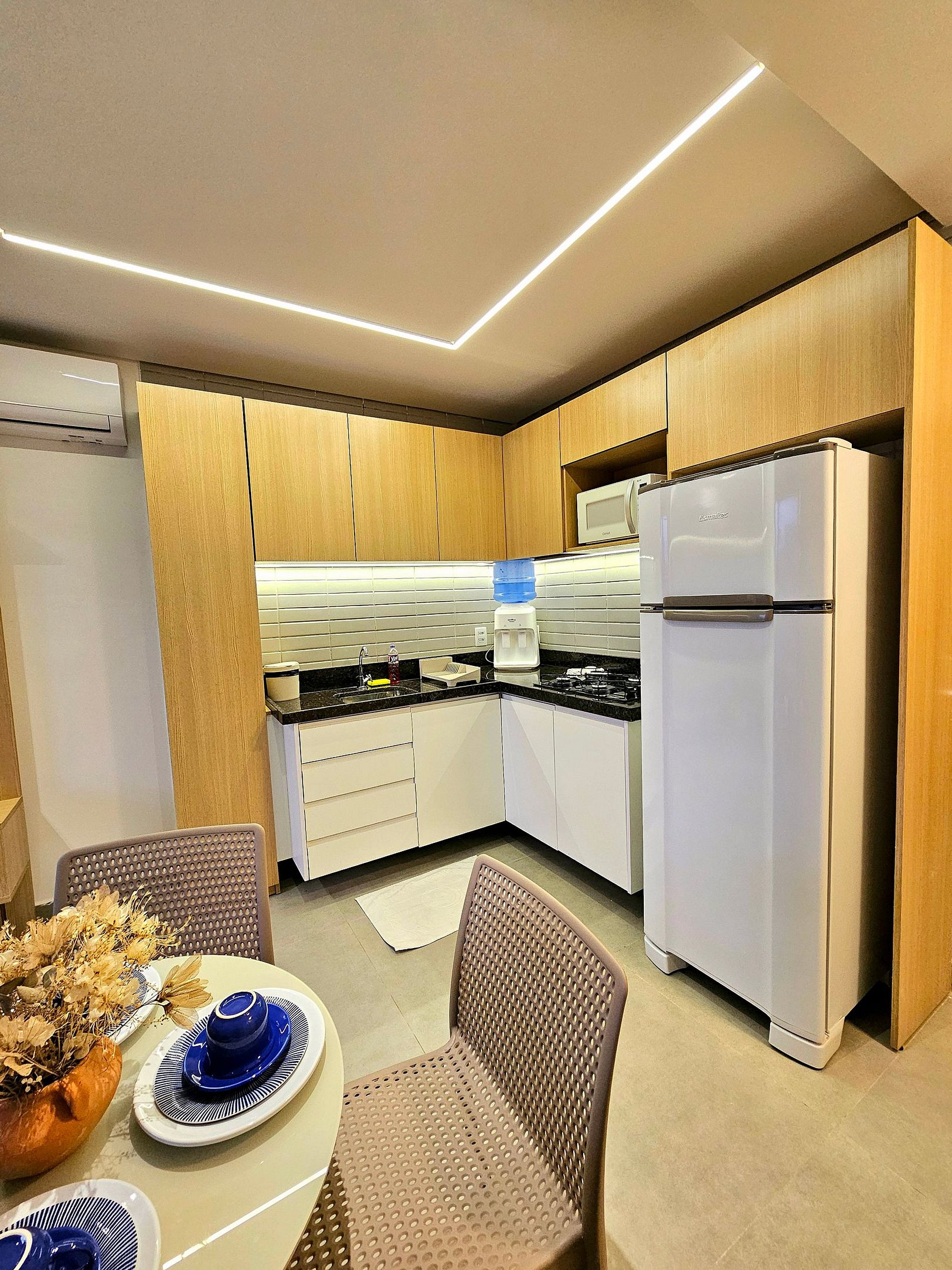A cozinha completa é equipada com os principais eletrodomésticos, como geladeira, microondas, cooktop, liquidificador e sanduicheira, além de todos os utensílios necessários para que você possa preparar suas refeições de maneira prática e confortável. O espaço foi projetado para que você tenha tudo o que precisa ao seu alcance, garantindo uma estadia funcional e aconchegante.