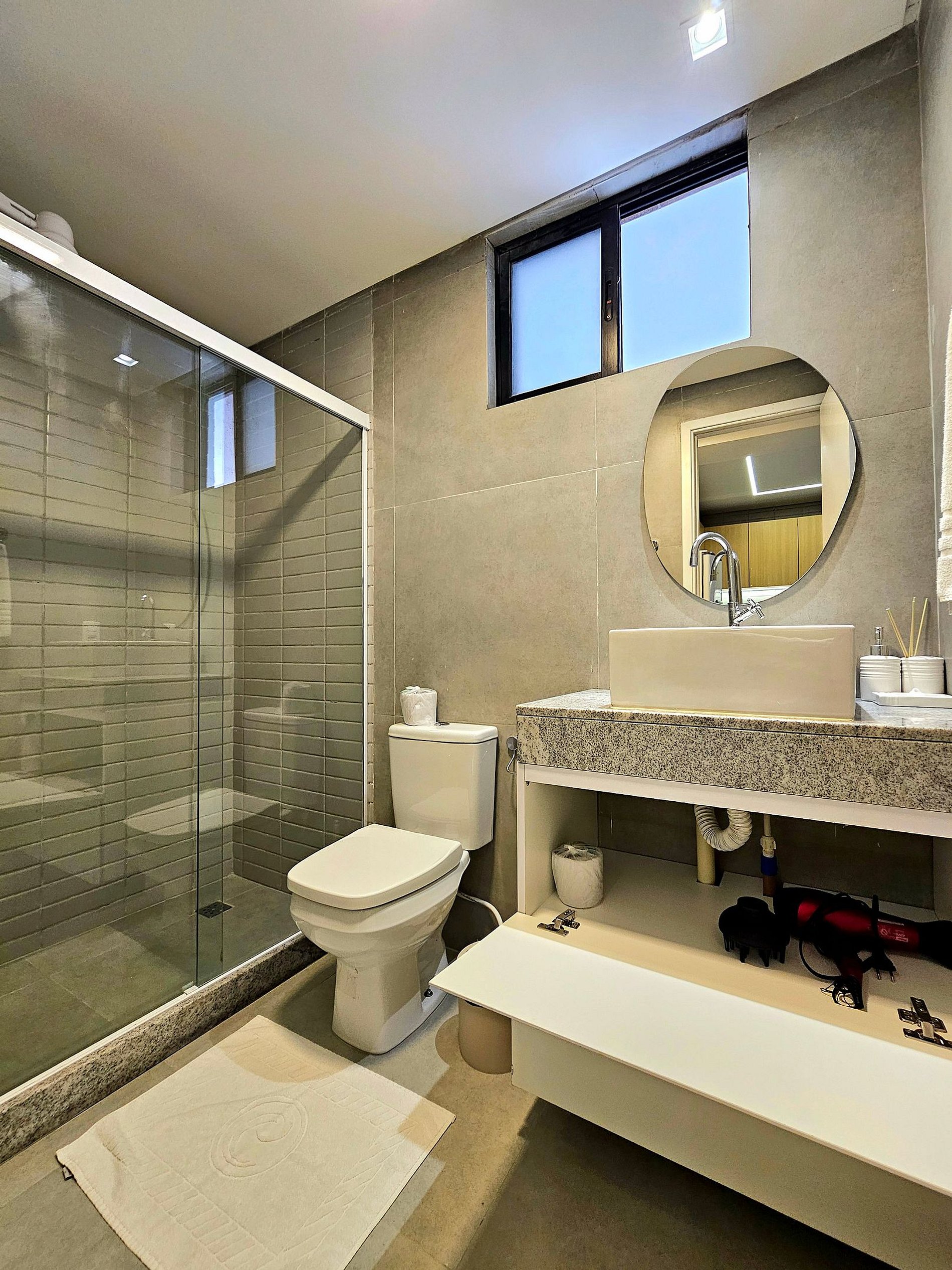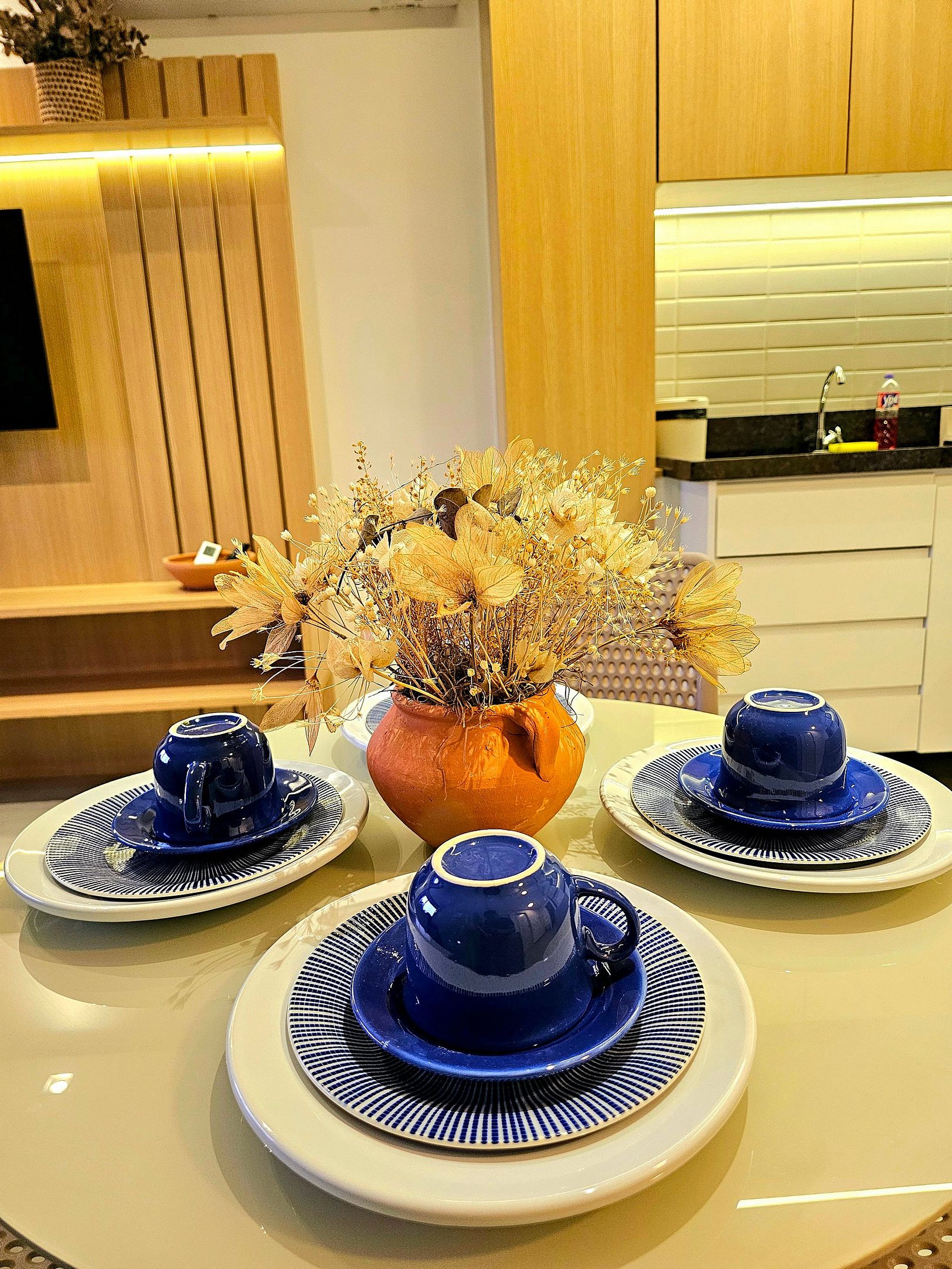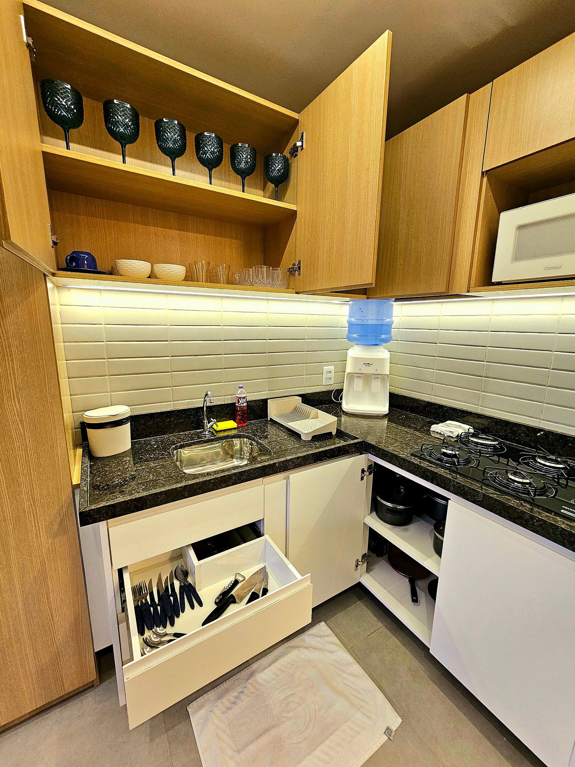 A cozinha completa é equipada com os principais eletrodomésticos, como geladeira, microondas, cooktop, liquidificador e sanduicheira, além de todos os utensílios necessários para que você possa preparar suas refeições de maneira prática e confortável. O espaço foi projetado para que você tenha tudo o que precisa ao seu alcance, garantindo uma estadia funcional e aconchegante.