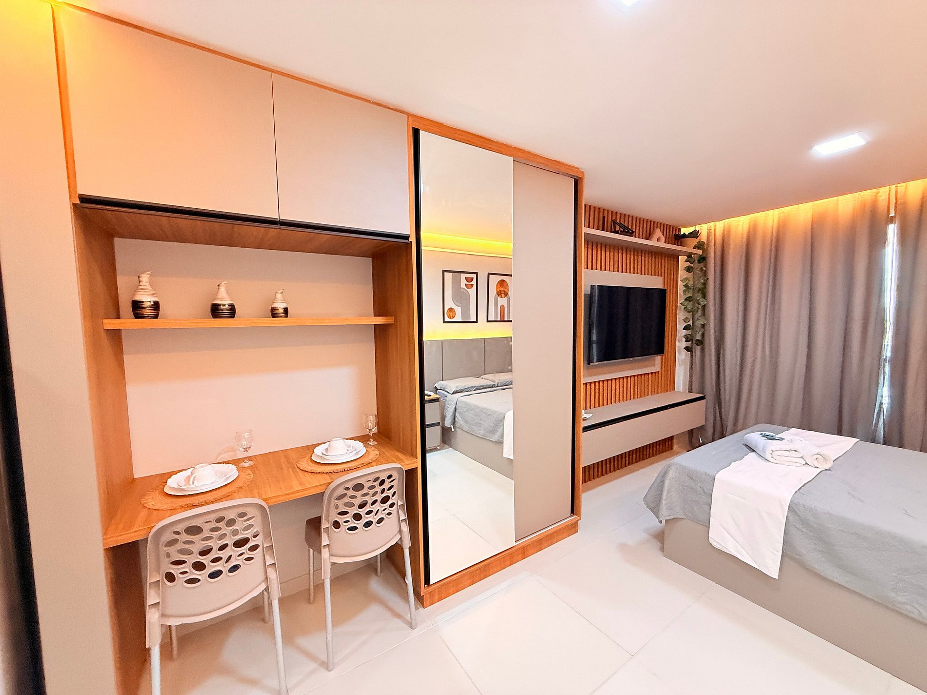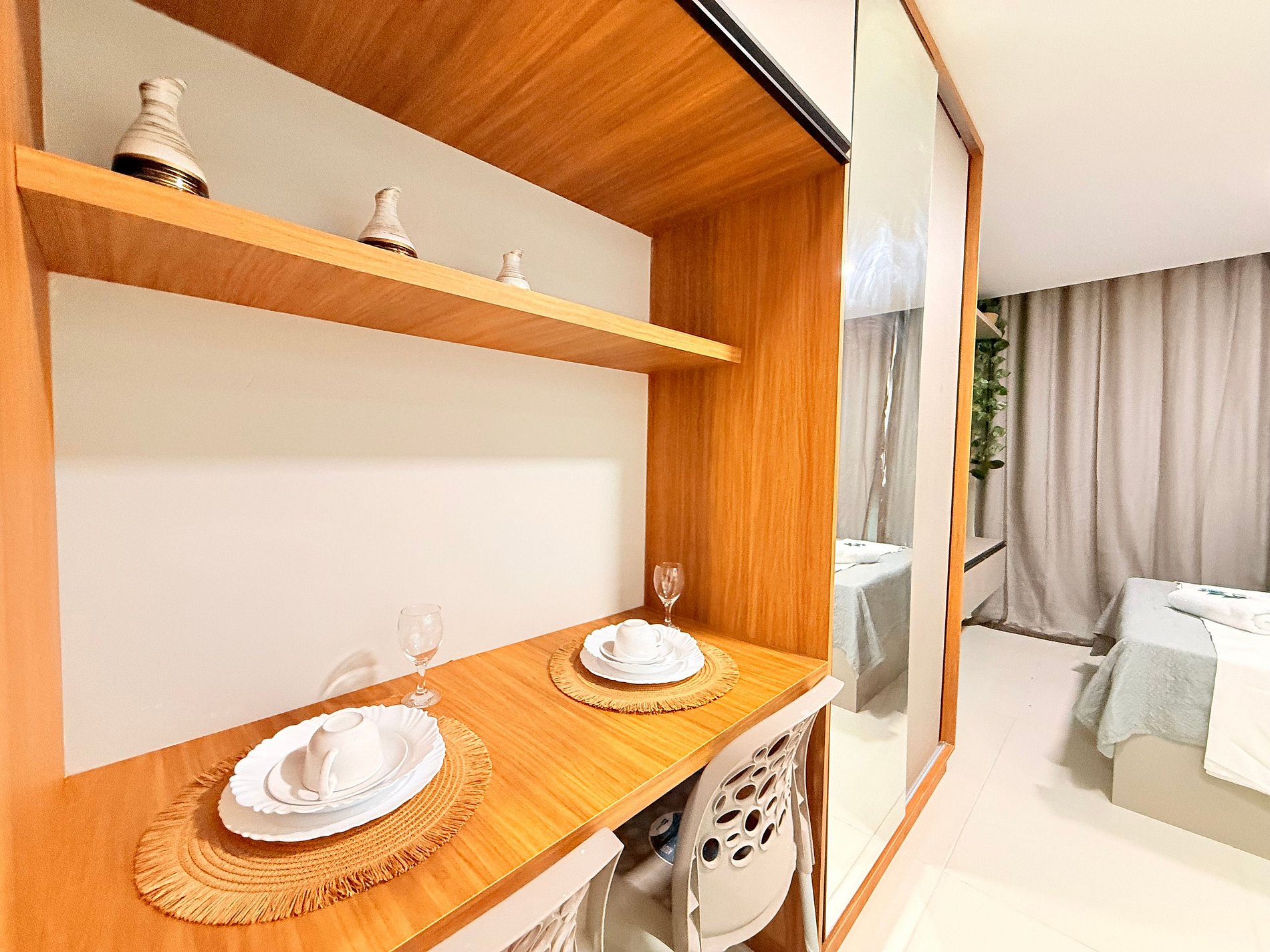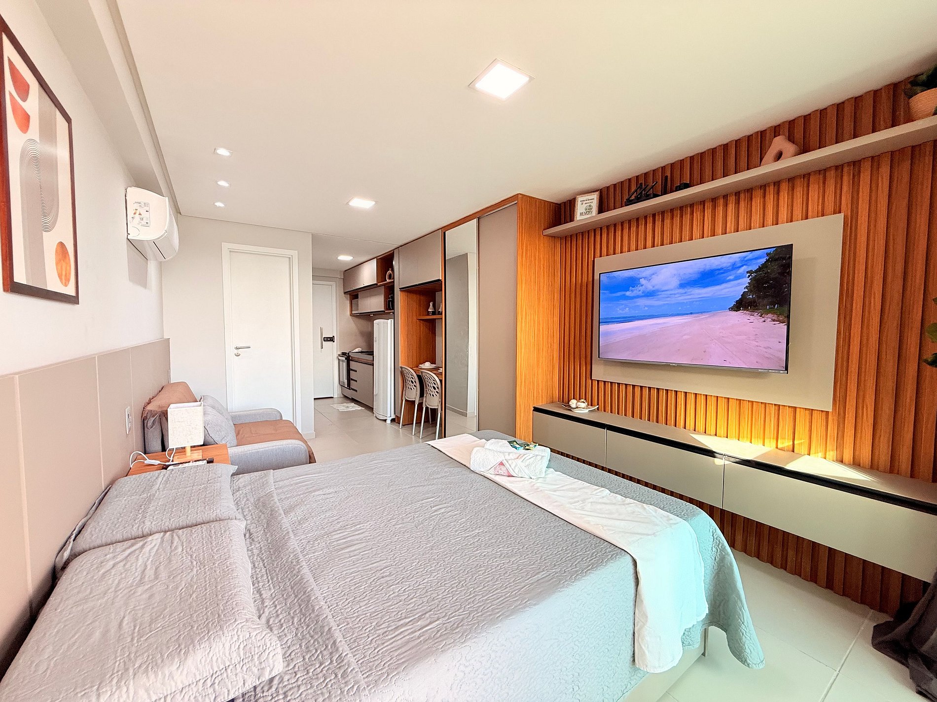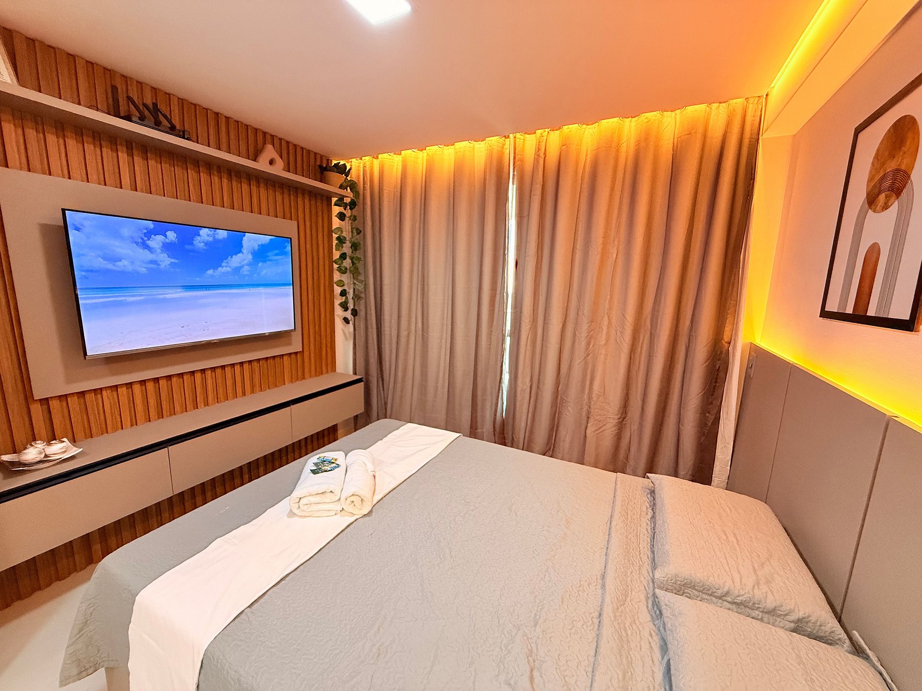 O interior do flat combina conforto e estilo em um ambiente integrado. Conta com uma cama de casal extremamente confortável, uma cama auxiliar e um sofá-cama, além de uma cozinha equipada com eletrodomésticos de alta qualidade, incluindo micro-ondas, geladeira, airfryer, sanduicheira, liquidificador, cafeteira e todos os utensílios (panelas, copos, taças, pratos e talheres) para realizar sua refeição.. O banheiro é moderno e funcional, com chuveiro quente e boa iluminação. O espaço também possui ar-condicionado, Wi-Fi e TV, garantindo comodidade para quem deseja relaxar e desfrutar do ambiente. O Flat também conta com uma varanda com vista para o mar — um convite diário para apreciar o nascer do sol, ouvir o som das ondas e relaxar com a brisa do oceano.