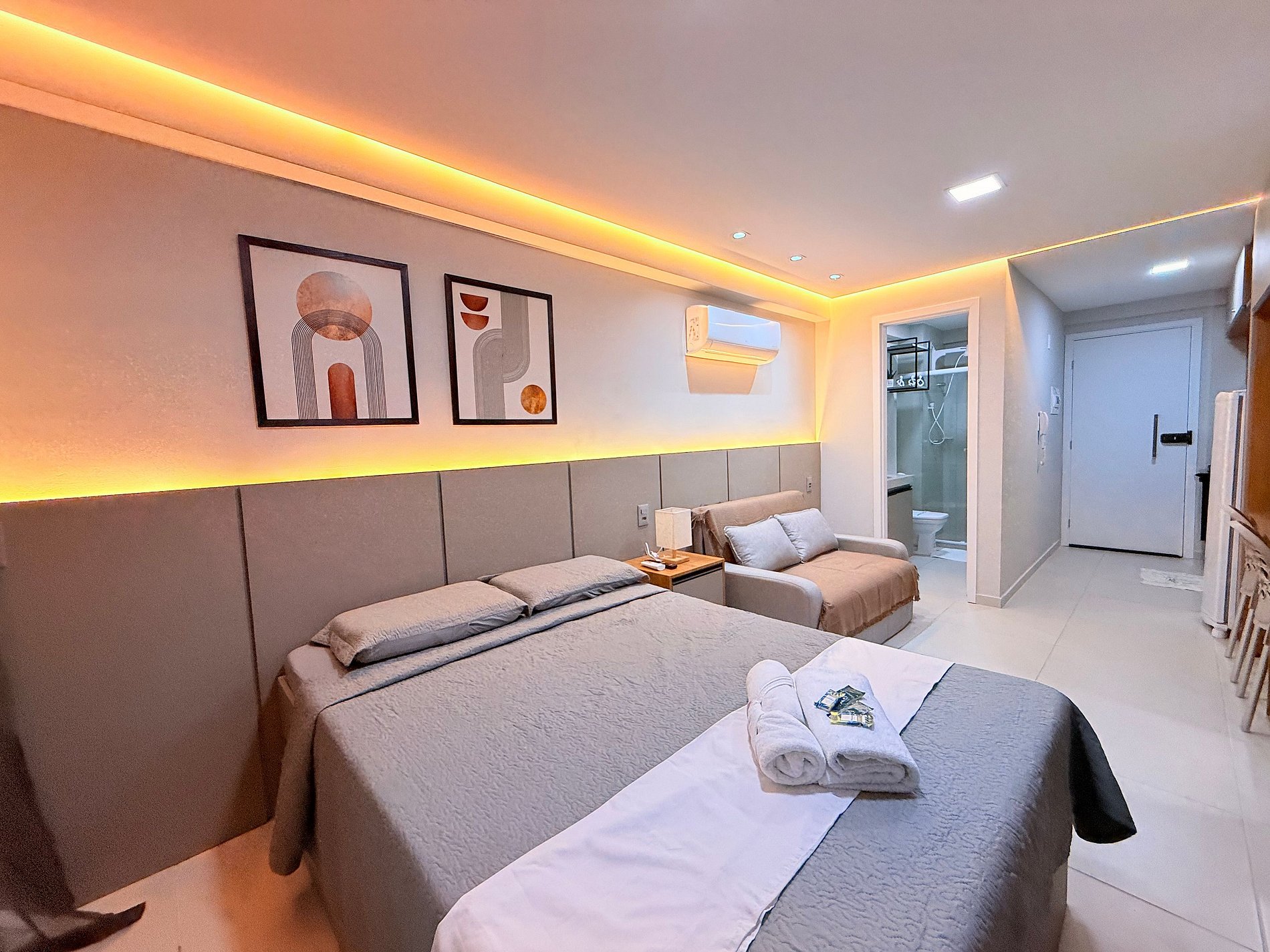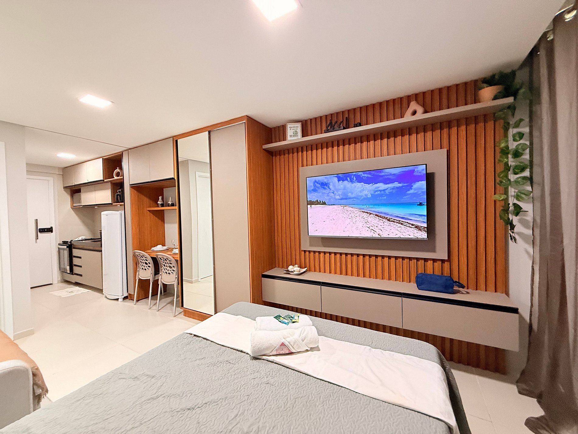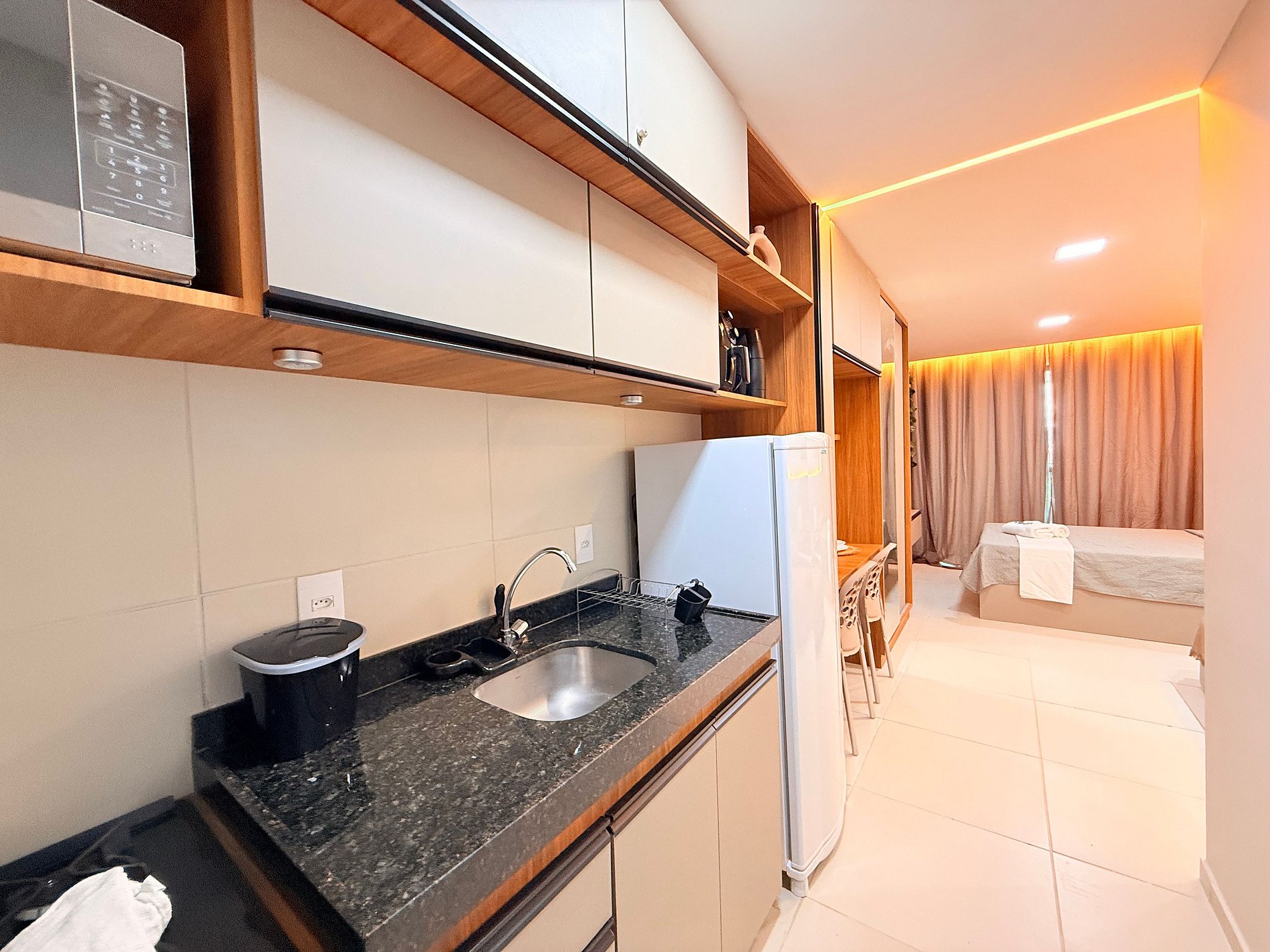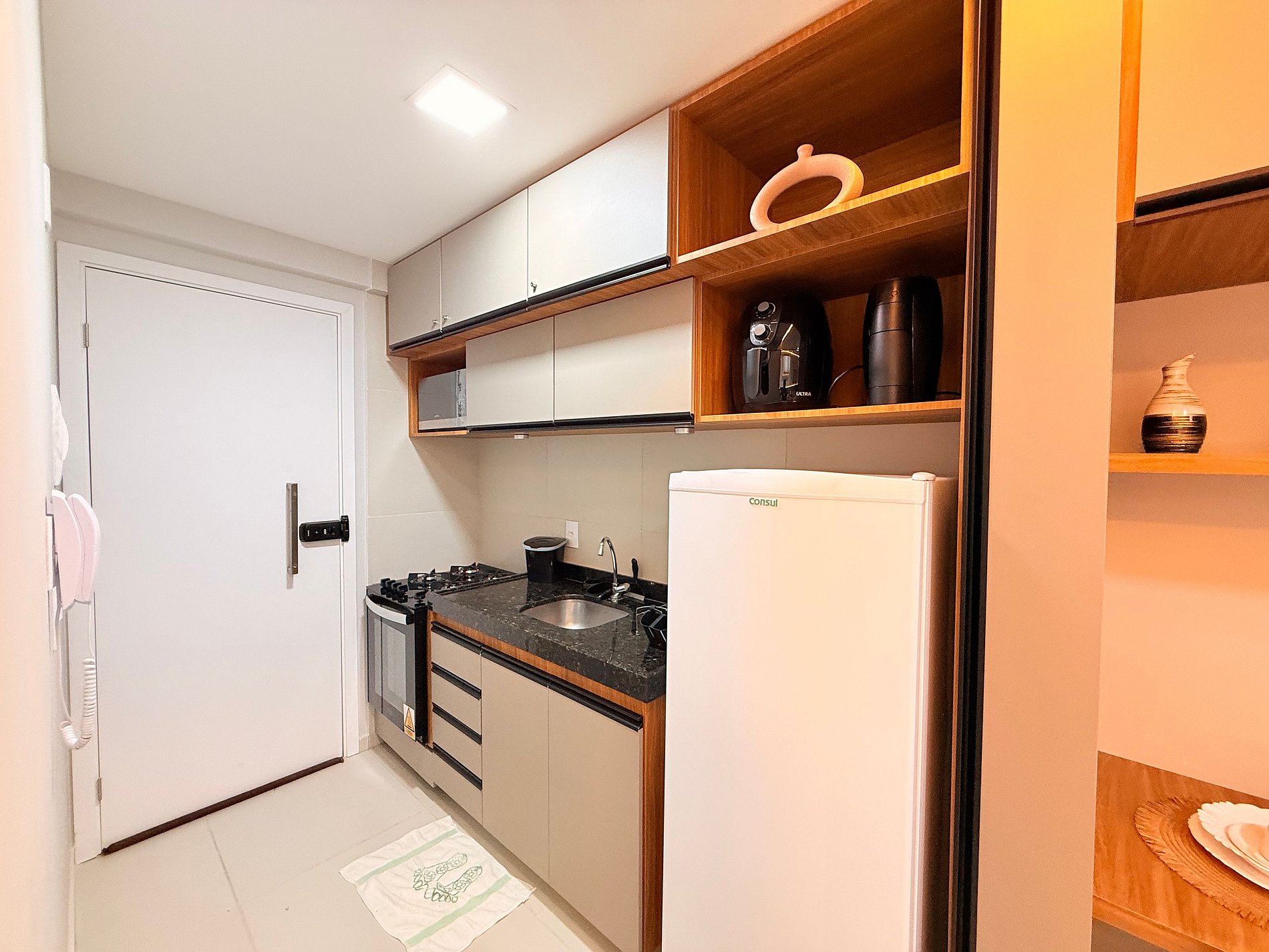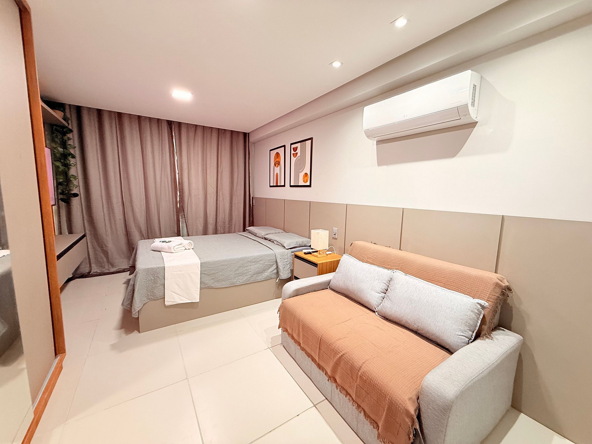 O interior do flat combina conforto e estilo em um ambiente integrado. Conta com uma cama de casal extremamente confortável, uma cama auxiliar e um sofá-cama, além de uma cozinha equipada com eletrodomésticos de alta qualidade, incluindo micro-ondas, geladeira, airfryer, sanduicheira, liquidificador, cafeteira e todos os utensílios (panelas, copos, taças, pratos e talheres) para realizar sua refeição.. O banheiro é moderno e funcional, com chuveiro quente e boa iluminação. O espaço também possui ar-condicionado, Wi-Fi e TV, garantindo comodidade para quem deseja relaxar e desfrutar do ambiente. O Flat também conta com uma varanda com vista para o mar — um convite diário para apreciar o nascer do sol, ouvir o som das ondas e relaxar com a brisa do oceano.