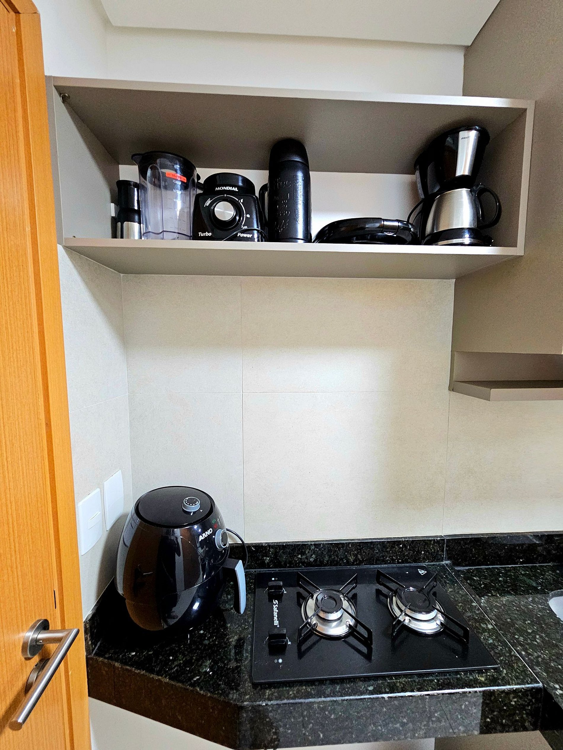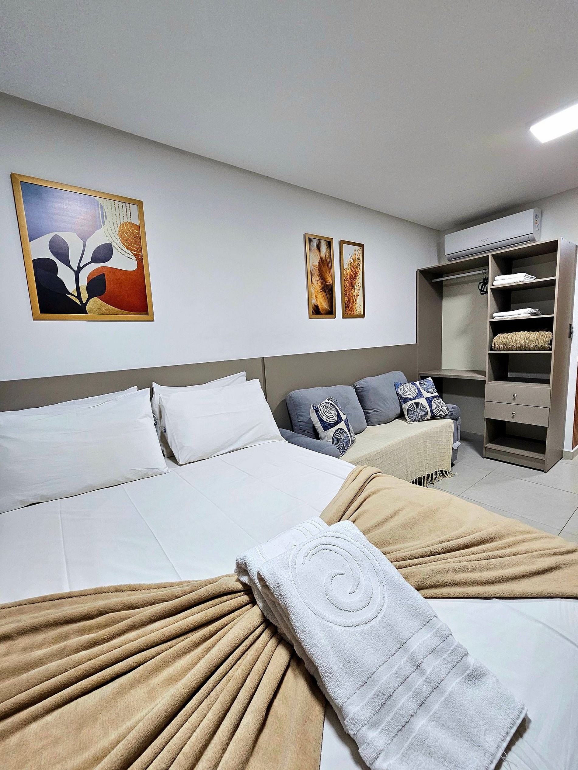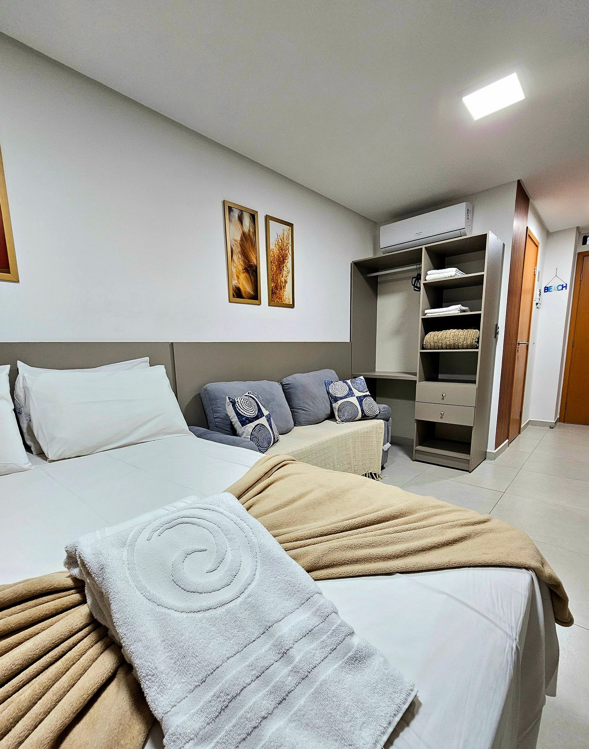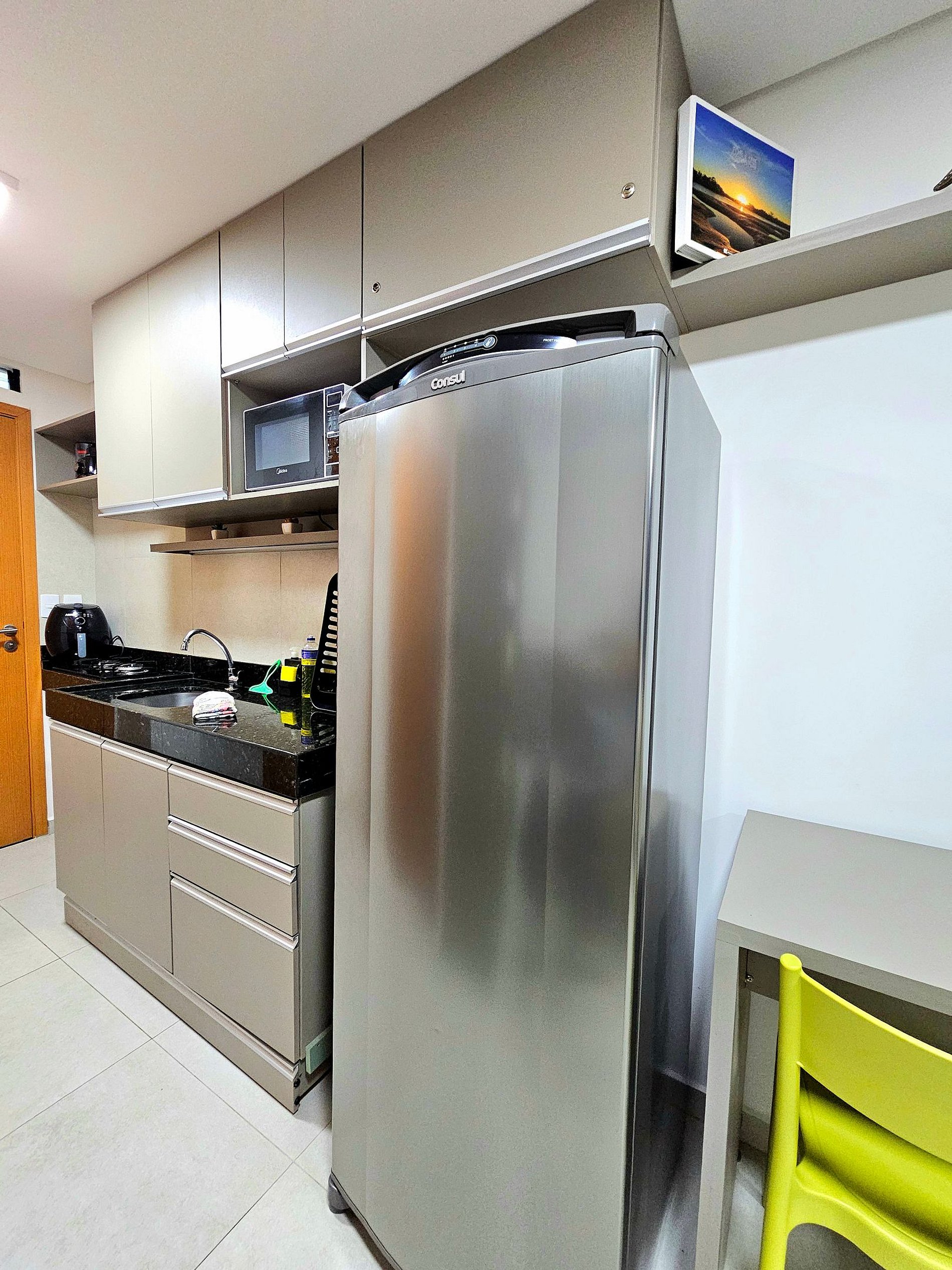 Nossa unidade possui 1 cama de casal e 1 sofá-cama, a cozinha possui os principais eletrodomésticos: Microondas, sanduicheira, liquidificador, cafeteira, geladeira, conjunto de panelas, ou seja, tudo o que é necessário para uma estadia com muito conforto e comodidade.