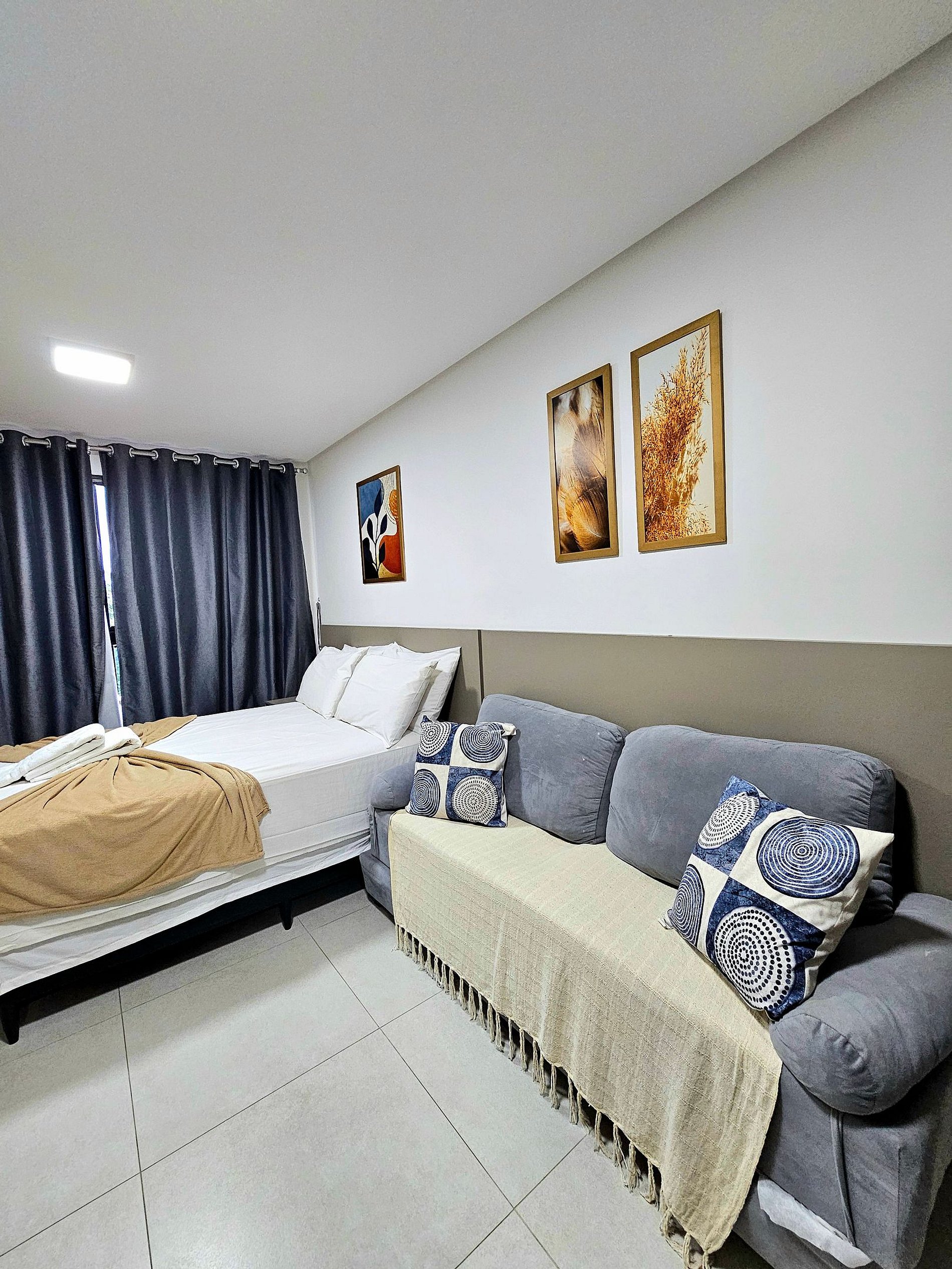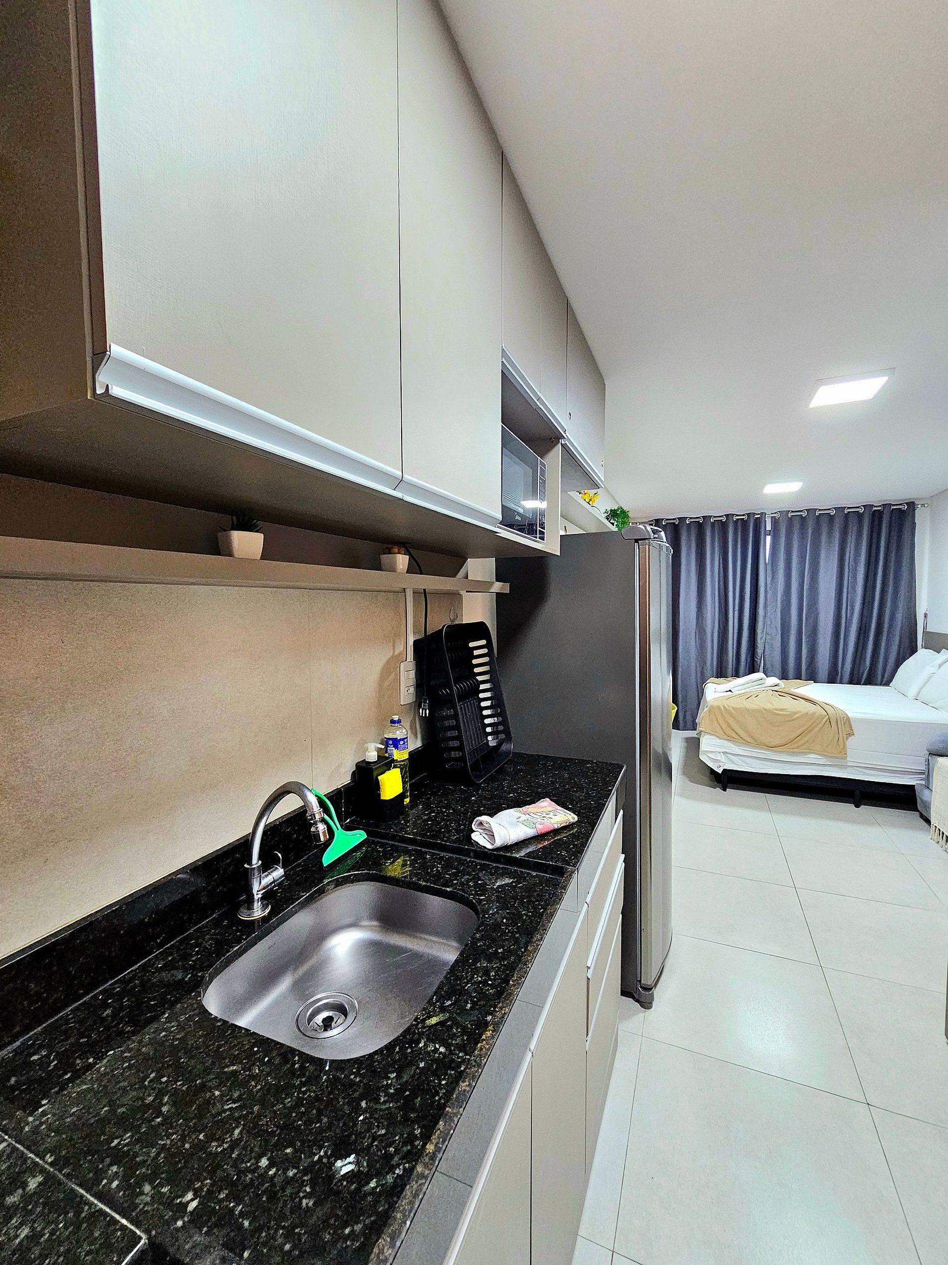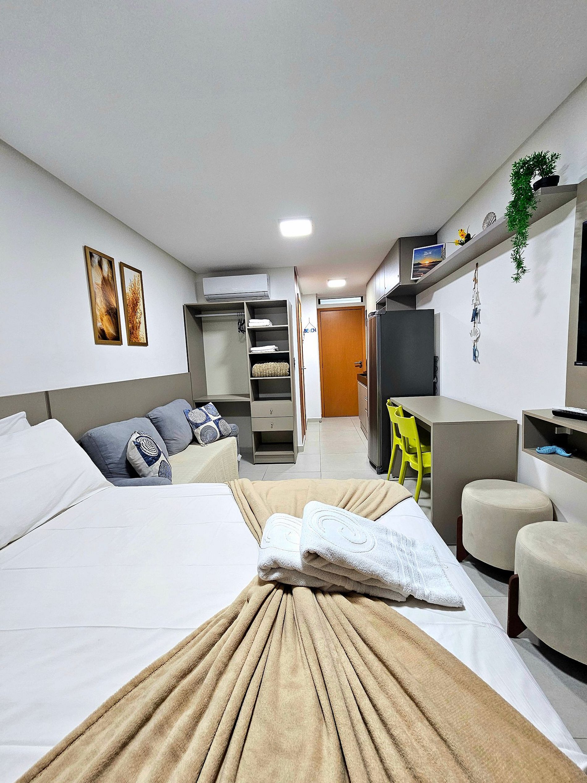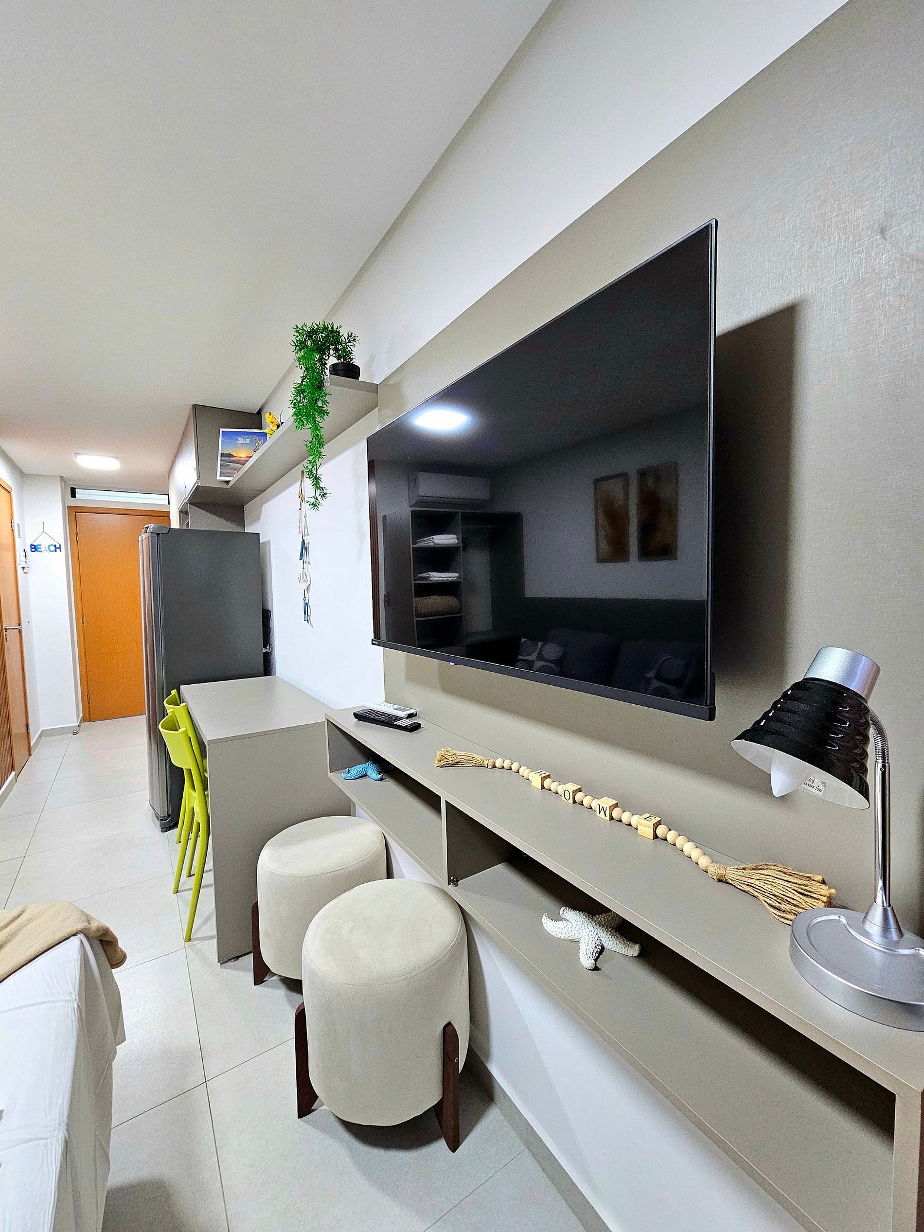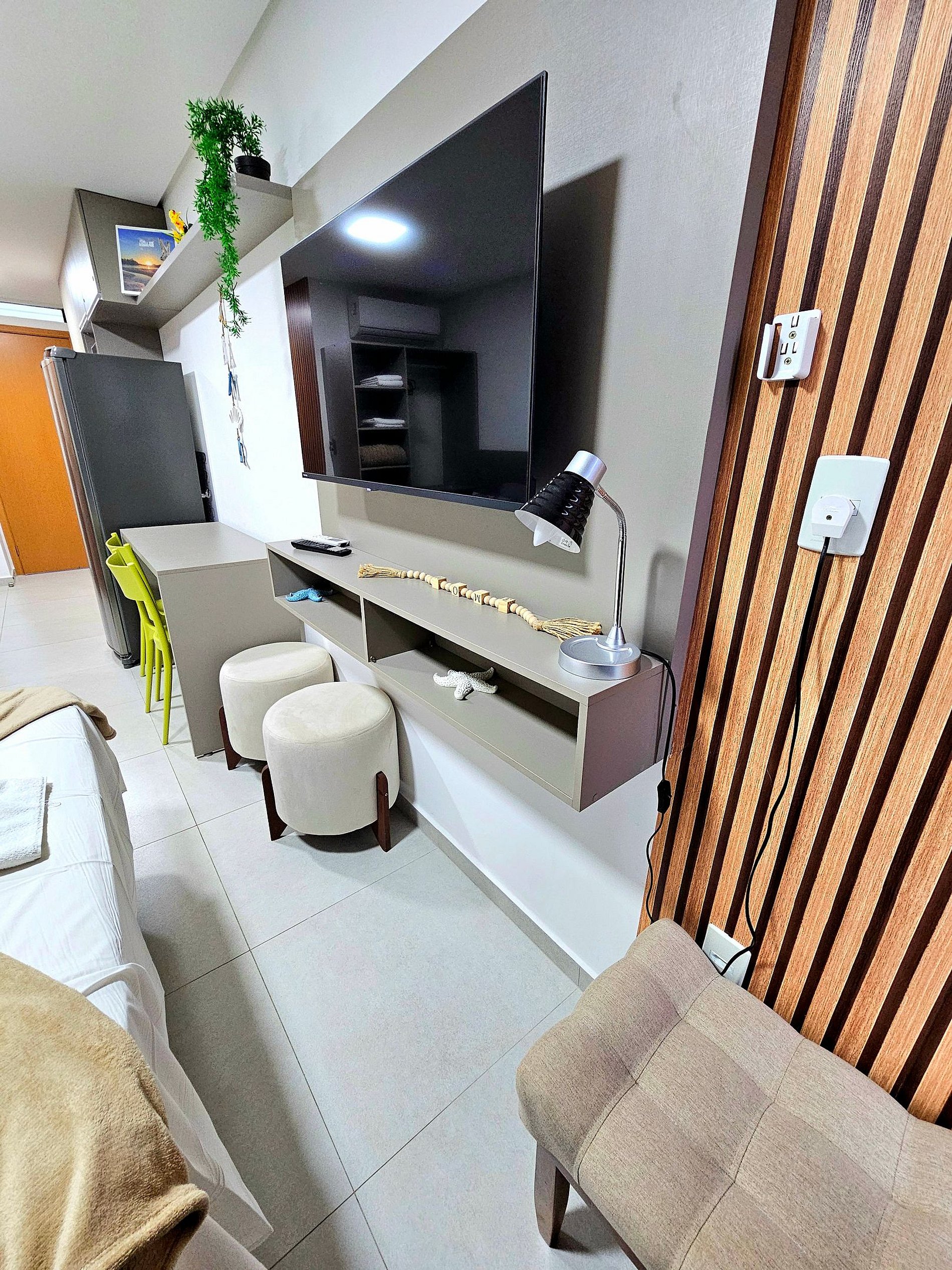 Lindo Flat Studio finamente decorado no centro de Porto de Galinhas. Cozinha completa e equipada, acomoda bem até 3 pessoas, possui ar-condicionado, projeto de mobilias e decoração diferenciados para proporcionar o máximo de conforto. Ideal para aproveitar Porto sem depender de carro!