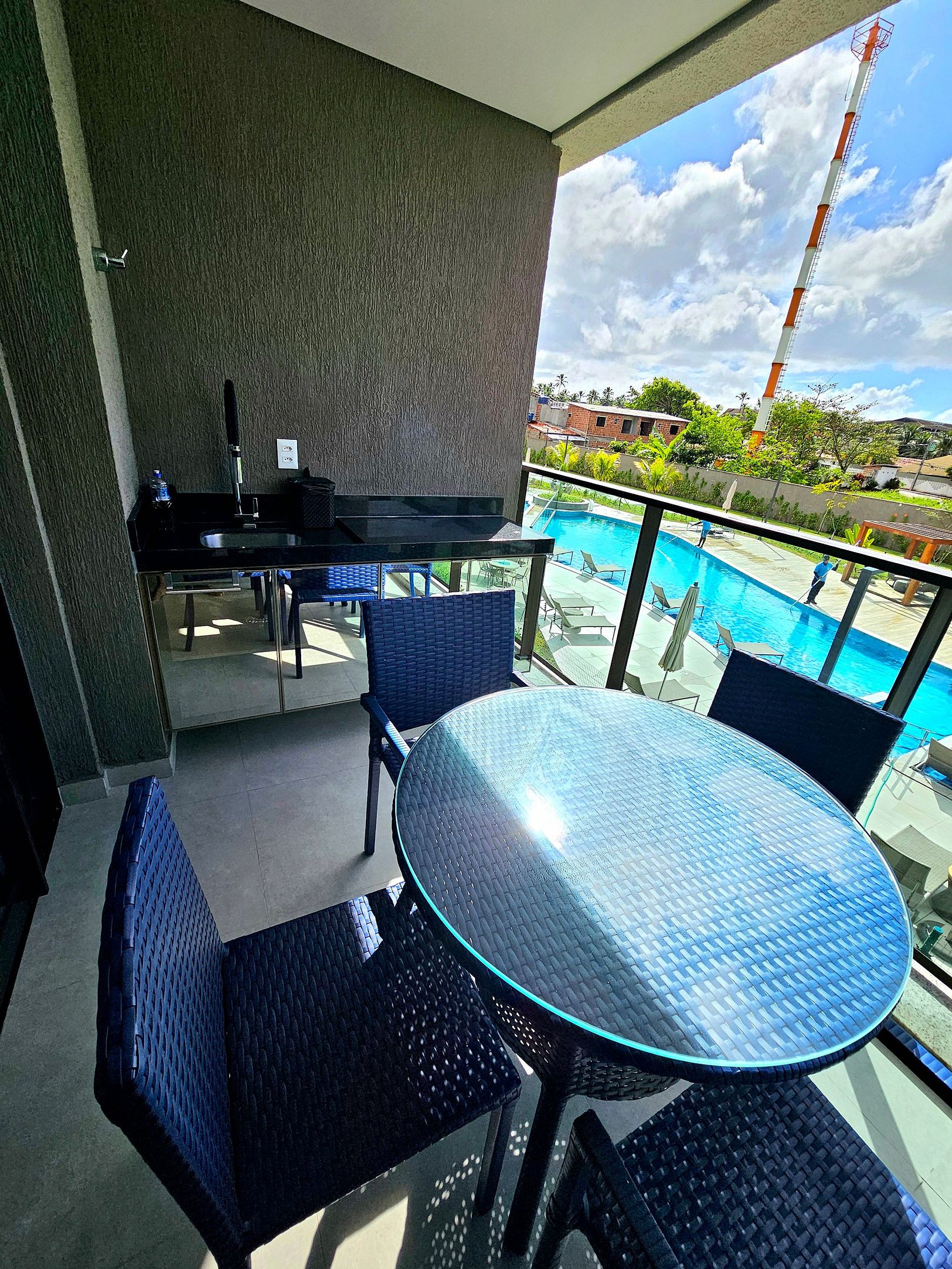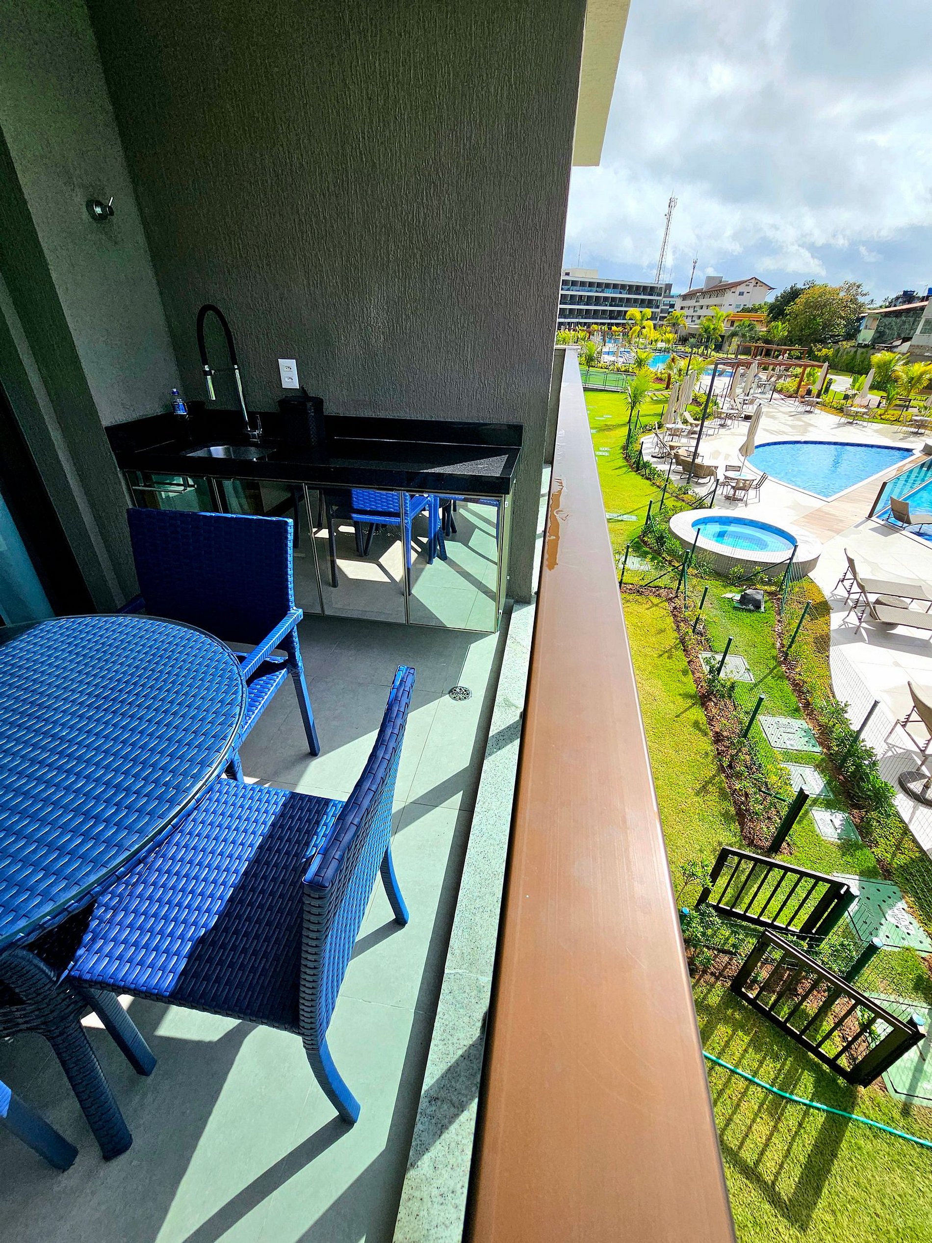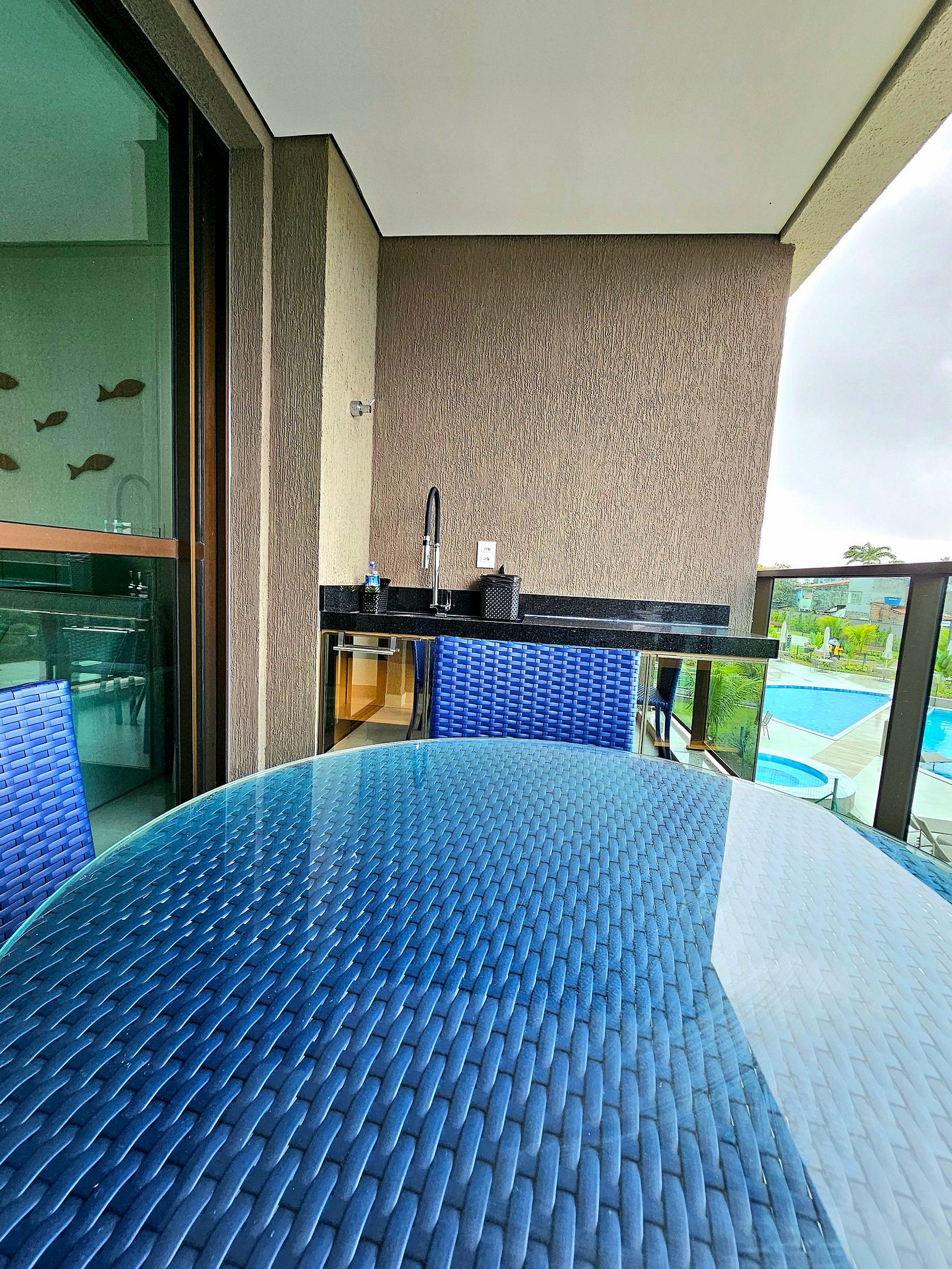 A Cereja do Bolo é nossa varanda gourmet com uma ótima mesa para refeições e vista para o complexo aquático do empreendimento.