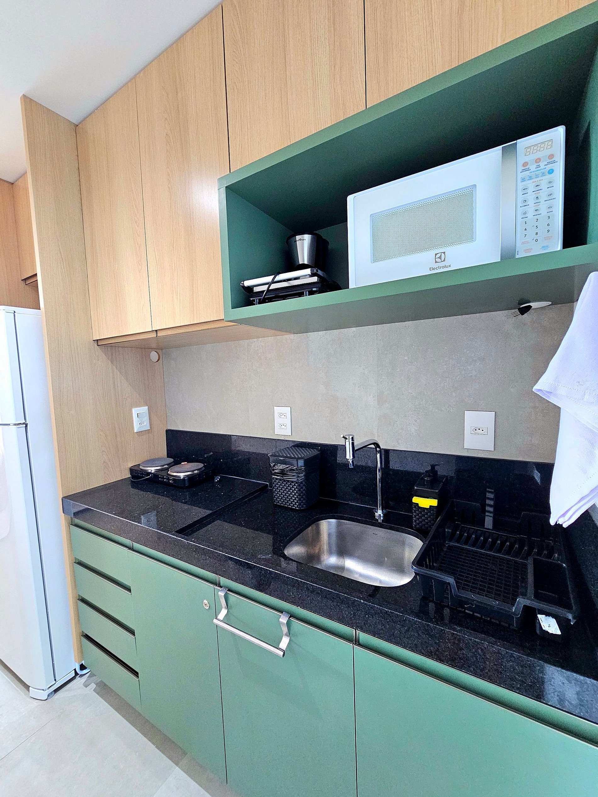 A cozinha completa é equipada com os principais eletrodomésticos, como geladeira, microondas, cooktop eletrico, cafeteira, liquidificador, sanduicheira e airfryer, além de todos os utensílios necessários para que você possa preparar suas refeições de maneira prática e confortável.
