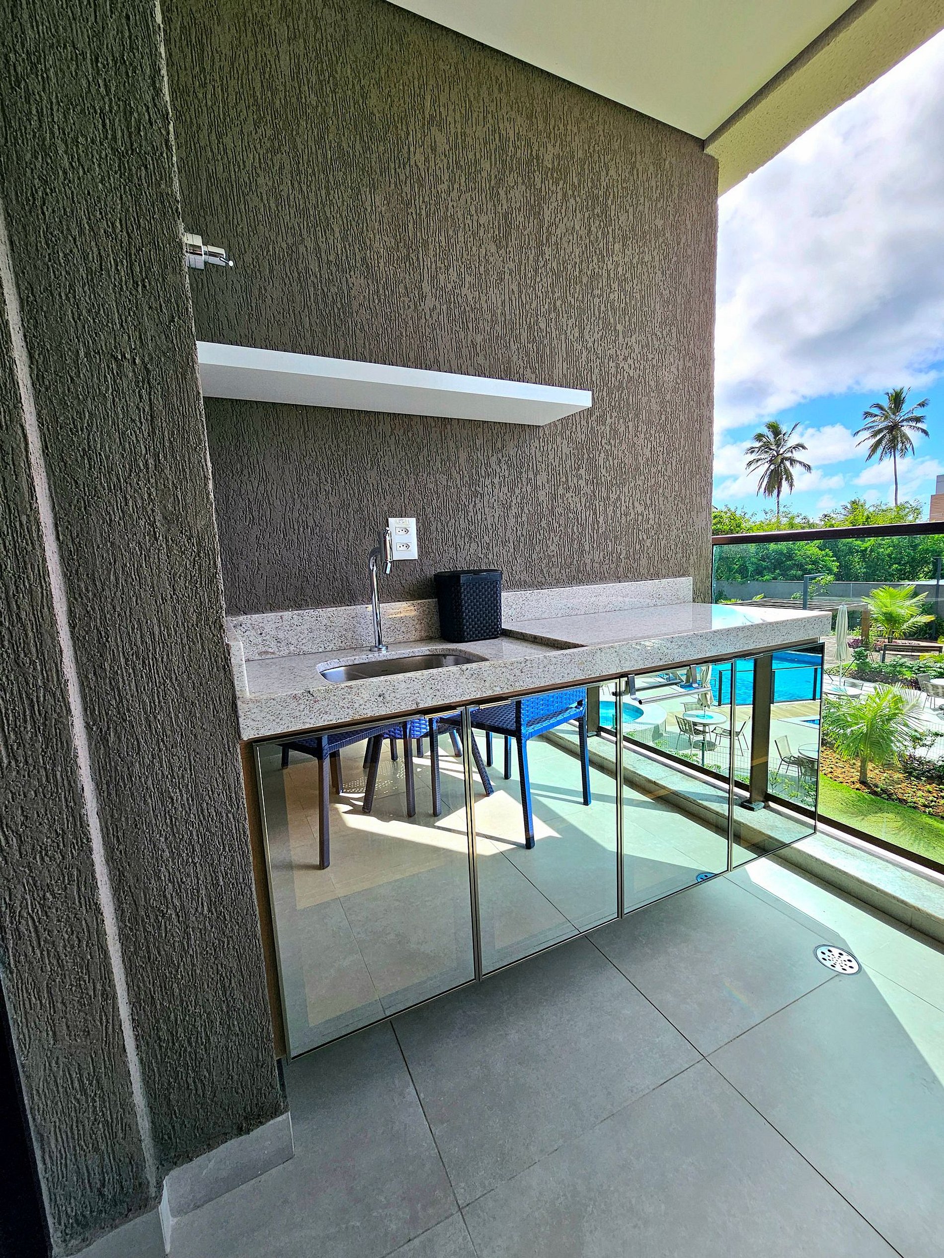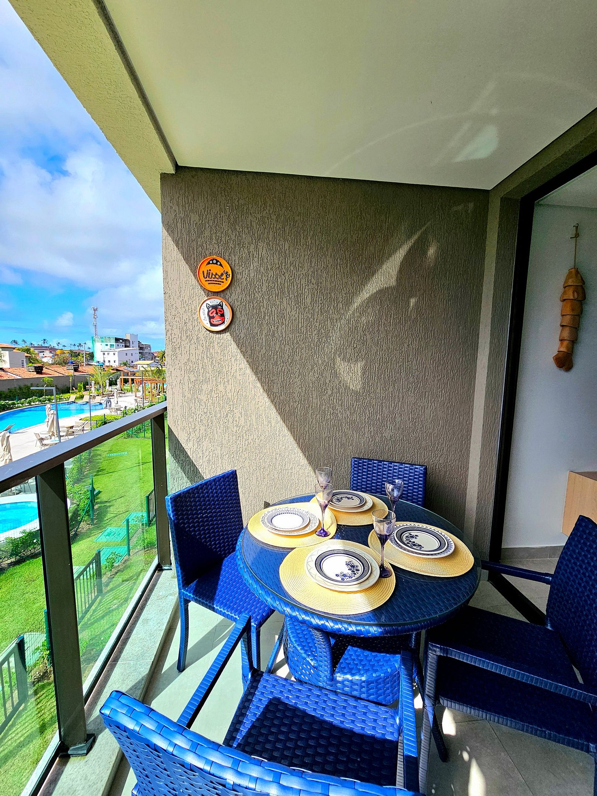 A Cereja do Bolo é nossa varanda gourmet com uma ótima mesa para refeições e vista para o complexo aquático do empreendimento.