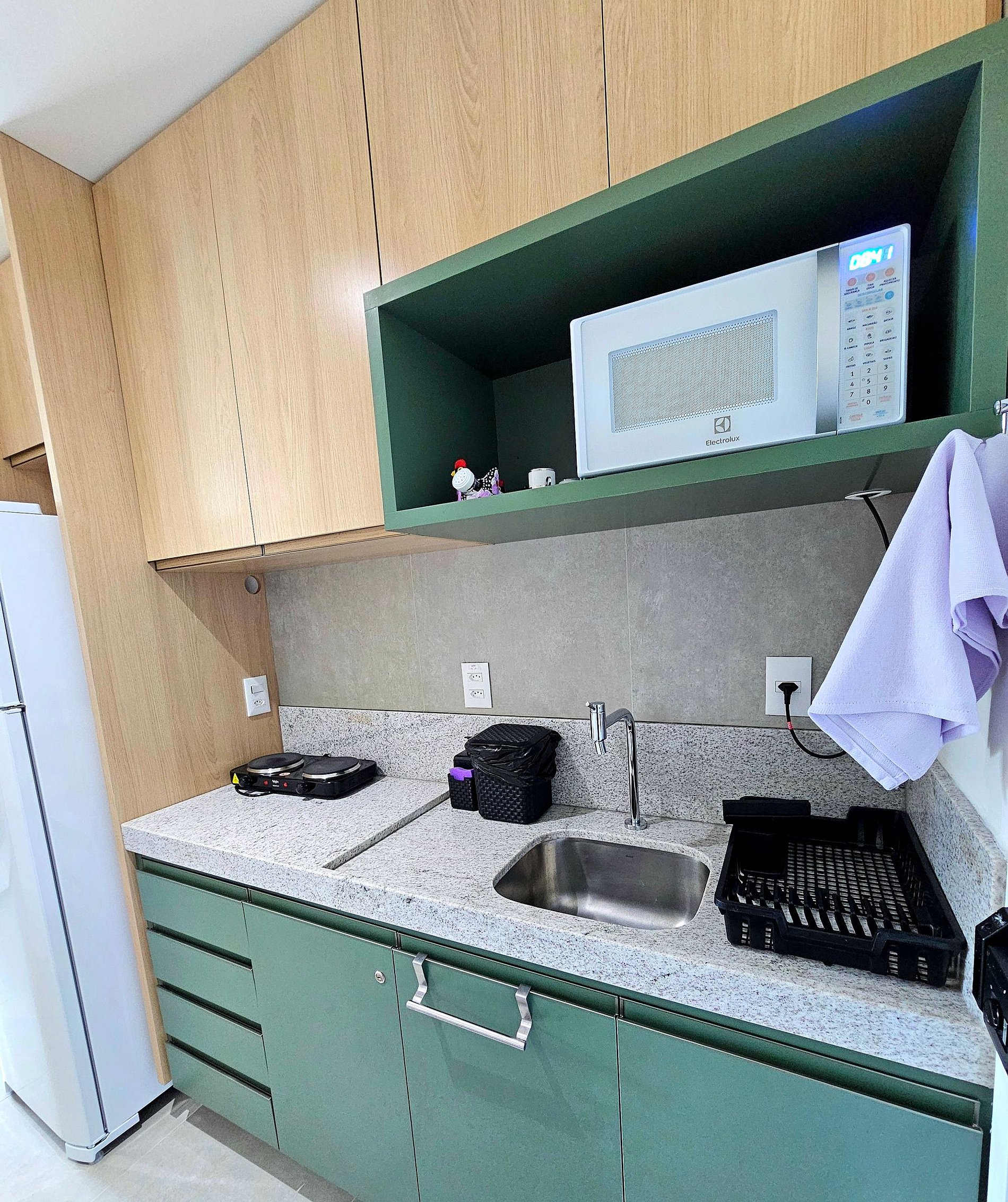 A cozinha completa é equipada com os principais eletrodomésticos, como geladeira, microondas, cooktop eletrico, cafeteira, liquidificador, sanduicheira e airfryer, além de todos os utensílios necessários para que você possa preparar suas refeições de maneira prática e confortável.
