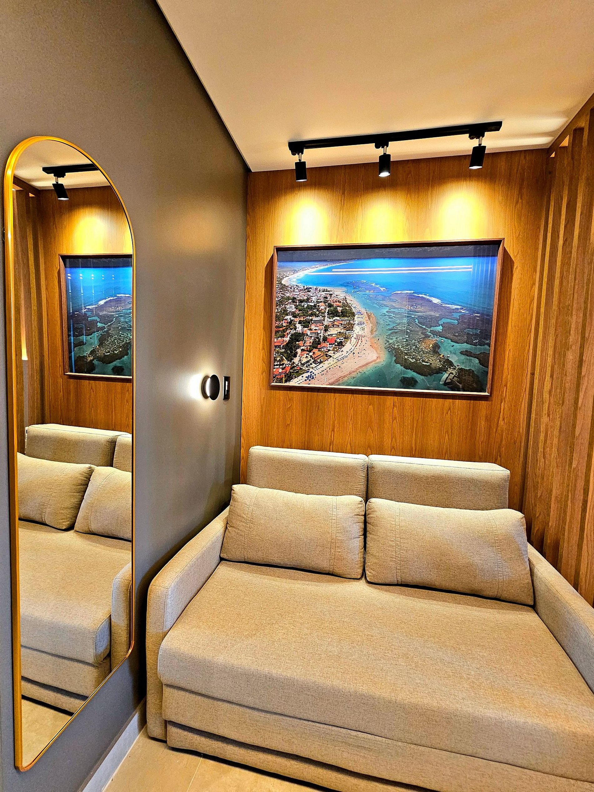 O Flat possui uma decoração sofisticada que proporciona um ambiente relaxante após um dia de passeios em Porto de Galinhas e Muro Alto.