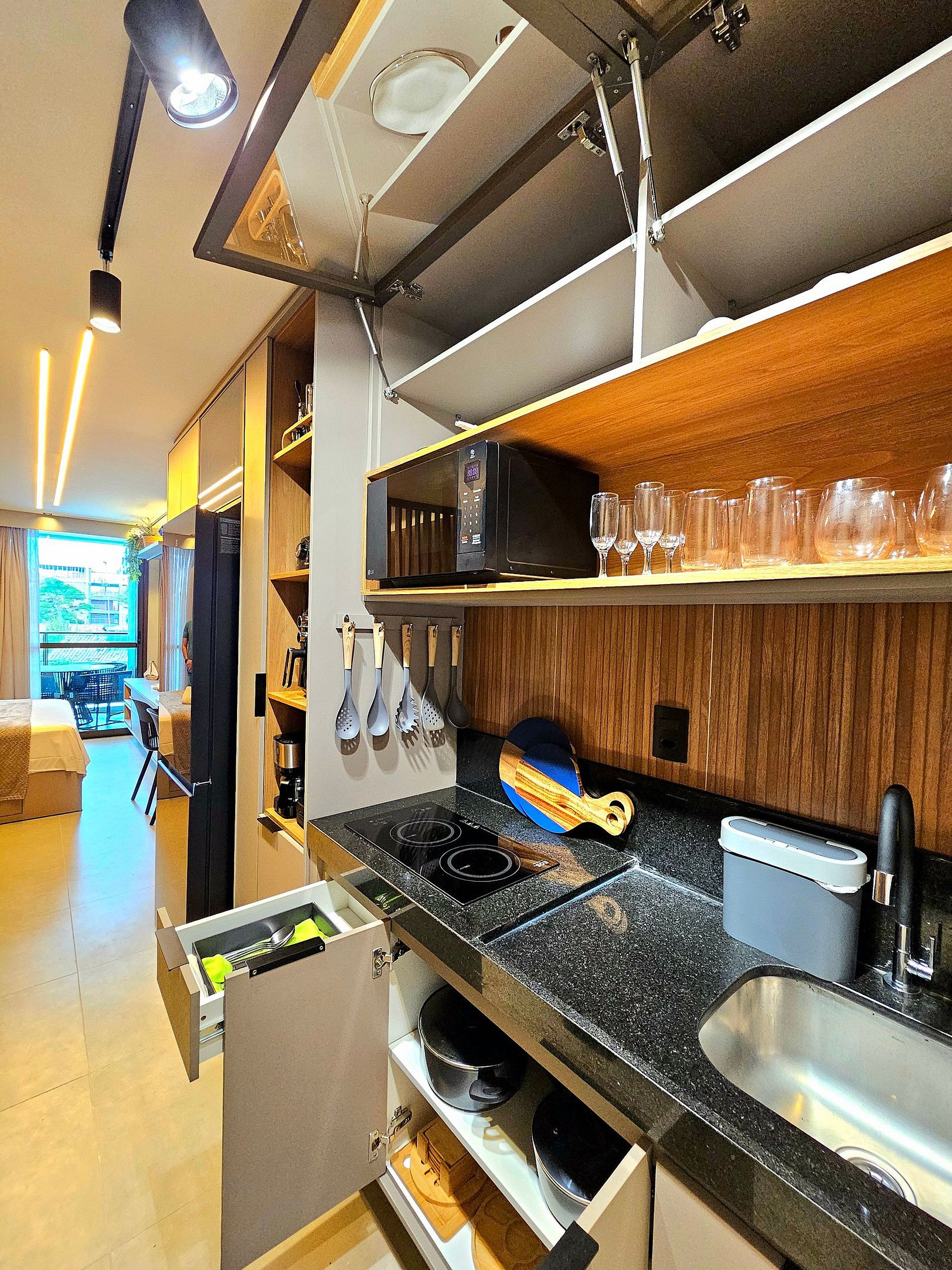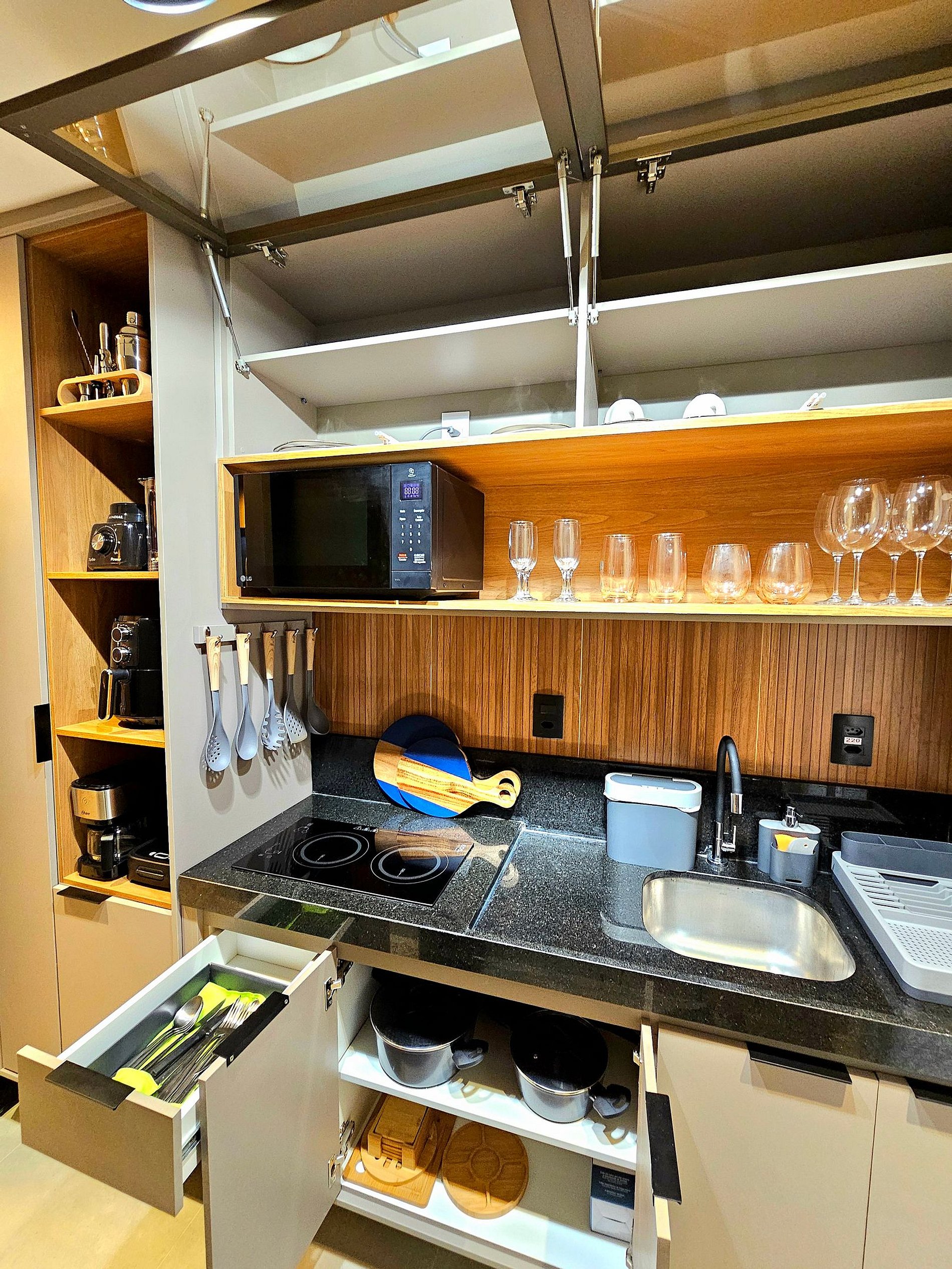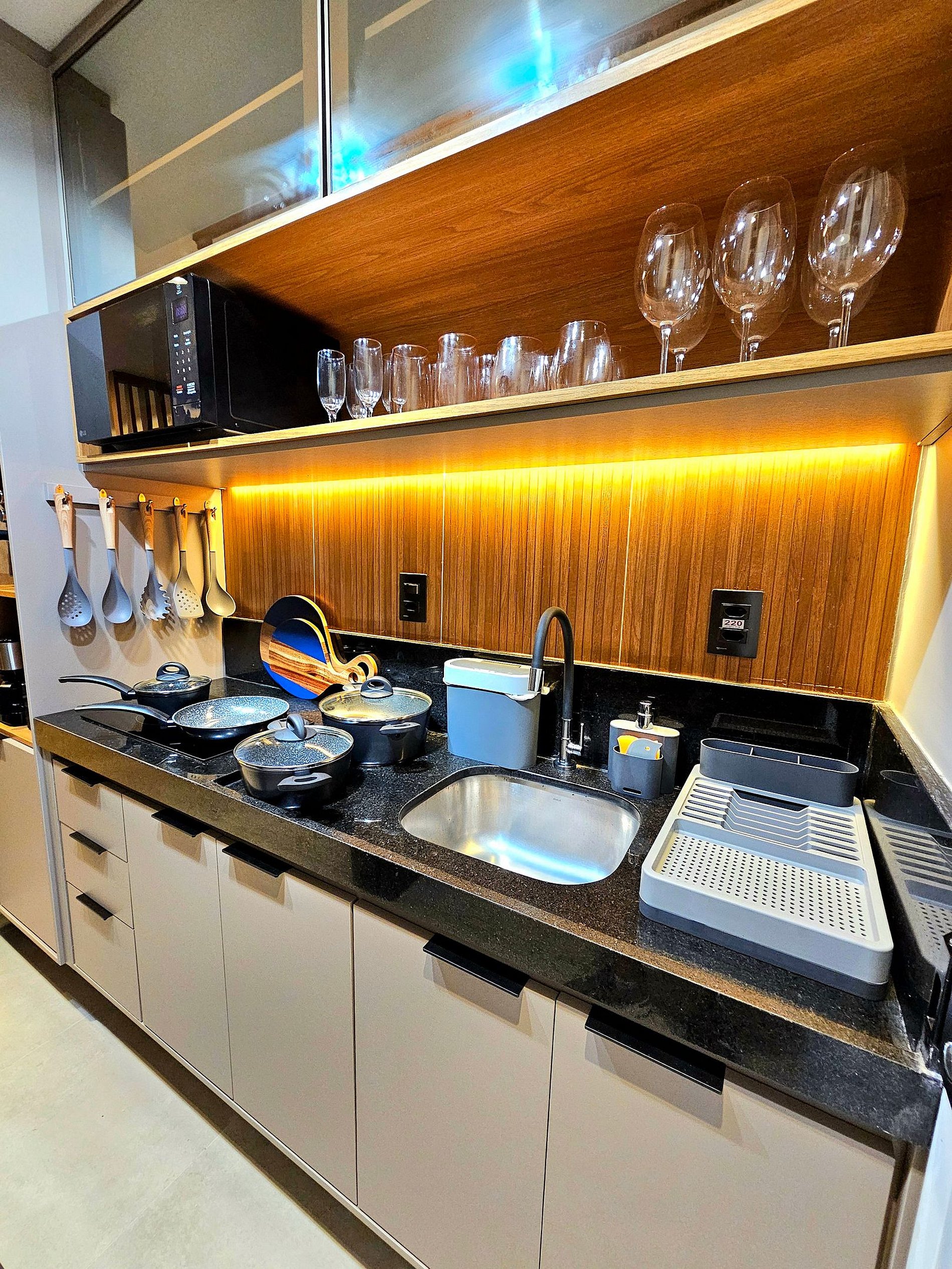 A cozinha completa é equipada com os principais eletrodomésticos, como geladeira duplex, microondas, cooktop, cafeteira, liquidificador, sanduicheira e airfryer, além de todos os utensílios necessários para que você possa preparar suas refeições de maneira prática e confortável.