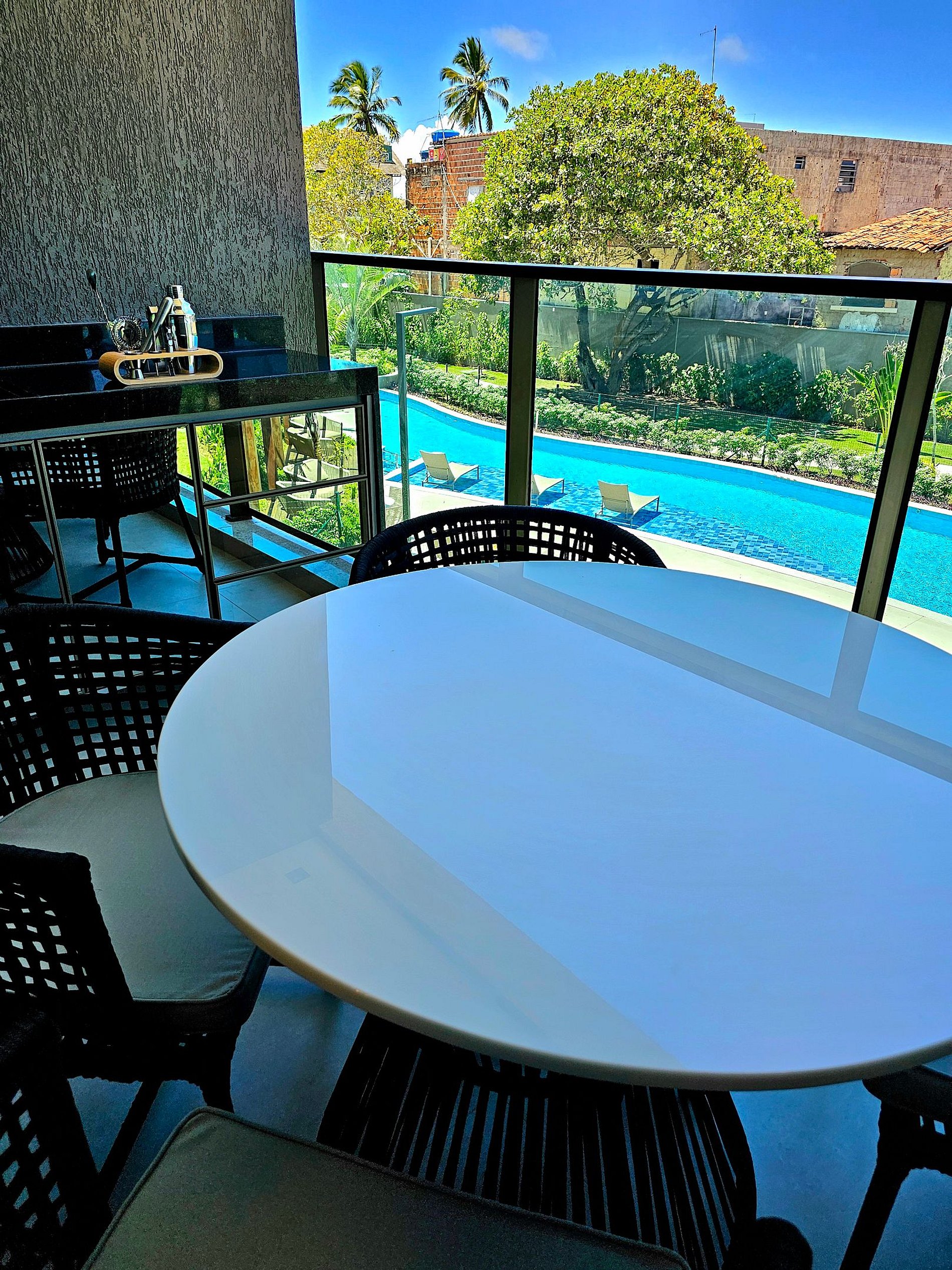 A Cereja do Bolo é nossa varanda gourmet com uma ótima mesa, confortável e moderna para refeições e vista para o complexo aquático do empreendimento.