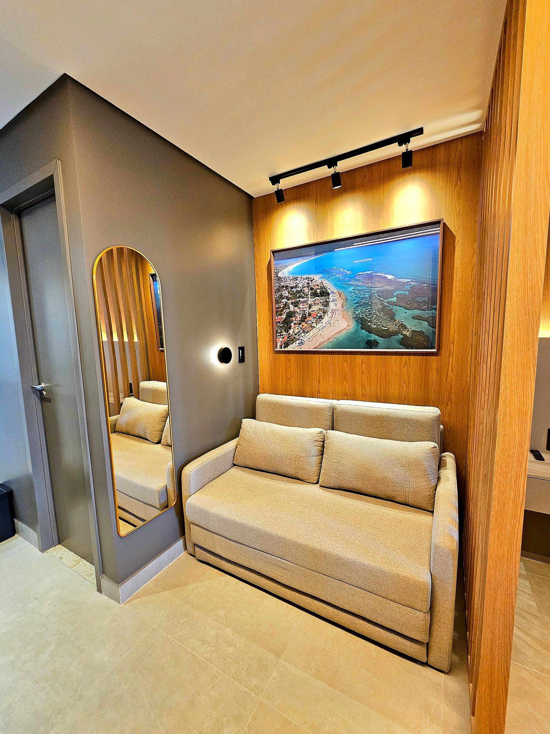 O Flat possui uma decoração sofisticada que proporciona um ambiente relaxante após um dia de passeios em Porto de Galinhas e Muro Alto.