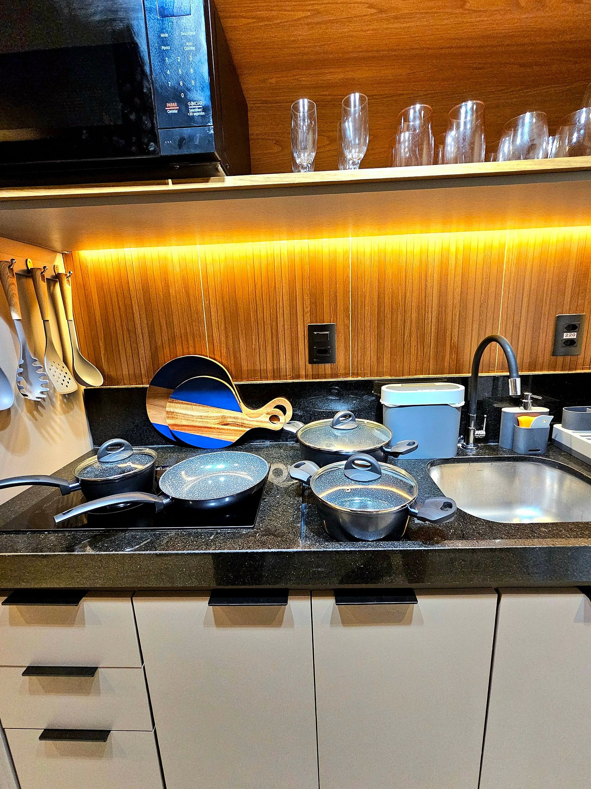 A cozinha completa é equipada com os principais eletrodomésticos, como geladeira duplex, microondas, cooktop, cafeteira, liquidificador, sanduicheira e airfryer, além de todos os utensílios necessários para que você possa preparar suas refeições de maneira prática e confortável.