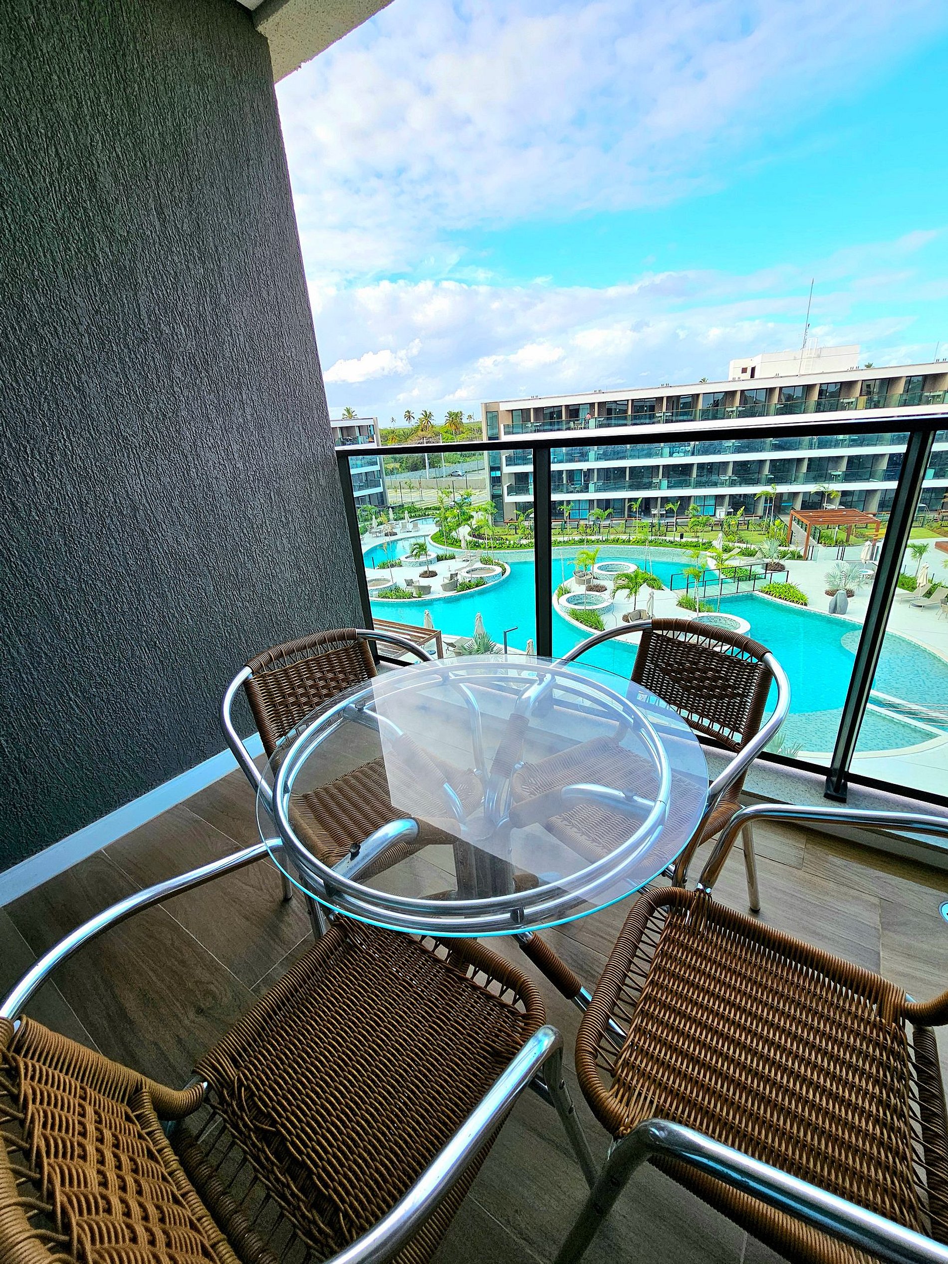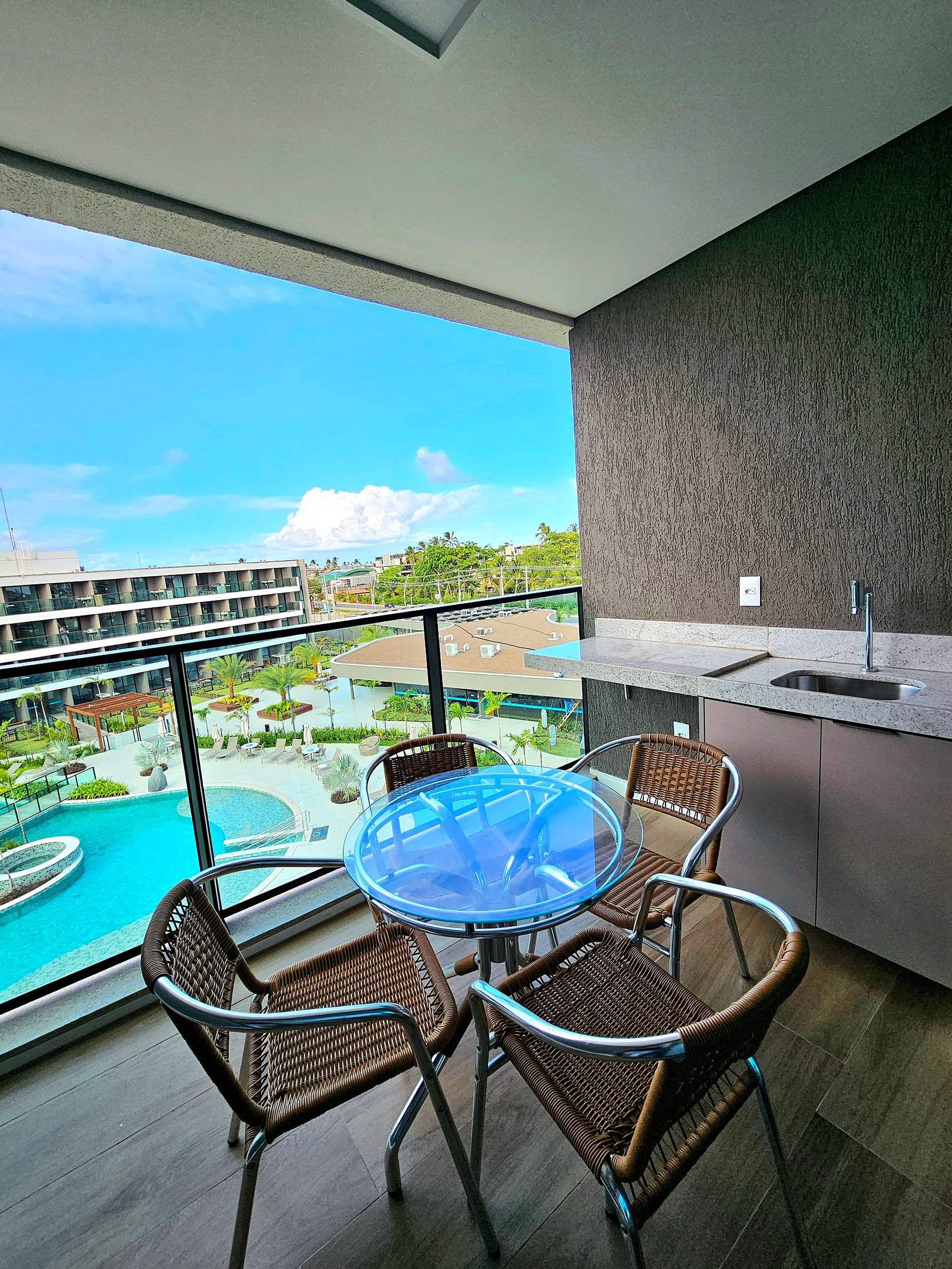 A Cereja do Bolo é nossa varanda gourmet com uma ótima mesa para refeições e vista para o complexo aquático do empreendimento.