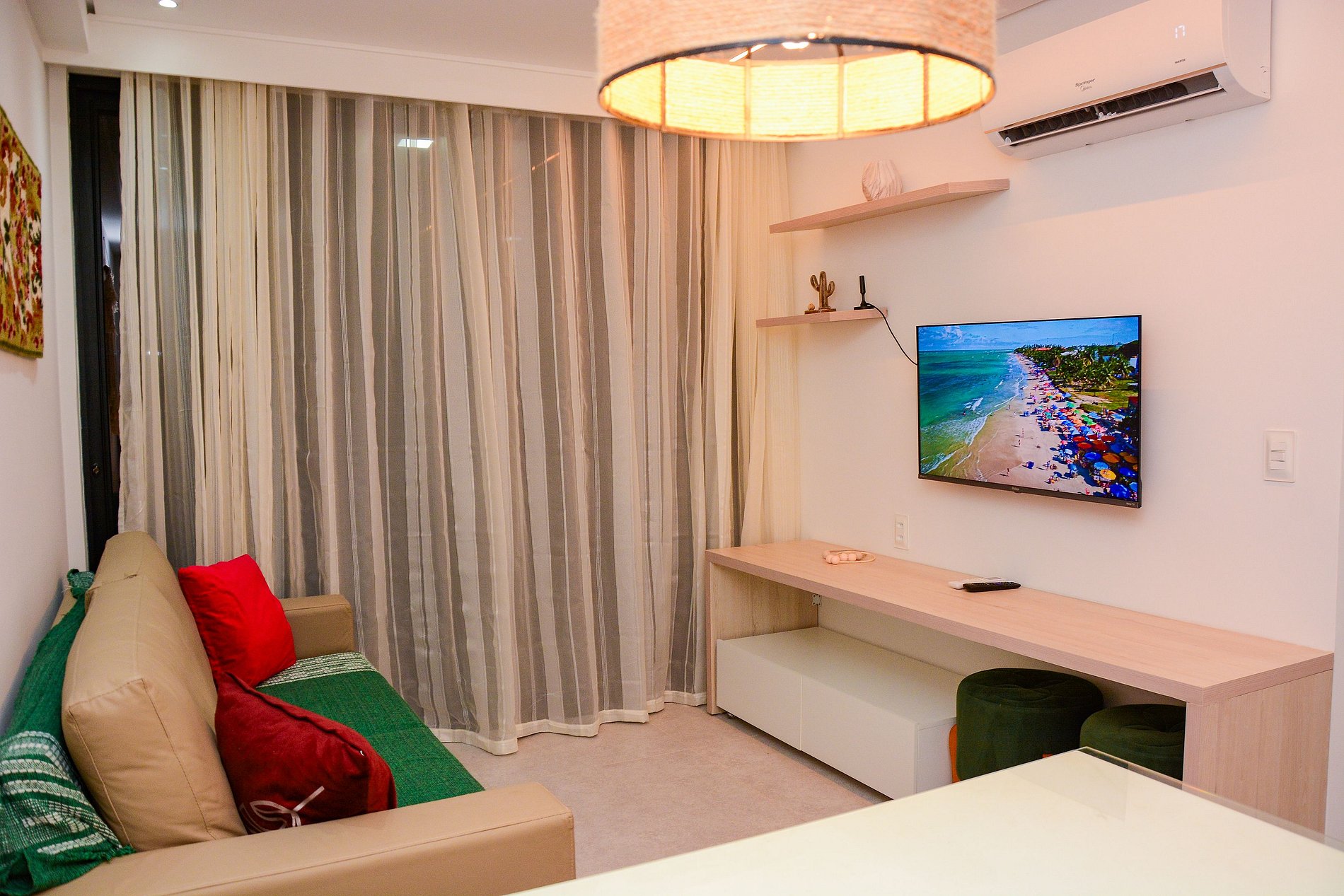 Nosso espaço é novo e totalmente equipado, acomoda bem até 4 pessoas com uma cama de casal confortável e auxiliar além de um colchão extra de casal. O flat é amplo com quarto separado da sala e uma linda varanda para seu conforto após o dia de praia.