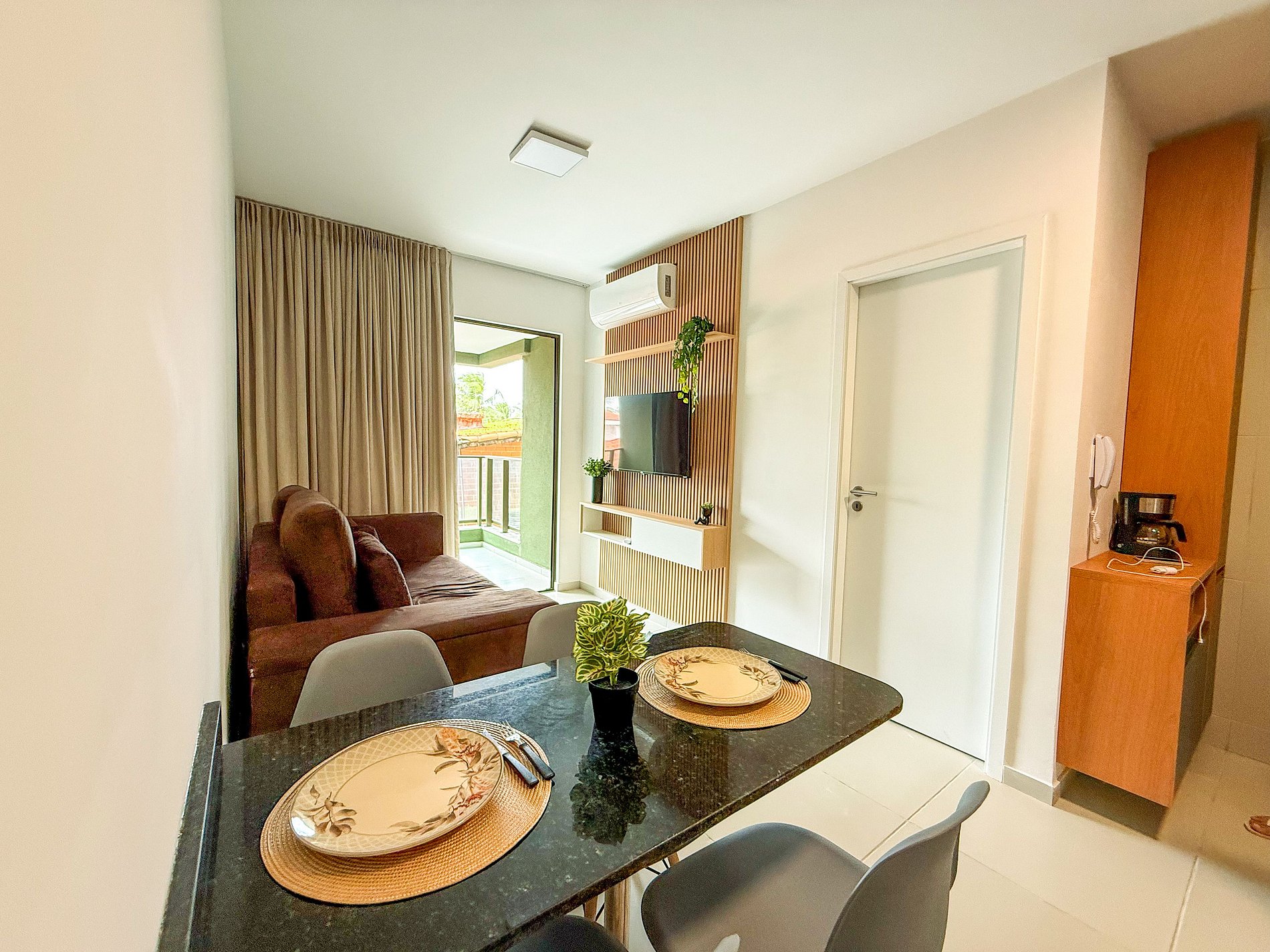 A acomodação é ideal para casal, família, amigos ou até mesmo quem viaja sozinho em busca de descanso e contato com a natureza. O flat (sala e quarto separado) acomoda bem até 5 pessoas e foi planejado para oferecer praticidade e aconchego: conta com cama de casal confortável, 1 cama auxiliar, sofá-cama, 2 ar-condicionados, 2 TV's, Wi-Fi e uma cozinha equipada com os itens essenciais para preparar suas refeições — incluindo cooktop, geladeira, micro-ondas, sanduicheira, cafeteira e utensílios básicos.
