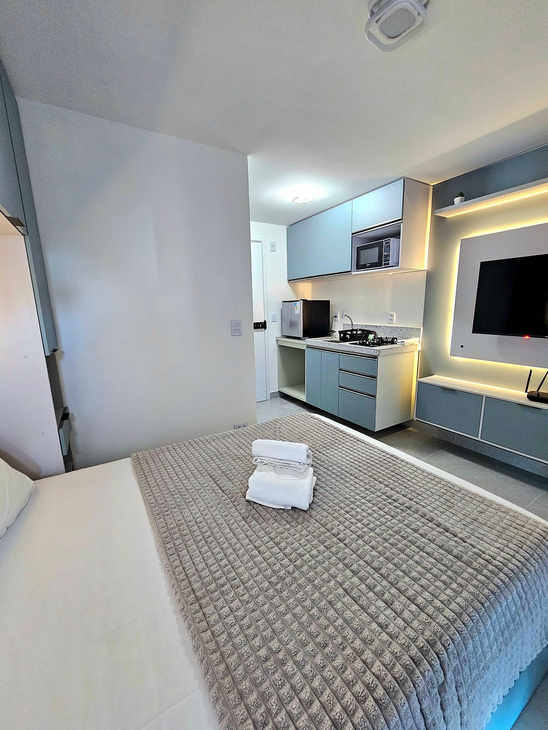 Perfeito para famílias pequenas, casais ou amigos, o ambiente foi pensado para acomodar até 3 hóspedes com total conforto. Decoração Moderna e Iluminação Planejada: A decoração do apartamento segue um estilo moderno e elegante, com detalhes em cores neutras e iluminação indireta que criam uma atmosfera aconchegante e sofisticada. As luzes estrategicamente posicionadas proporcionam um ambiente acolhedor, ideal tanto para momentos de relaxamento quanto para criar um clima especial durante suas noites no Ocean Blue.