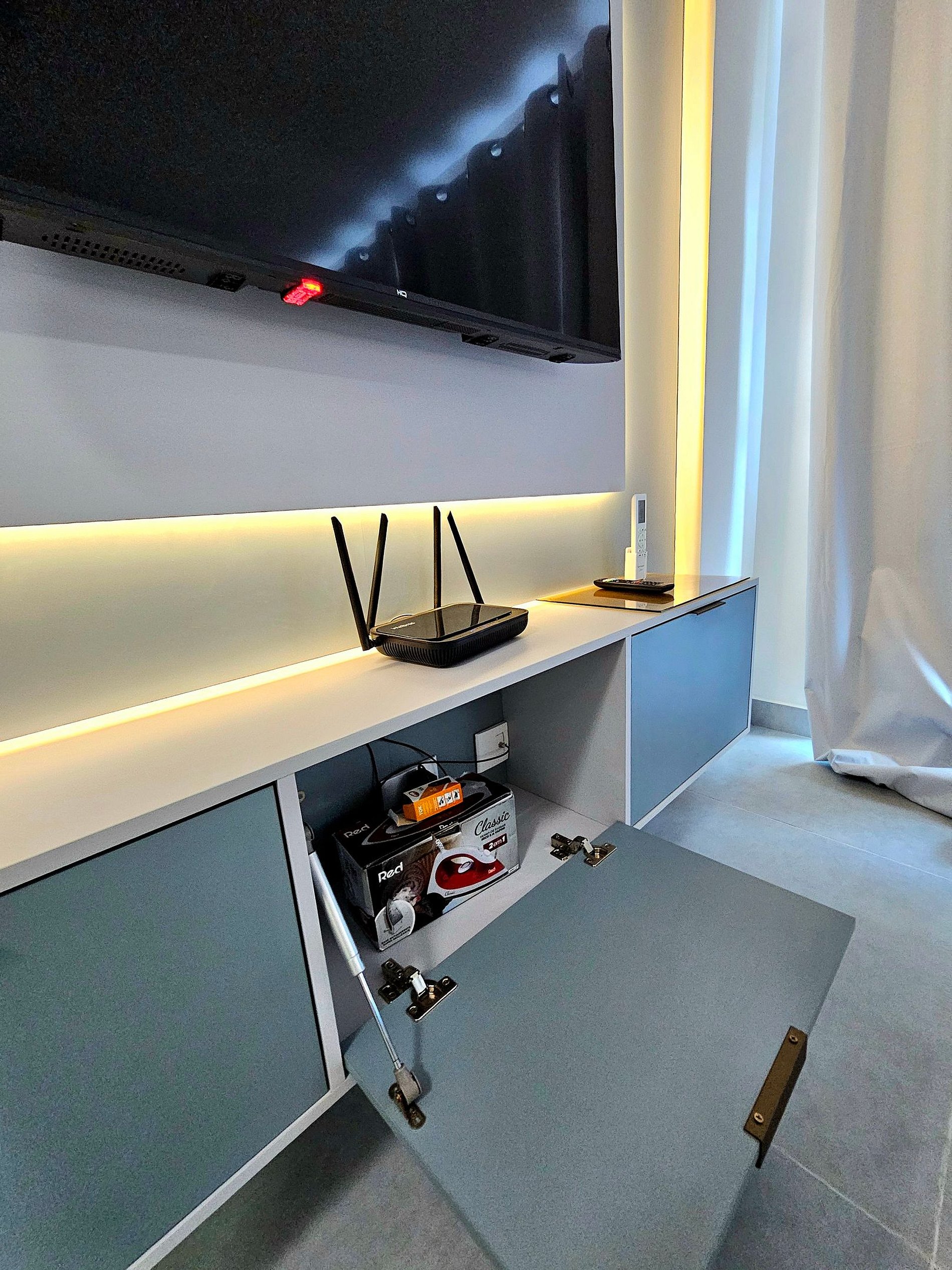 Perfeito para famílias pequenas, casais ou amigos, o ambiente foi pensado para acomodar até 3 hóspedes com total conforto. Decoração Moderna e Iluminação Planejada: A decoração do apartamento segue um estilo moderno e elegante, com detalhes em cores neutras e iluminação indireta que criam uma atmosfera aconchegante e sofisticada. As luzes estrategicamente posicionadas proporcionam um ambiente acolhedor, ideal tanto para momentos de relaxamento quanto para criar um clima especial durante suas noites no Ocean Blue.