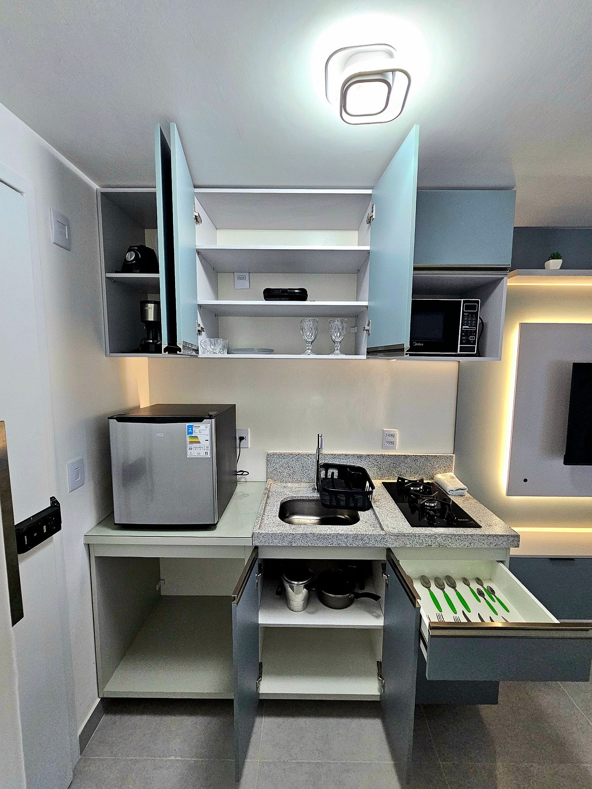 A cozinha é totalmente equipada com eletrodomésticos de ponta, incluindo uma sanduicheira, cafeteira, microondas e liquidificador, garantindo que você tenha tudo o que precisa para preparar suas refeições com praticidade.